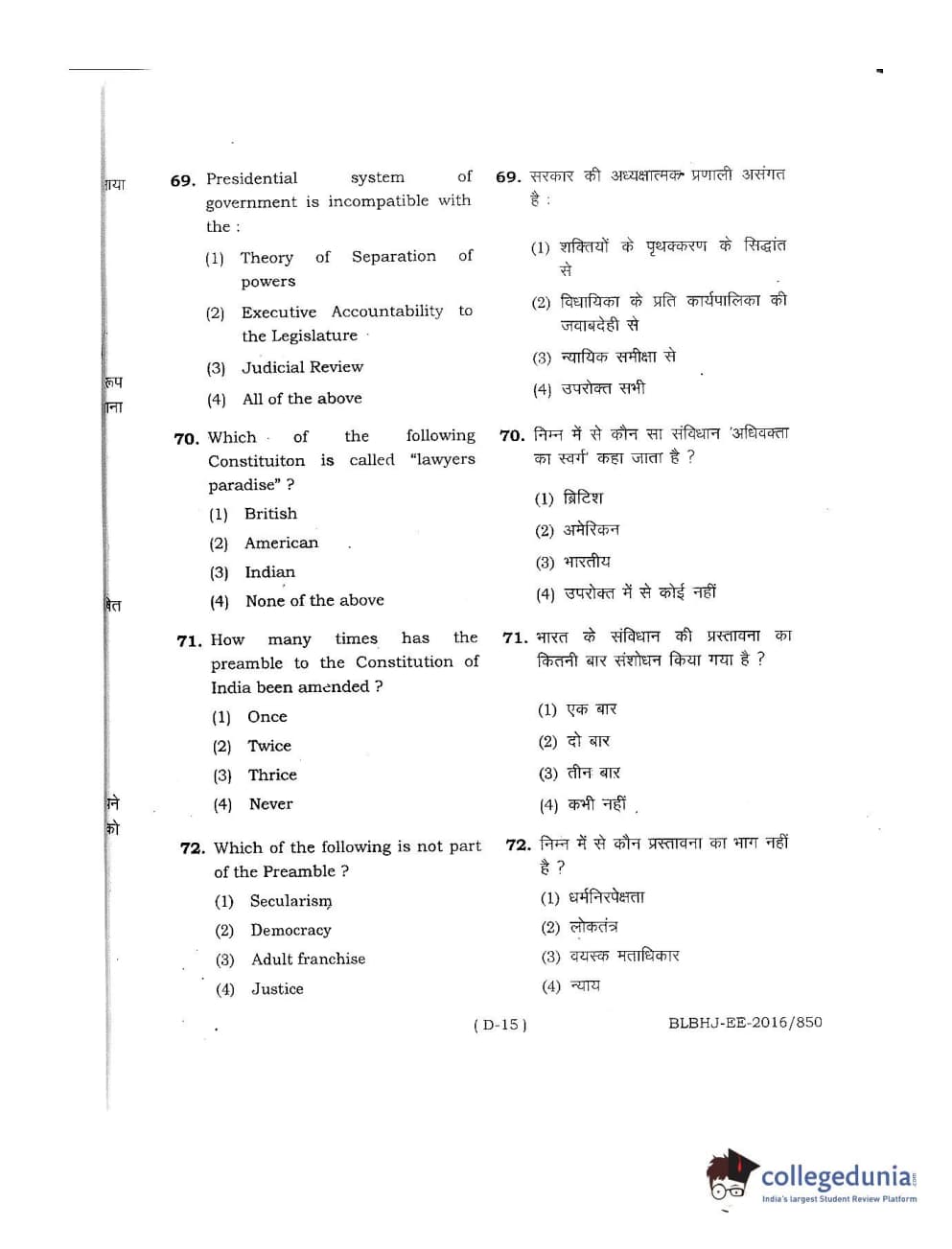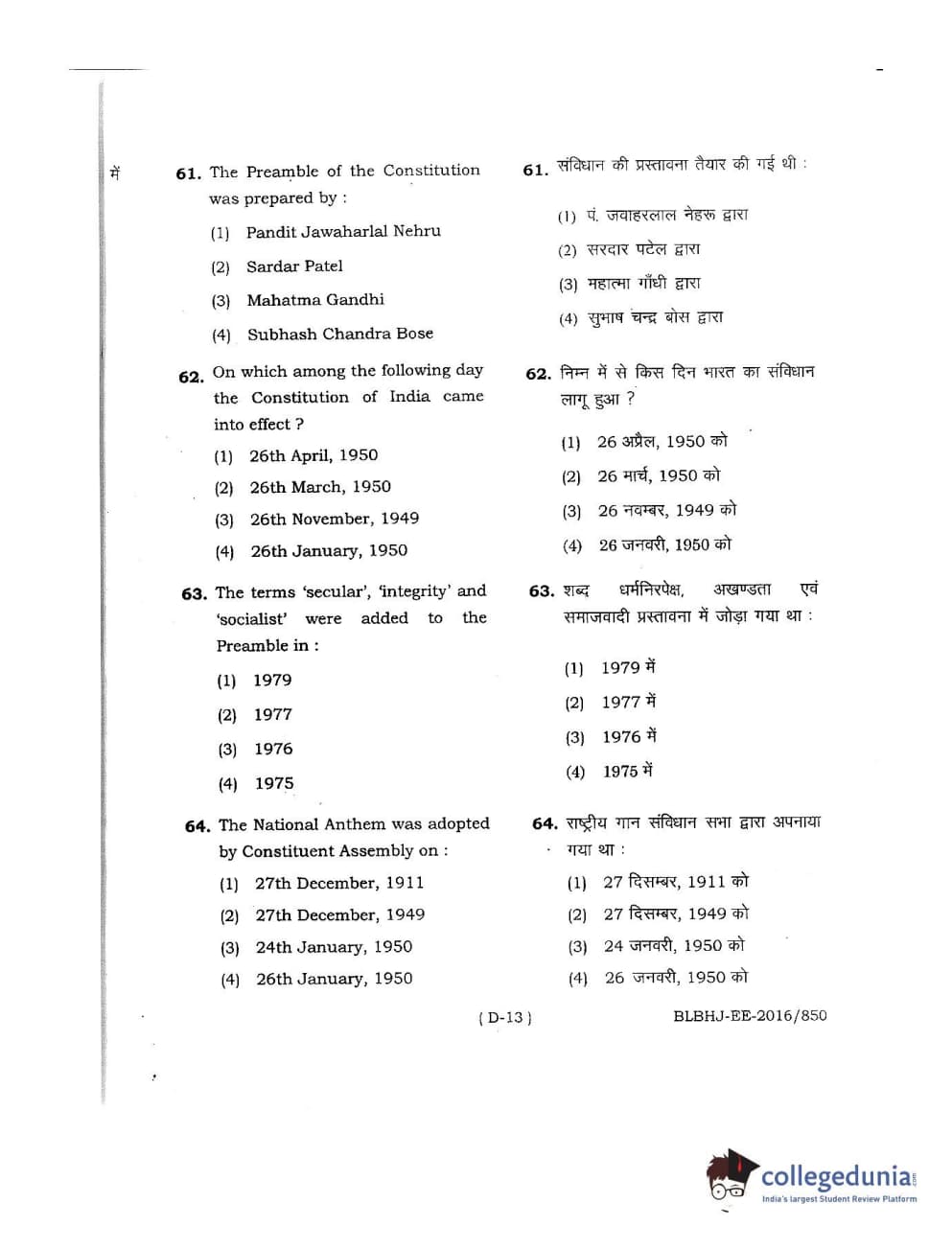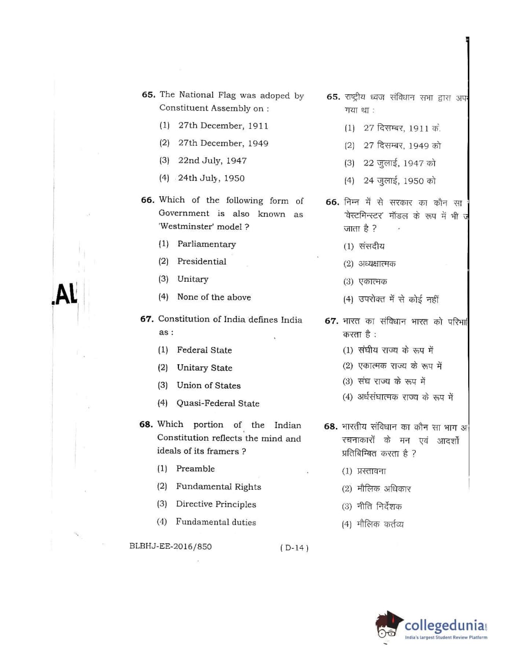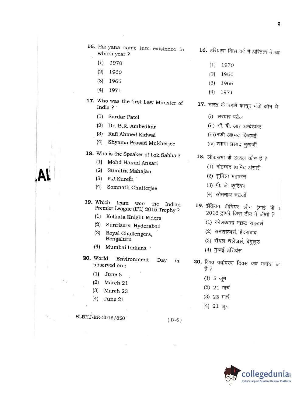 MDUCEE 2016 LL.B. (Hons) 5 Year Integrated Set D Question Paper with Answer Key PDFs