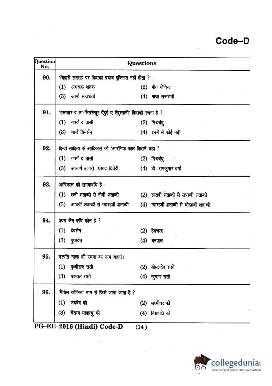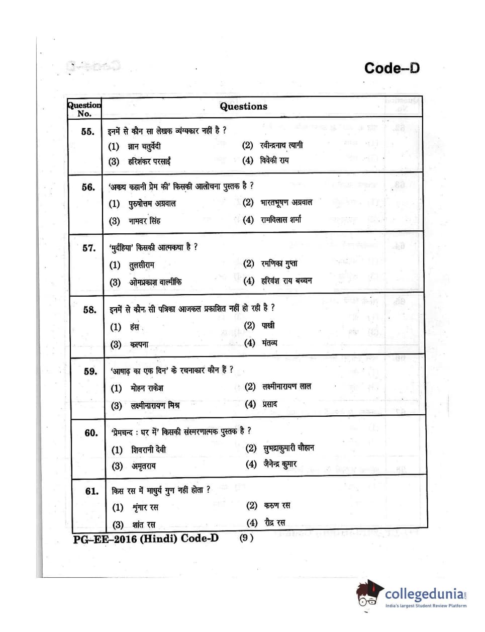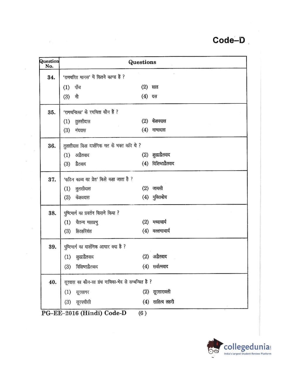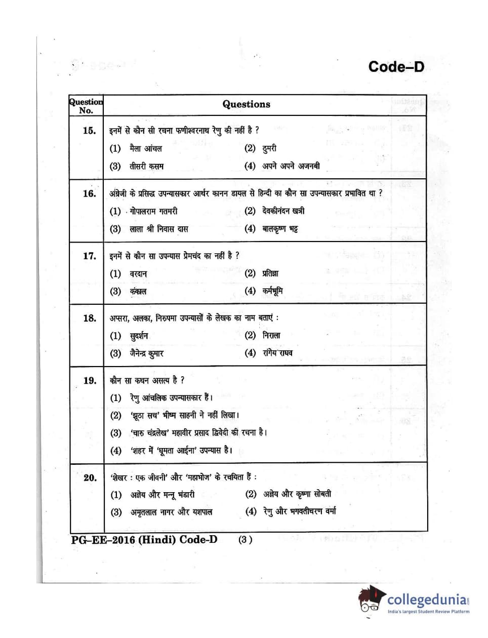 MDUCEE 2016 M.A. (Hindi) Set D Question Paper with Answer Key PDFs