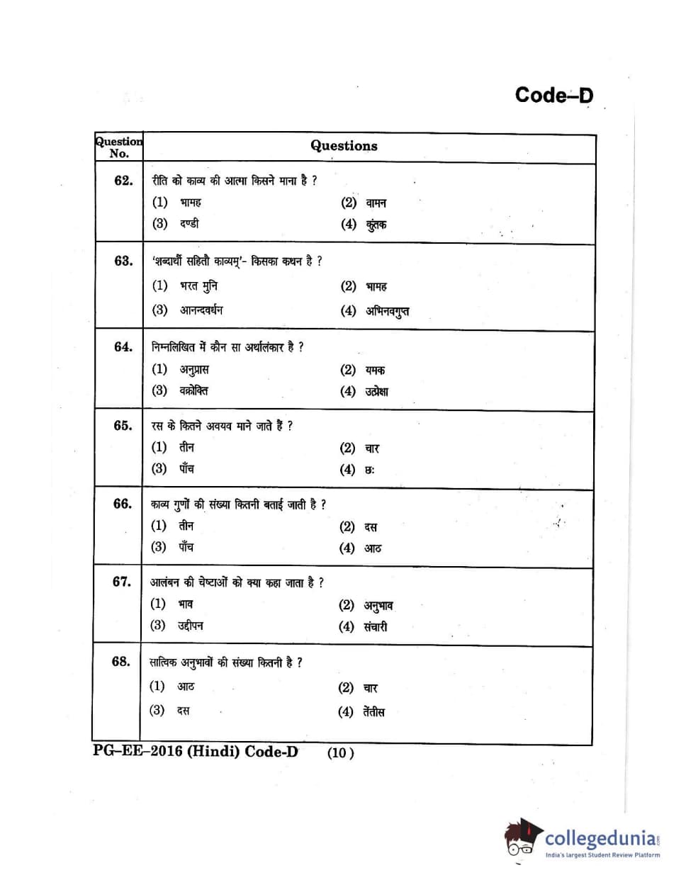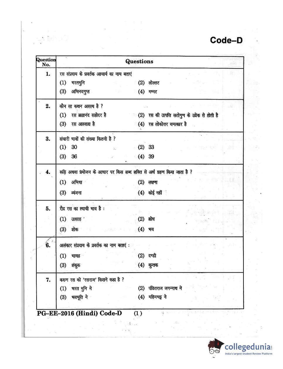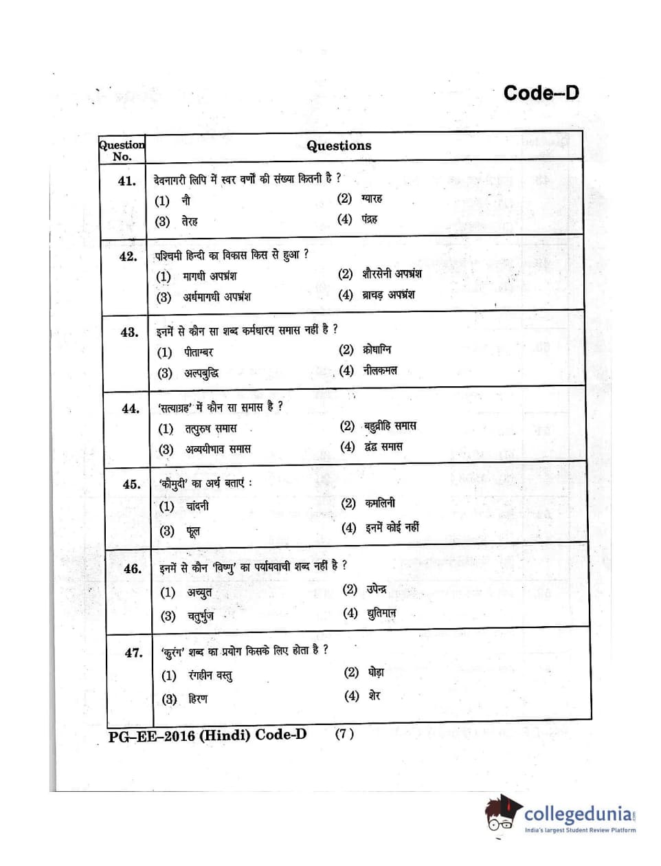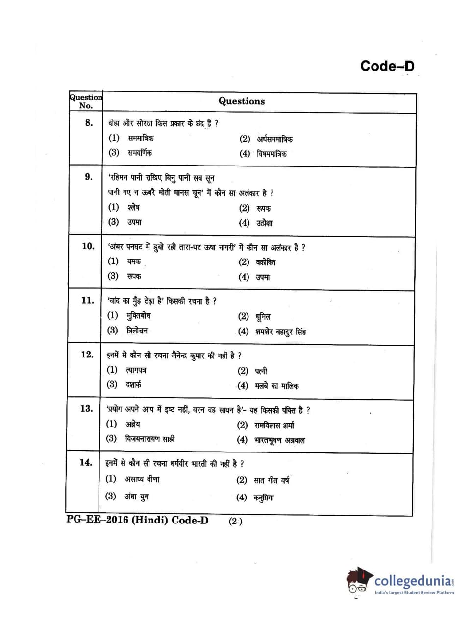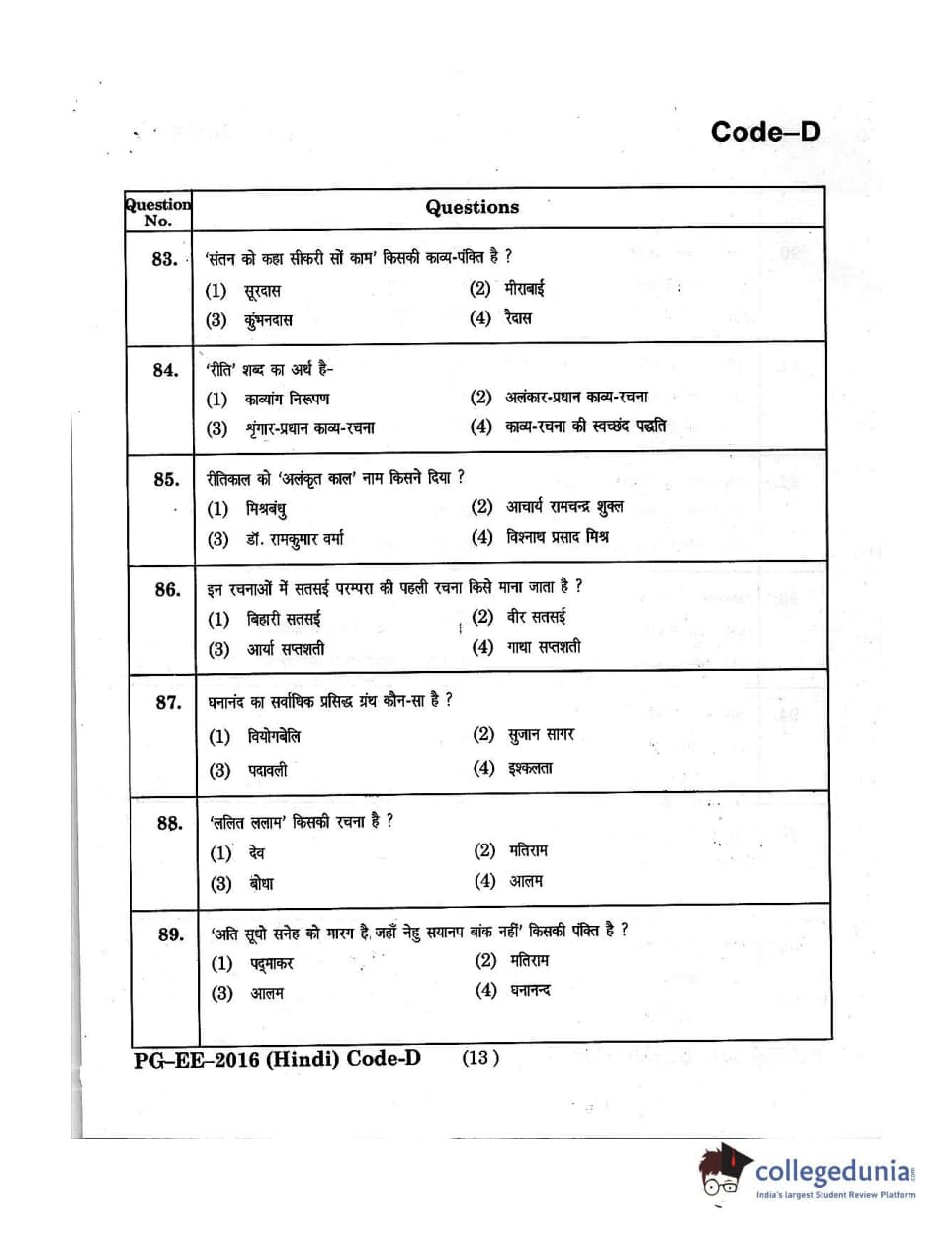MDUCEE 2016 M.A. (Hindi) Set D Question Paper with Answer Key PDFs