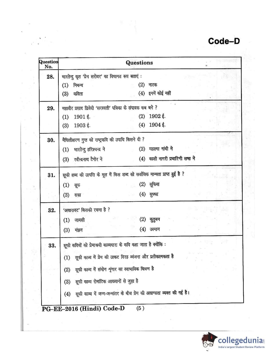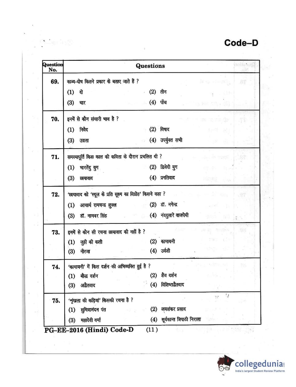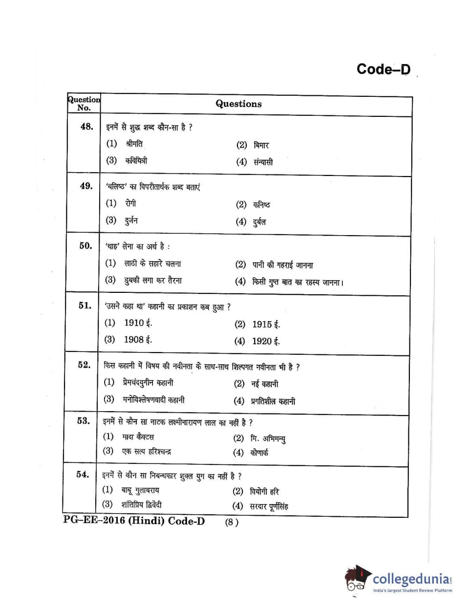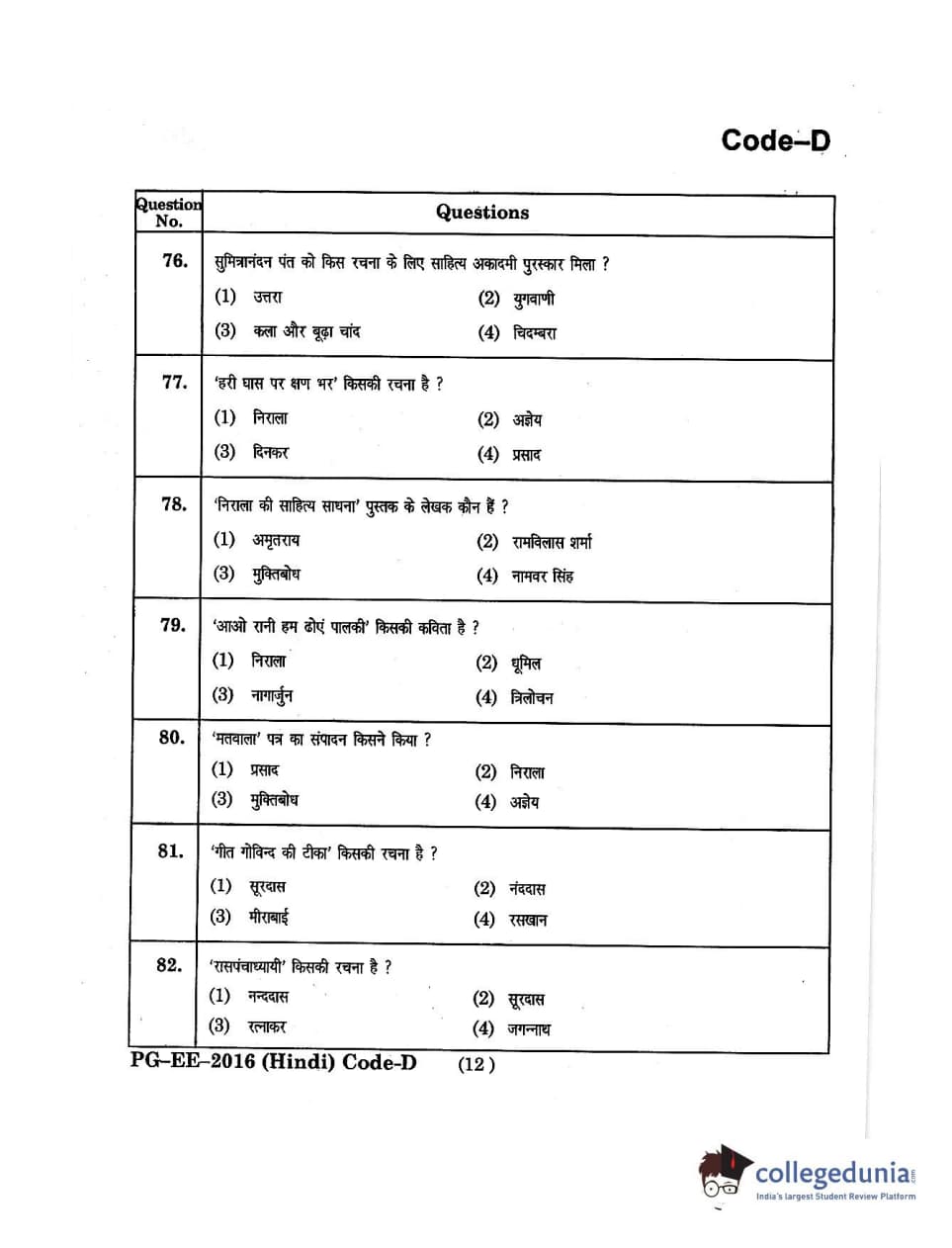 MDUCEE 2016 M.A. (Hindi) Set D Question Paper with Answer Key PDFs
