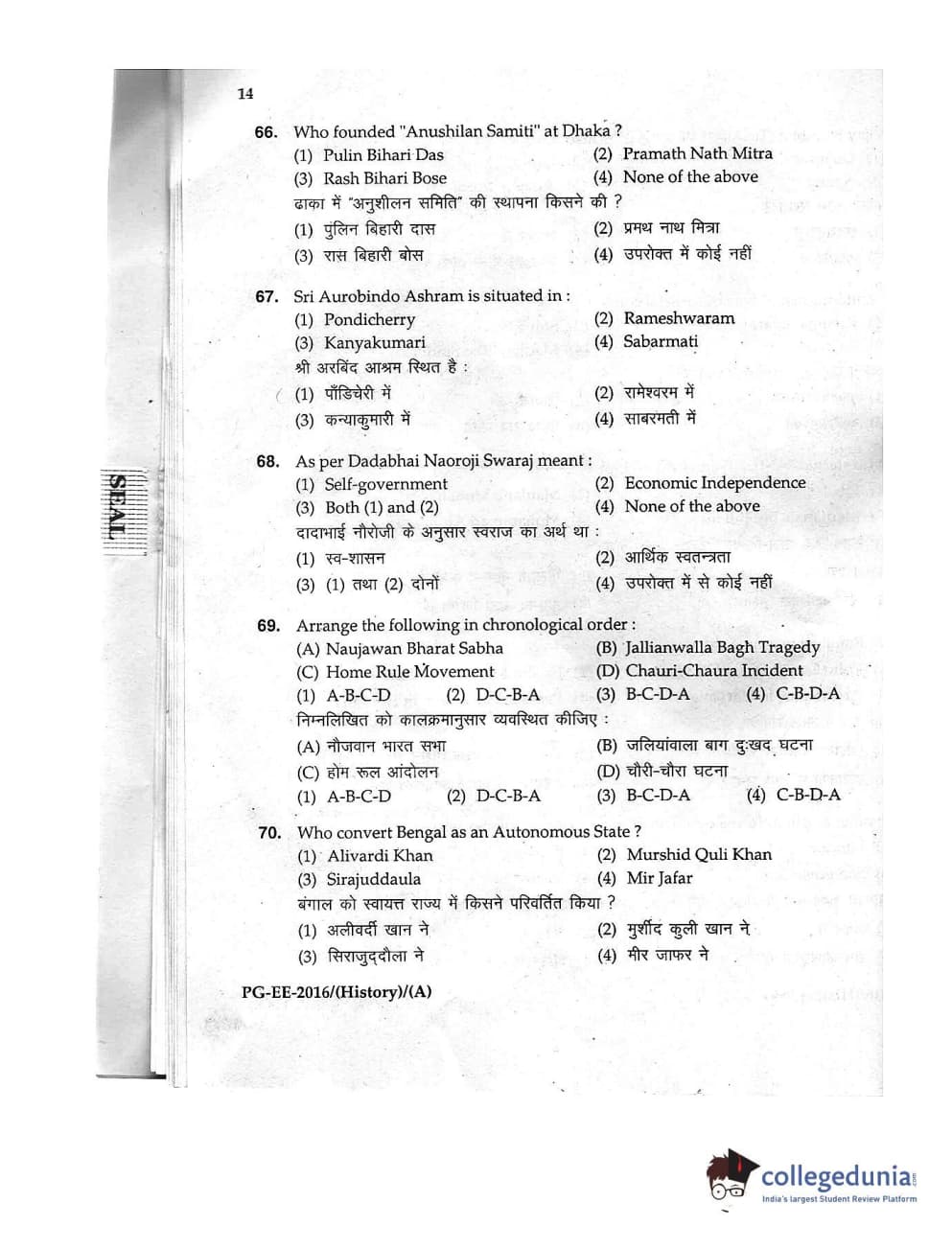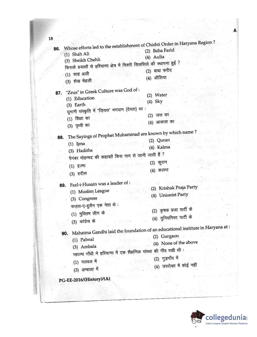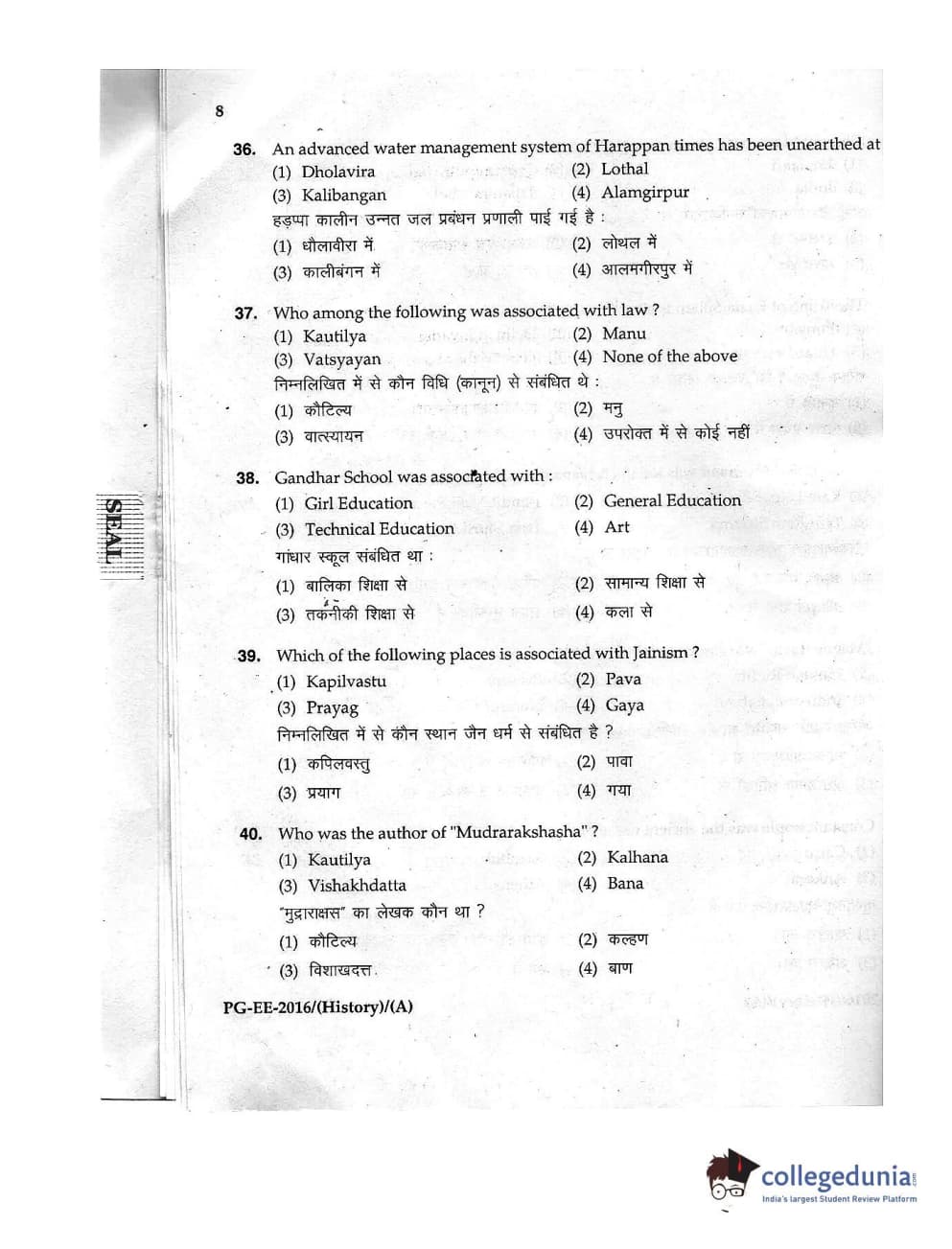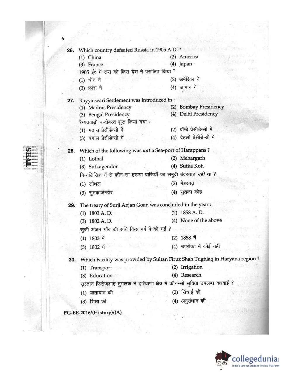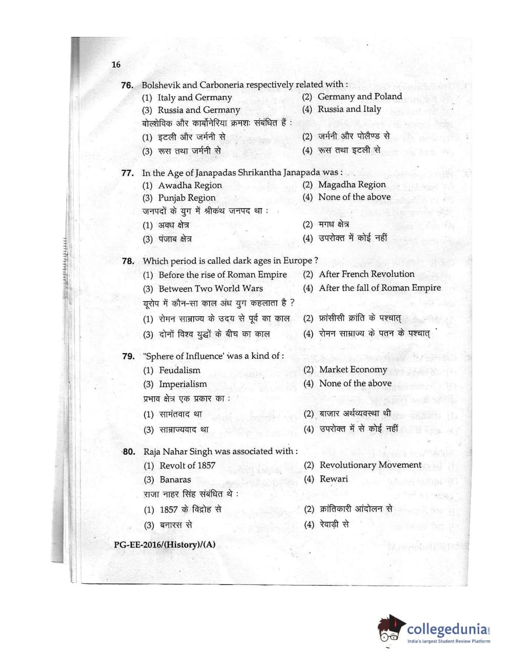 MDUCEE 2016 M.A. (History) Set A Question Paper with Answer Key PDFs