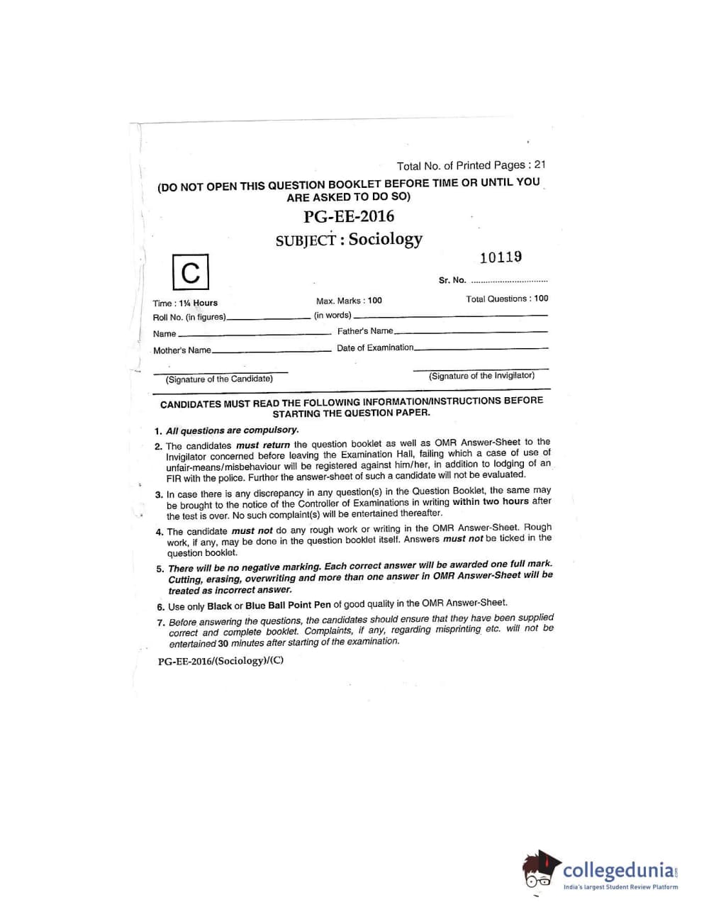 MDUCEE 2016 M.A (Sociology) Set C Question paper with answer key pdf is available for download. The exam was successfully organized by Maharishi Dayanand University. The question paper comprised a total of 100 questions.