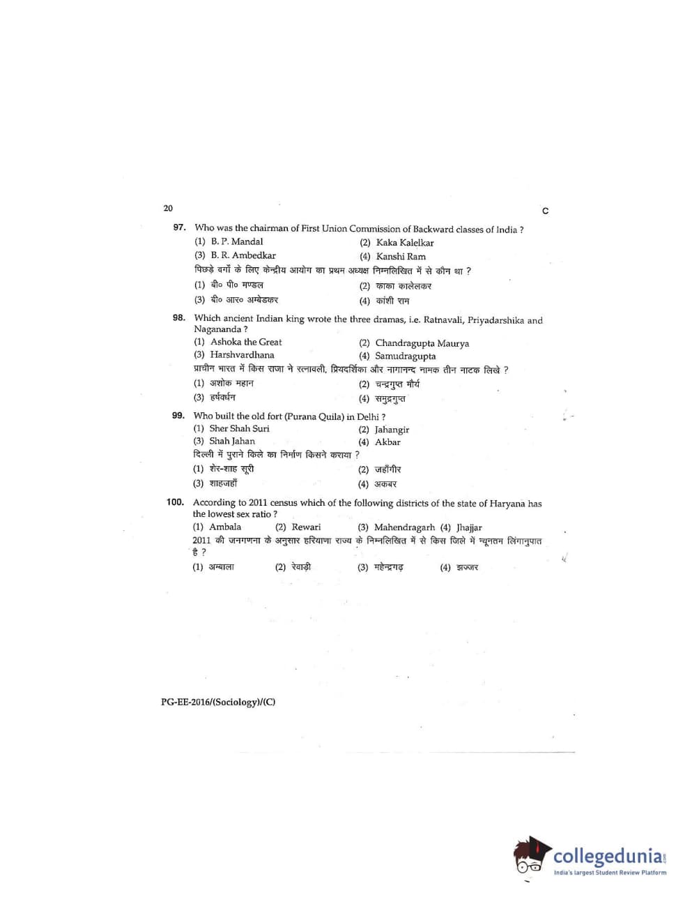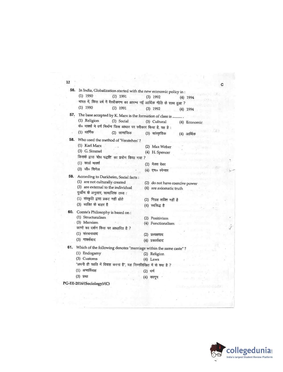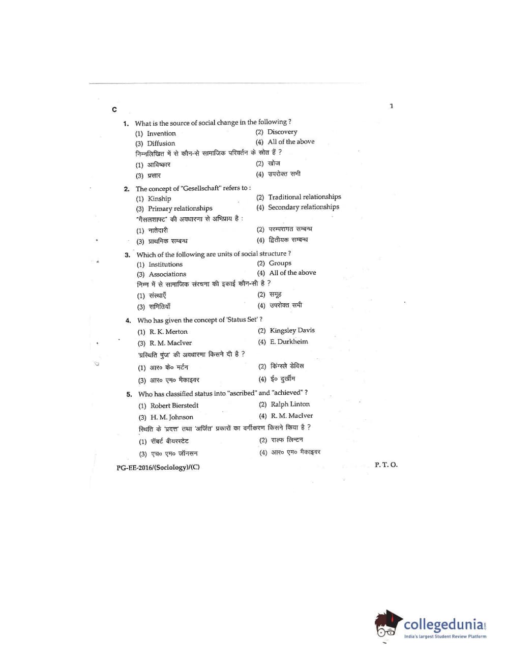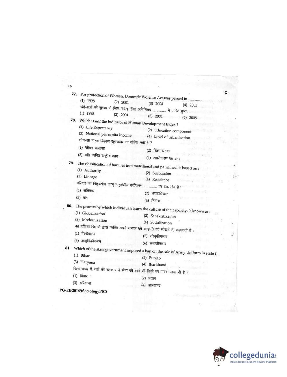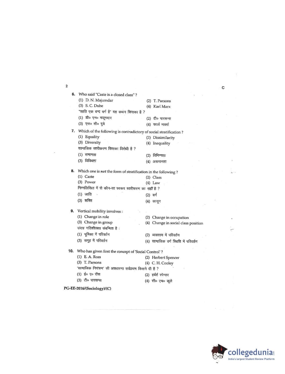 MDUCEE 2016 M.A (Sociology) Set C Question Paper with Answer Key PDFs