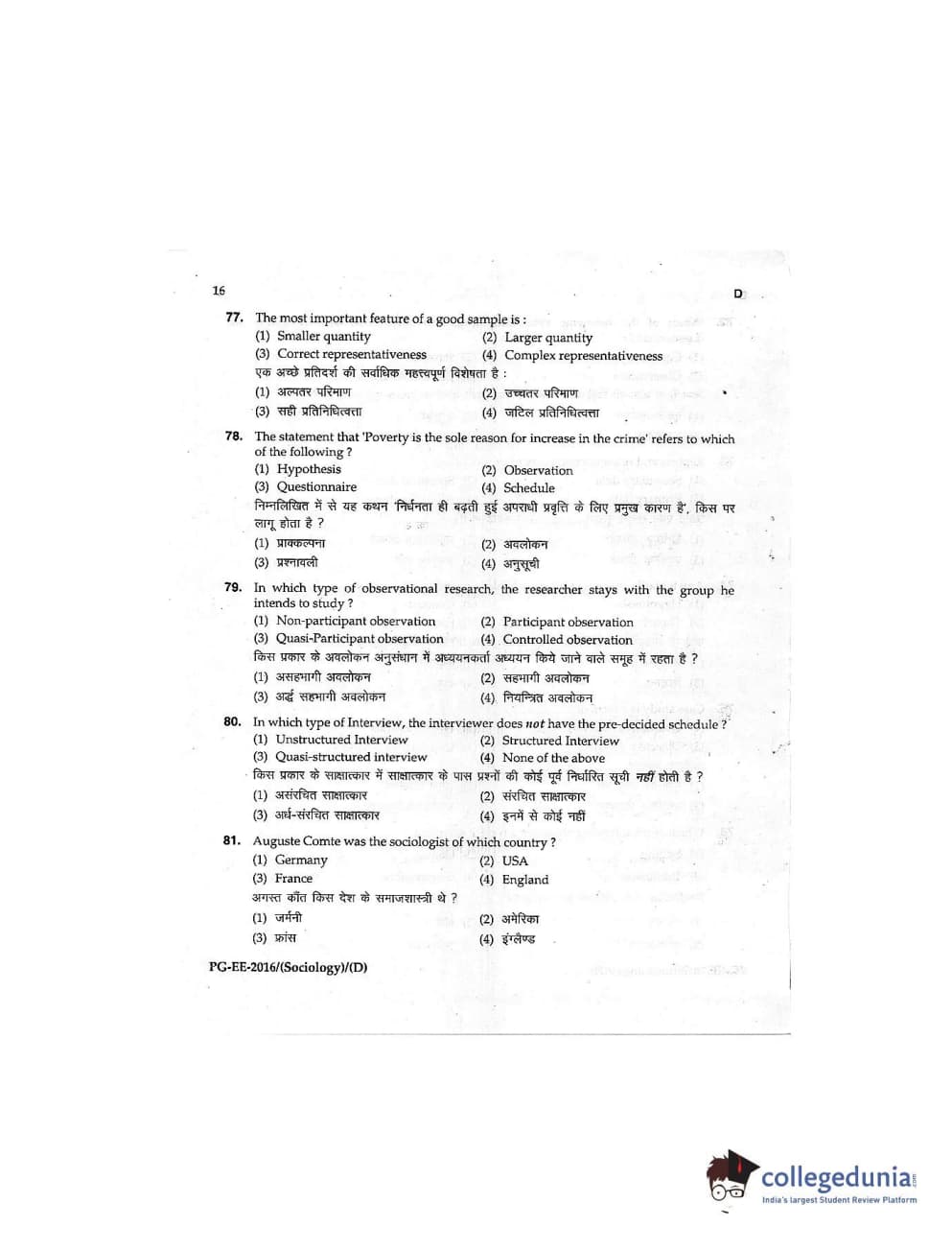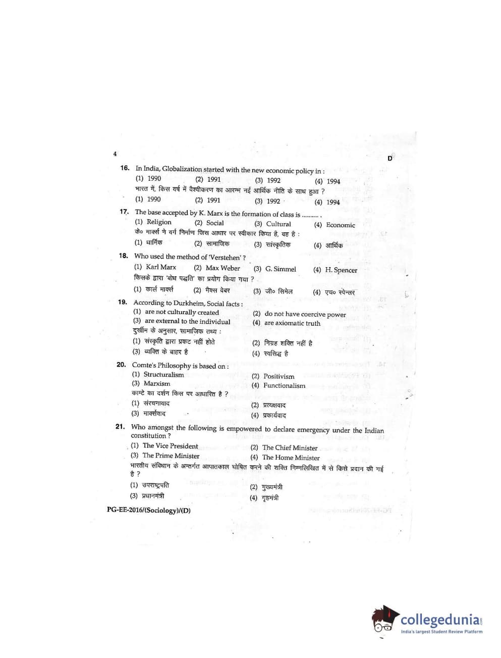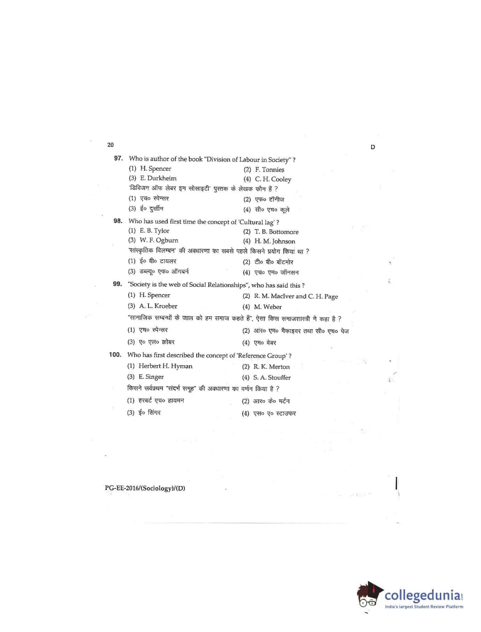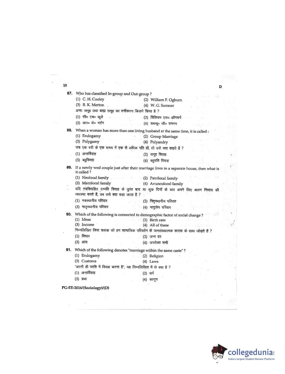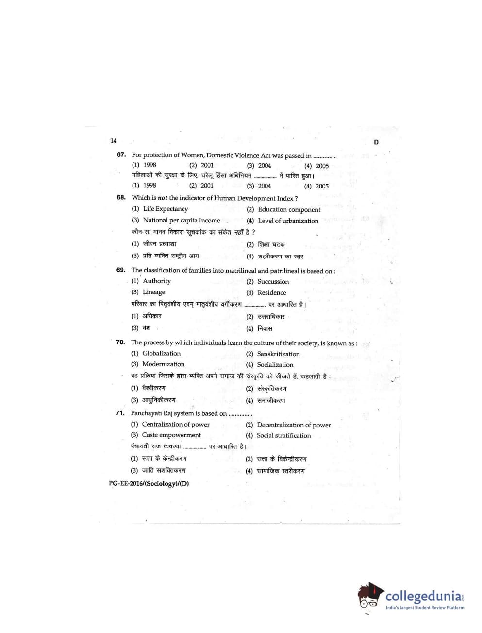 MDUCEE 2016 M.A (Sociology) Set D Question Paper with Answer Key PDFs