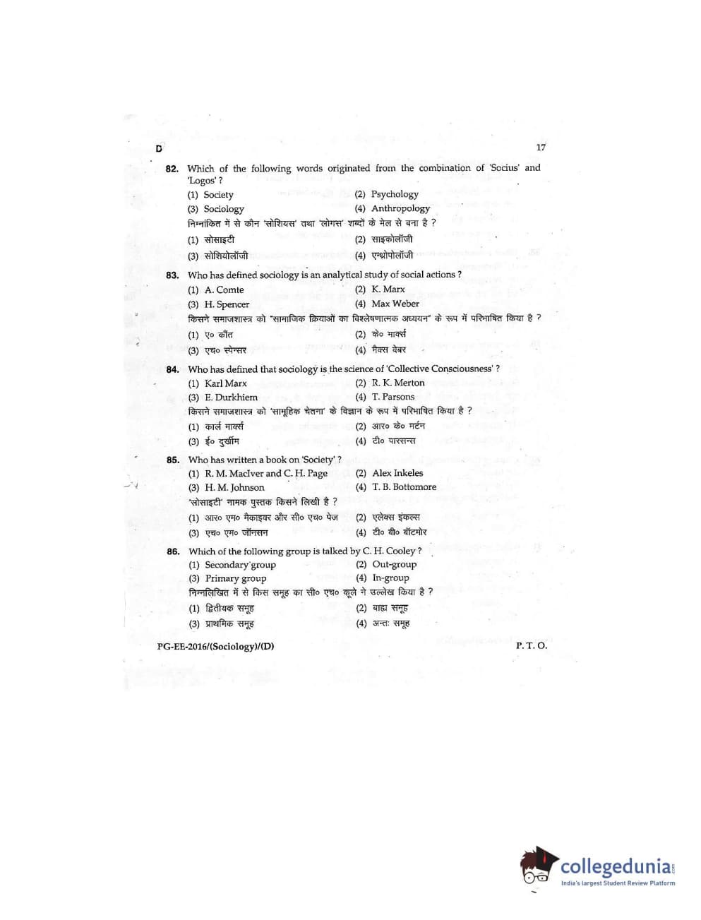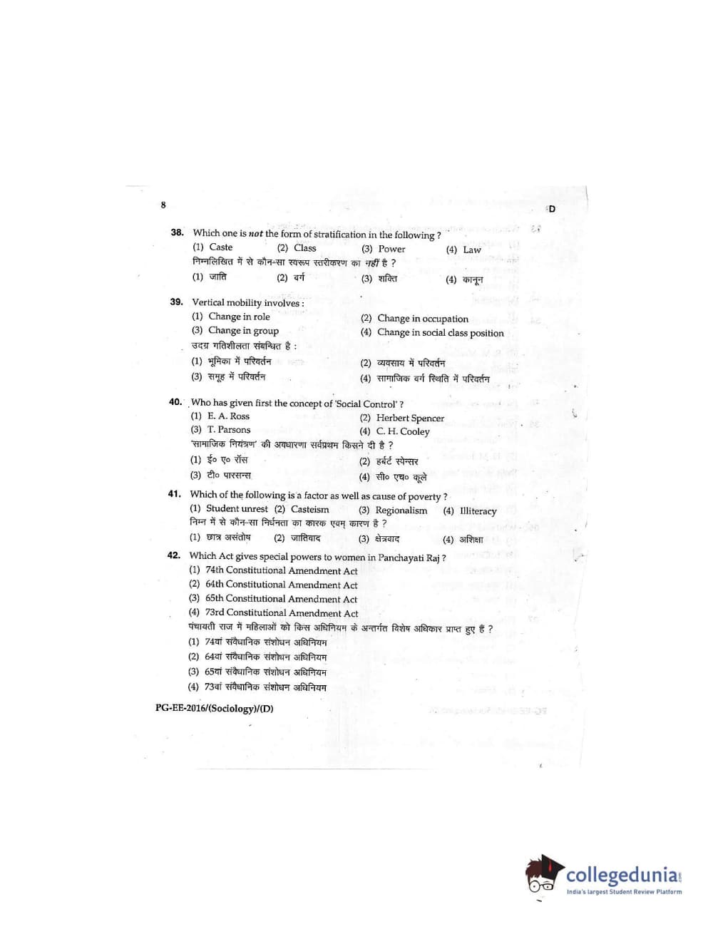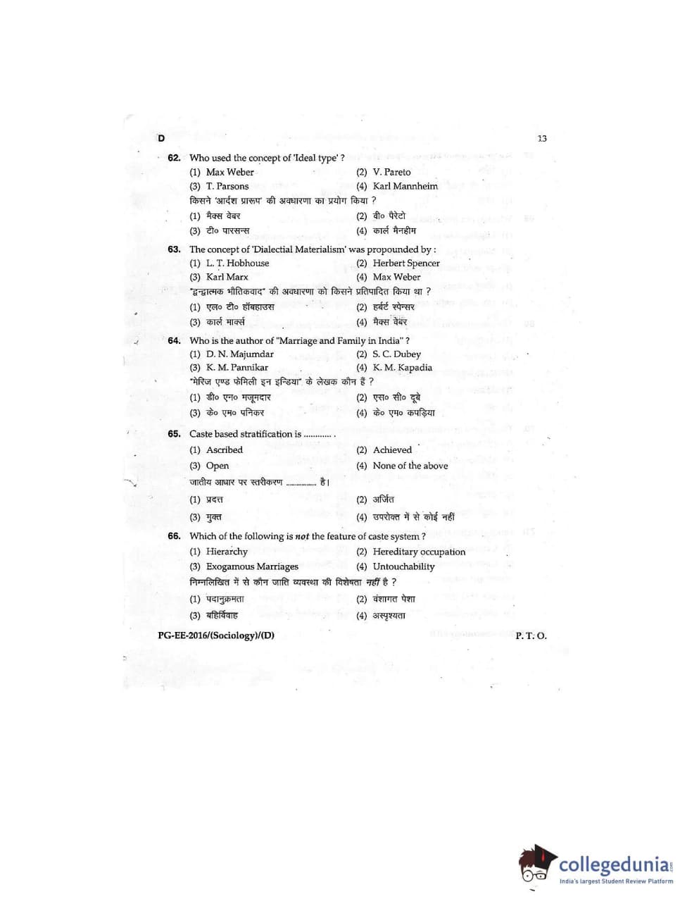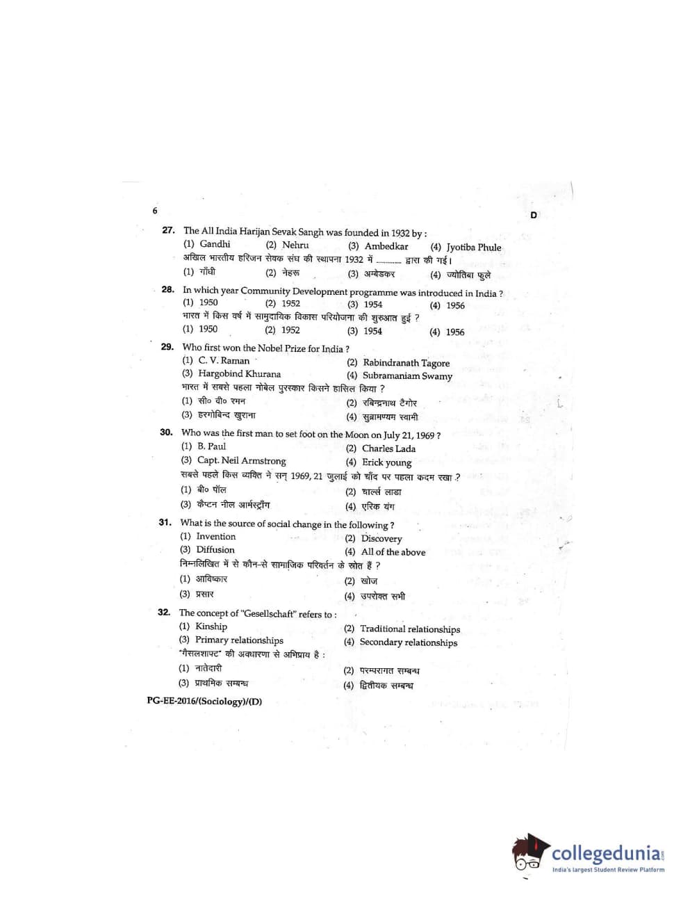 MDUCEE 2016 M.A (Sociology) Set D Question Paper with Answer Key PDFs