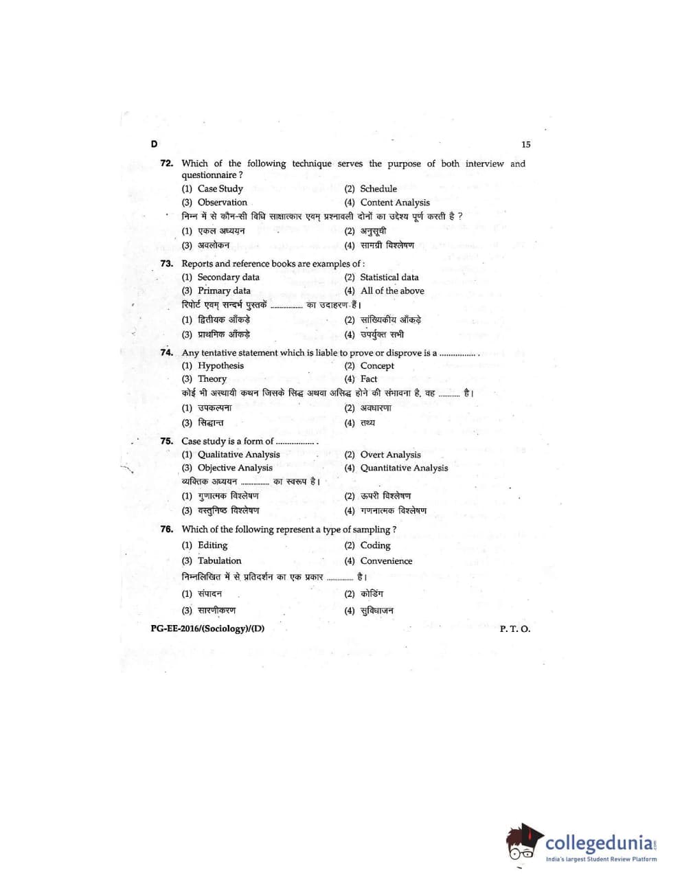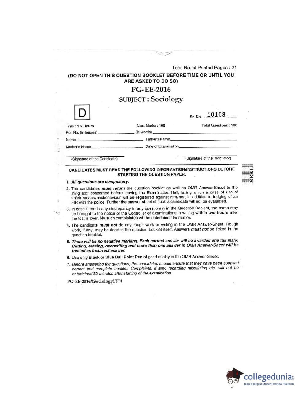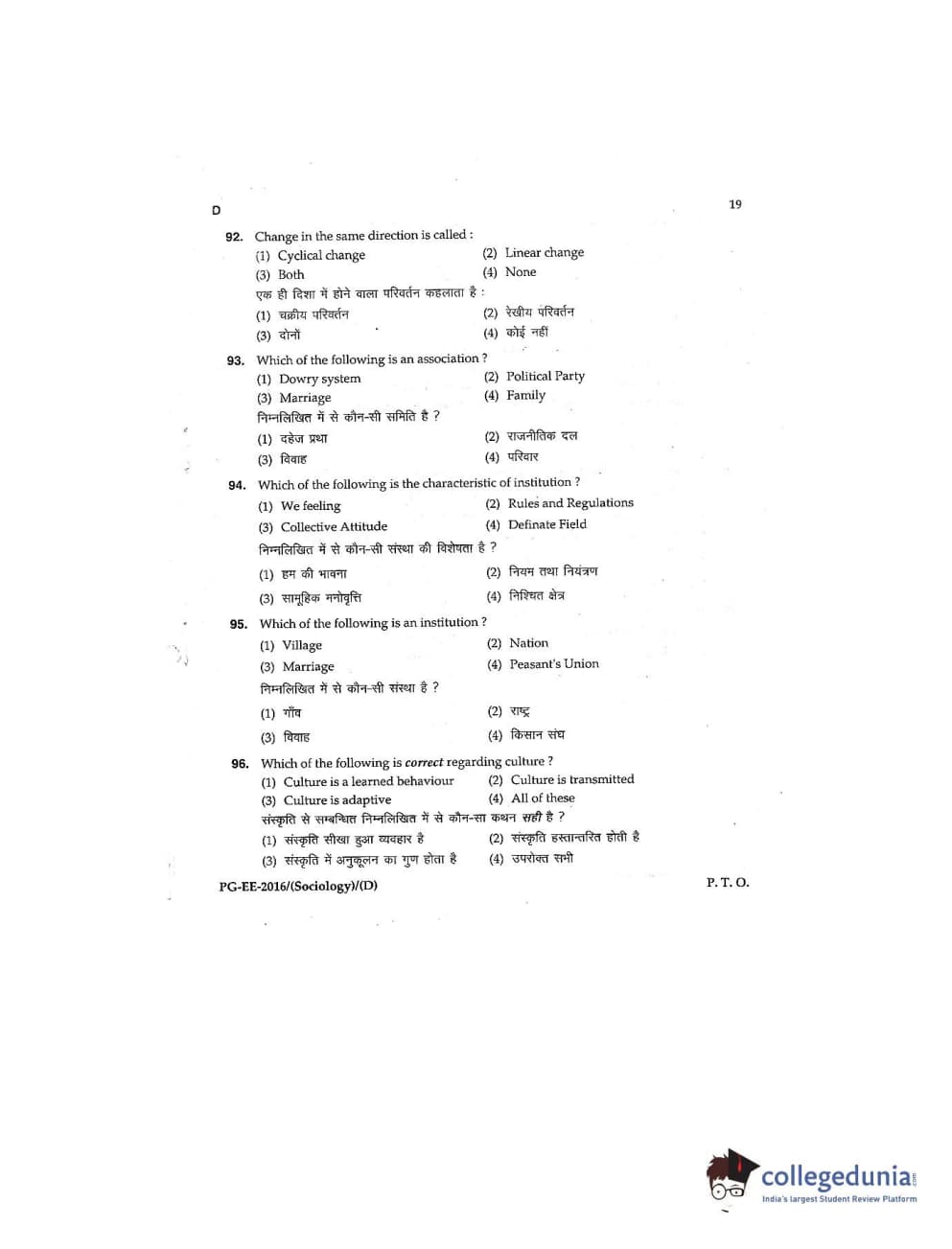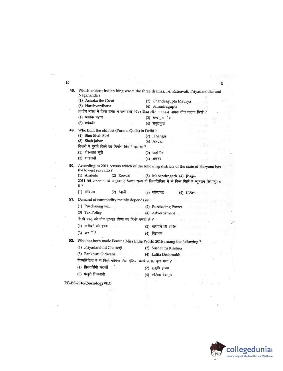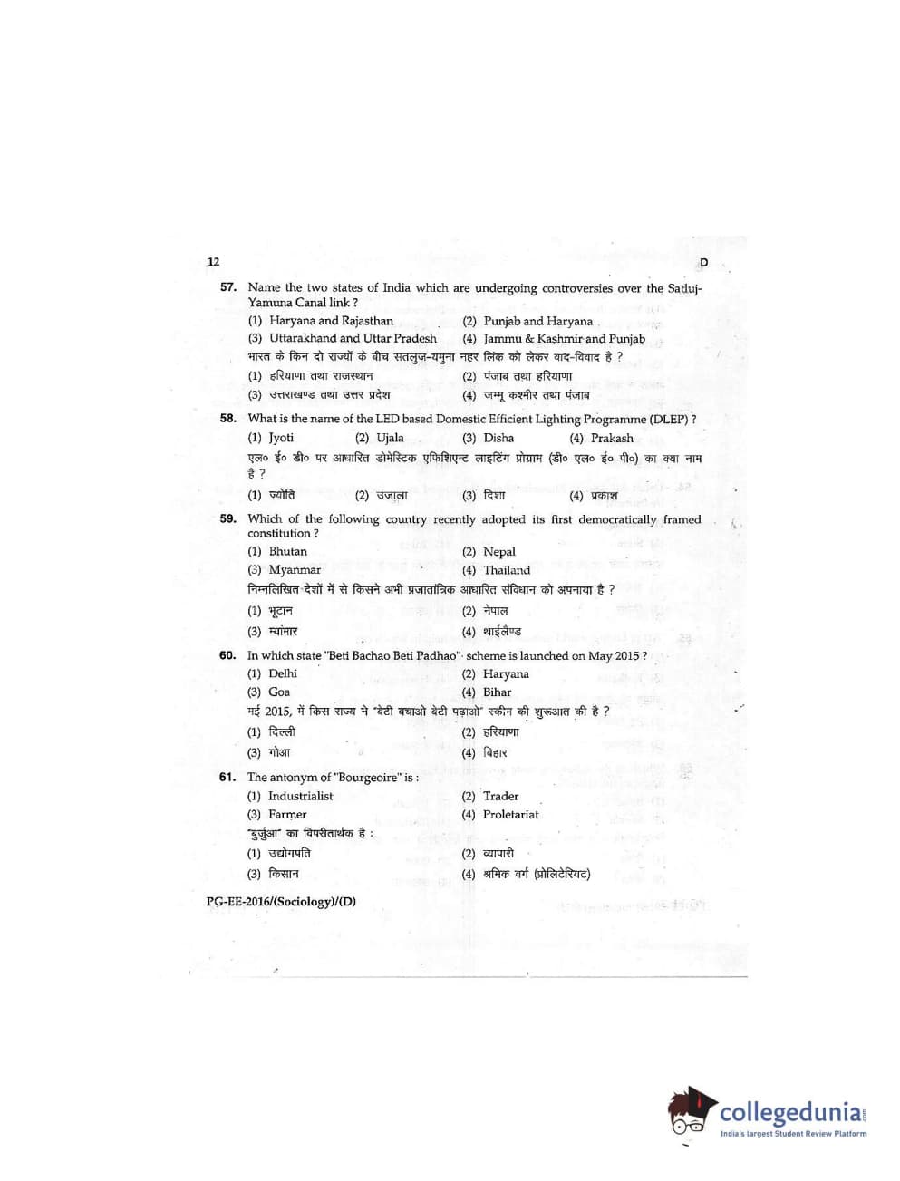 MDUCEE 2016 M.A (Sociology) Set D Question Paper with Answer Key PDFs