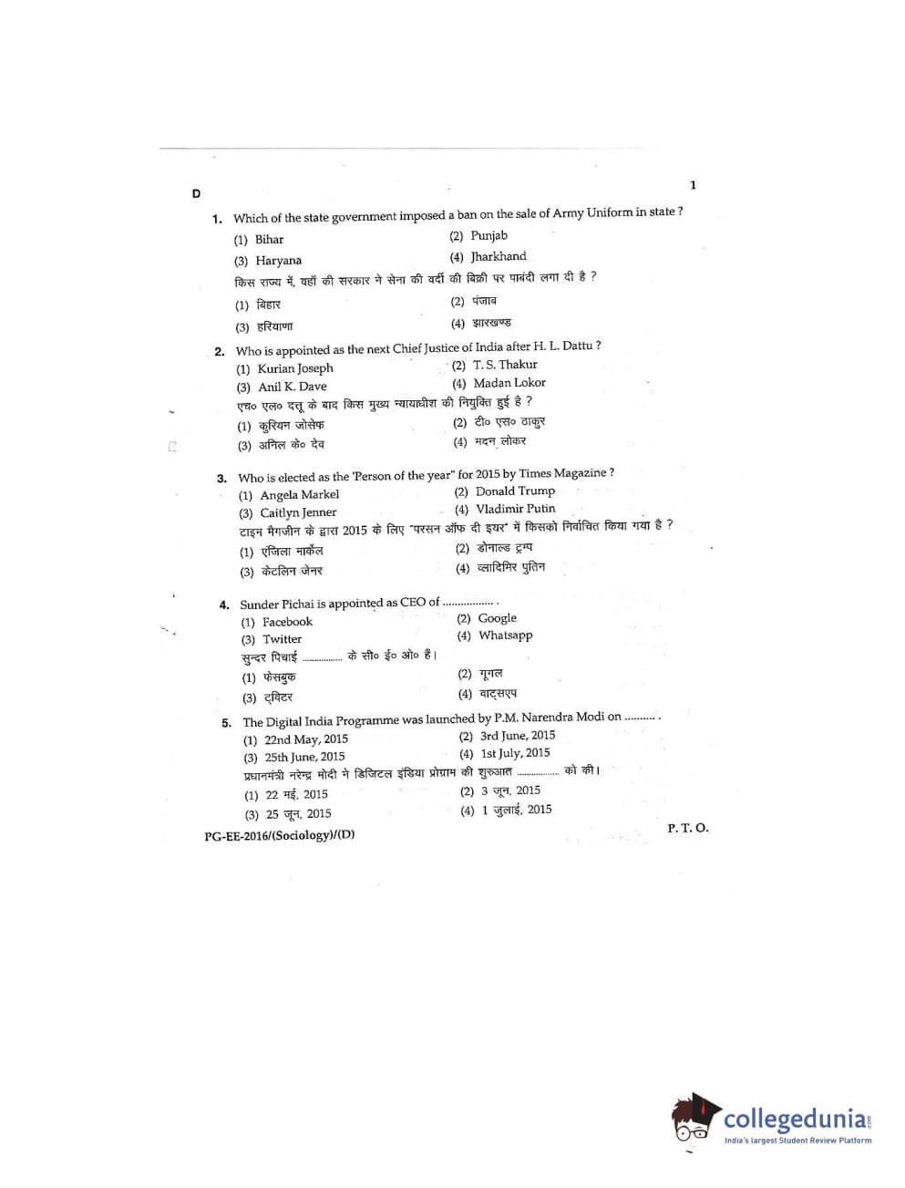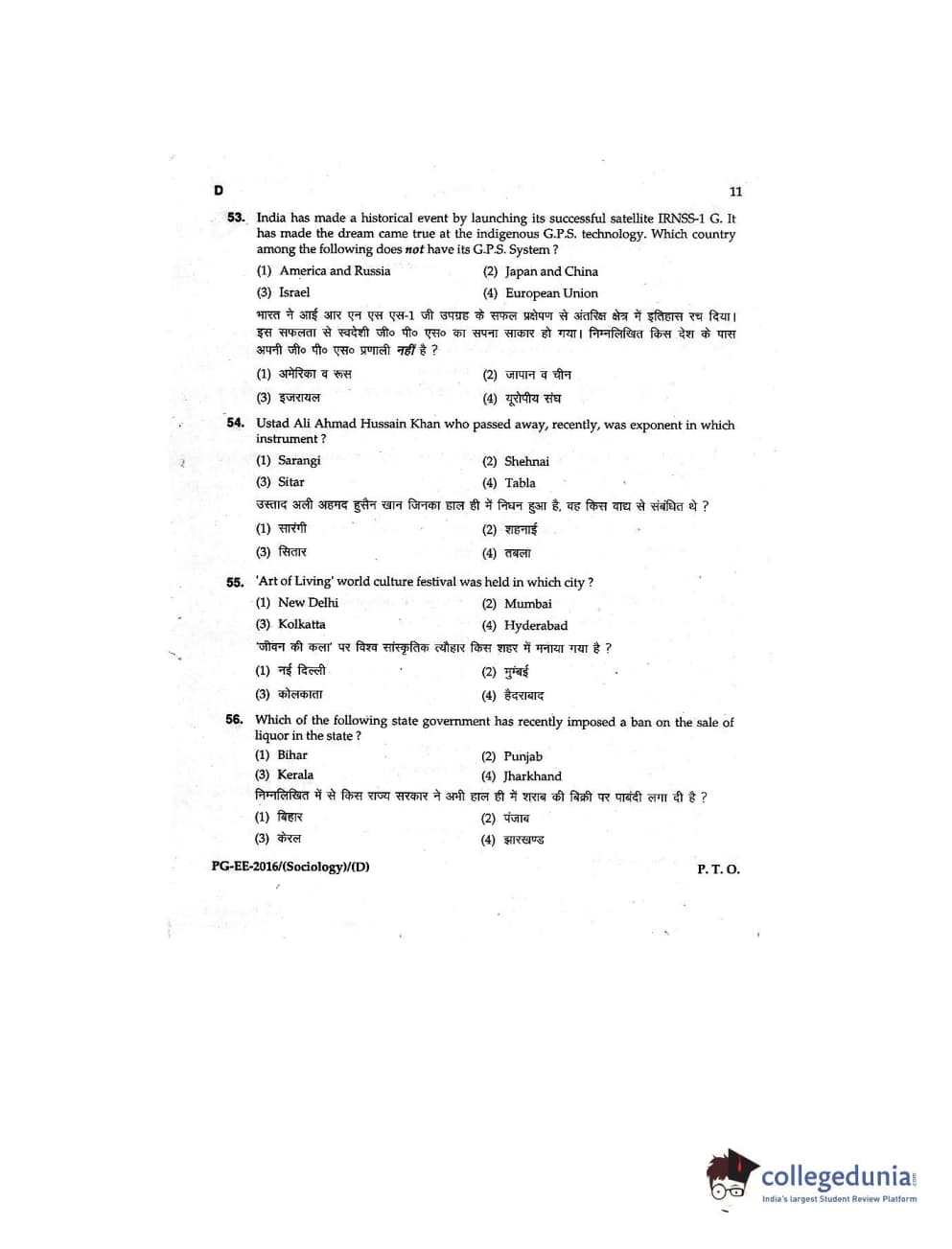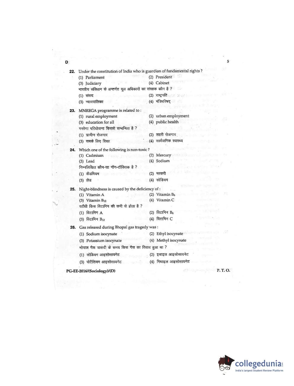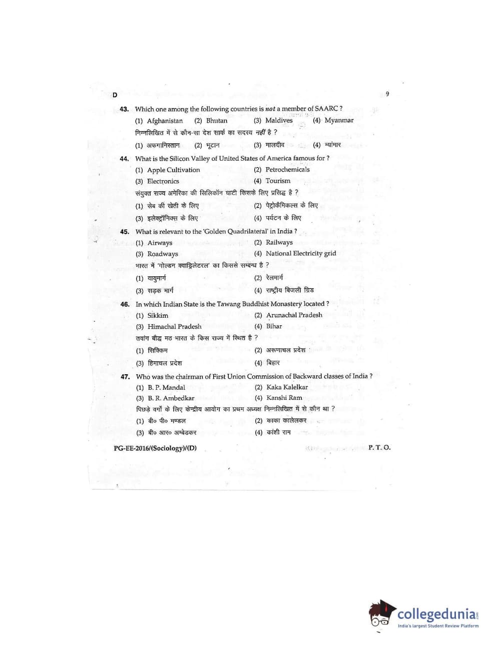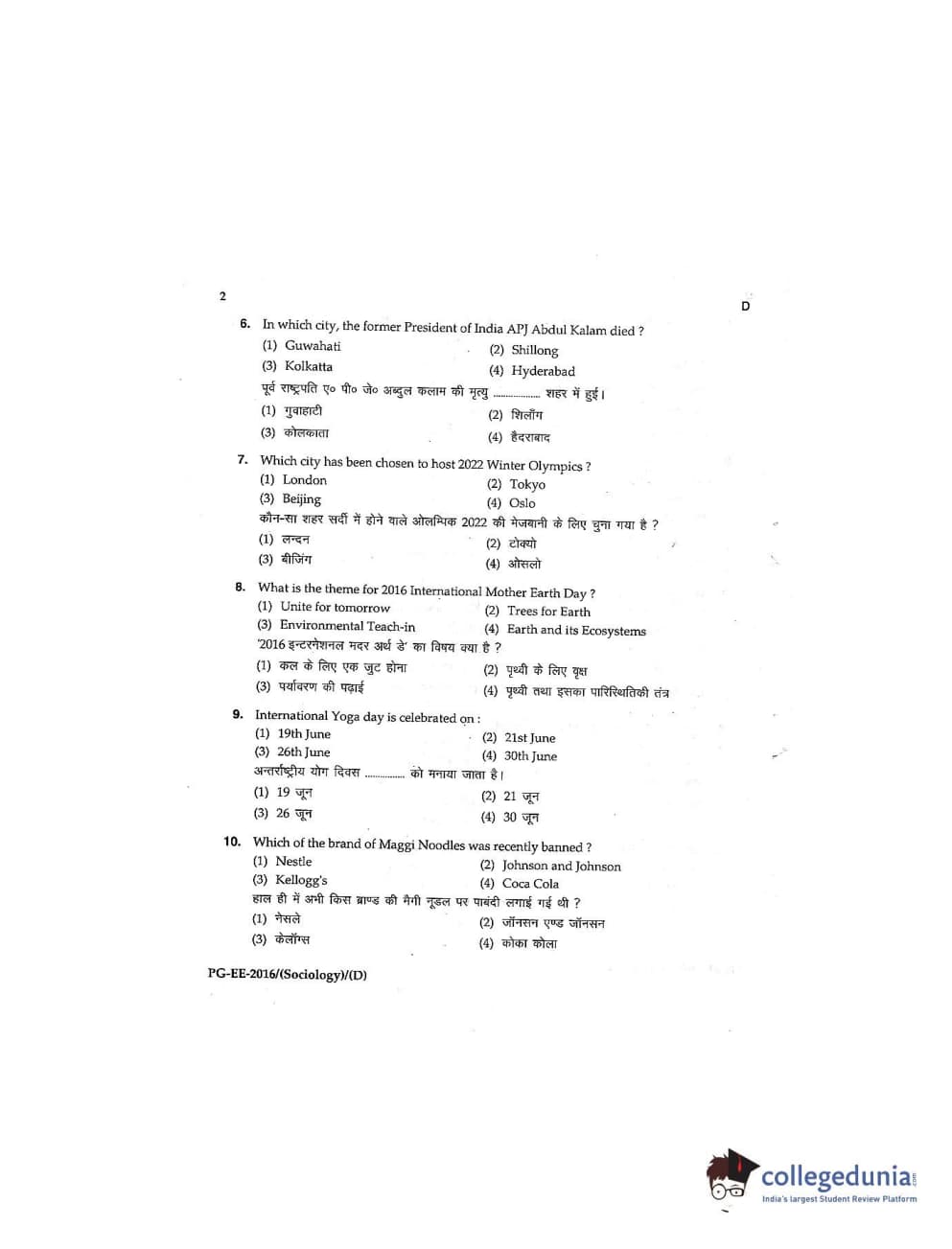 MDUCEE 2016 M.A (Sociology) Set D Question Paper with Answer Key PDFs