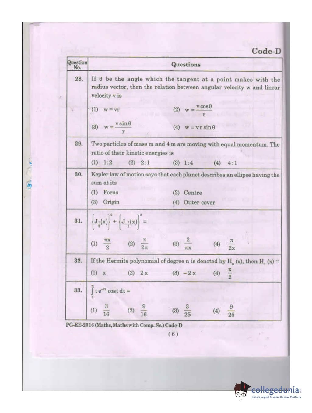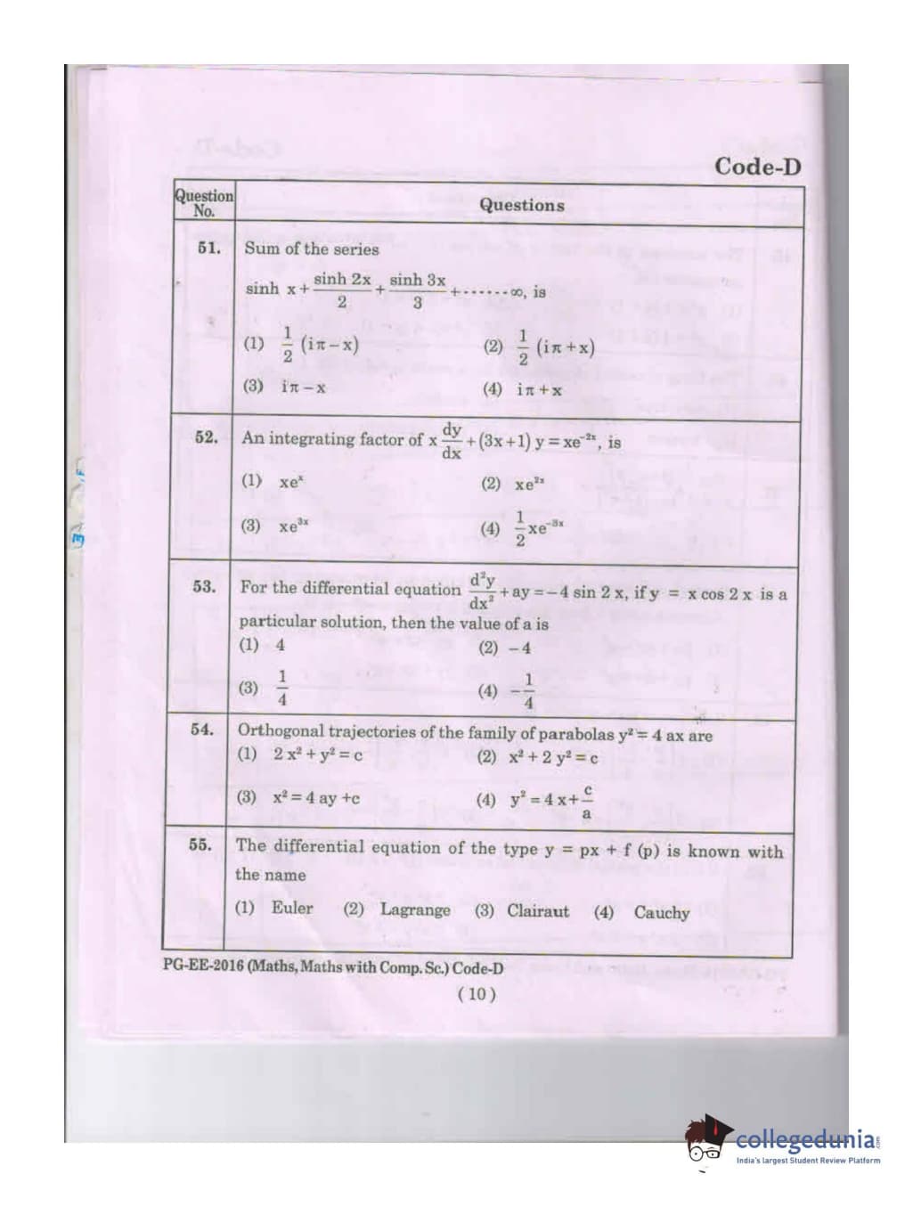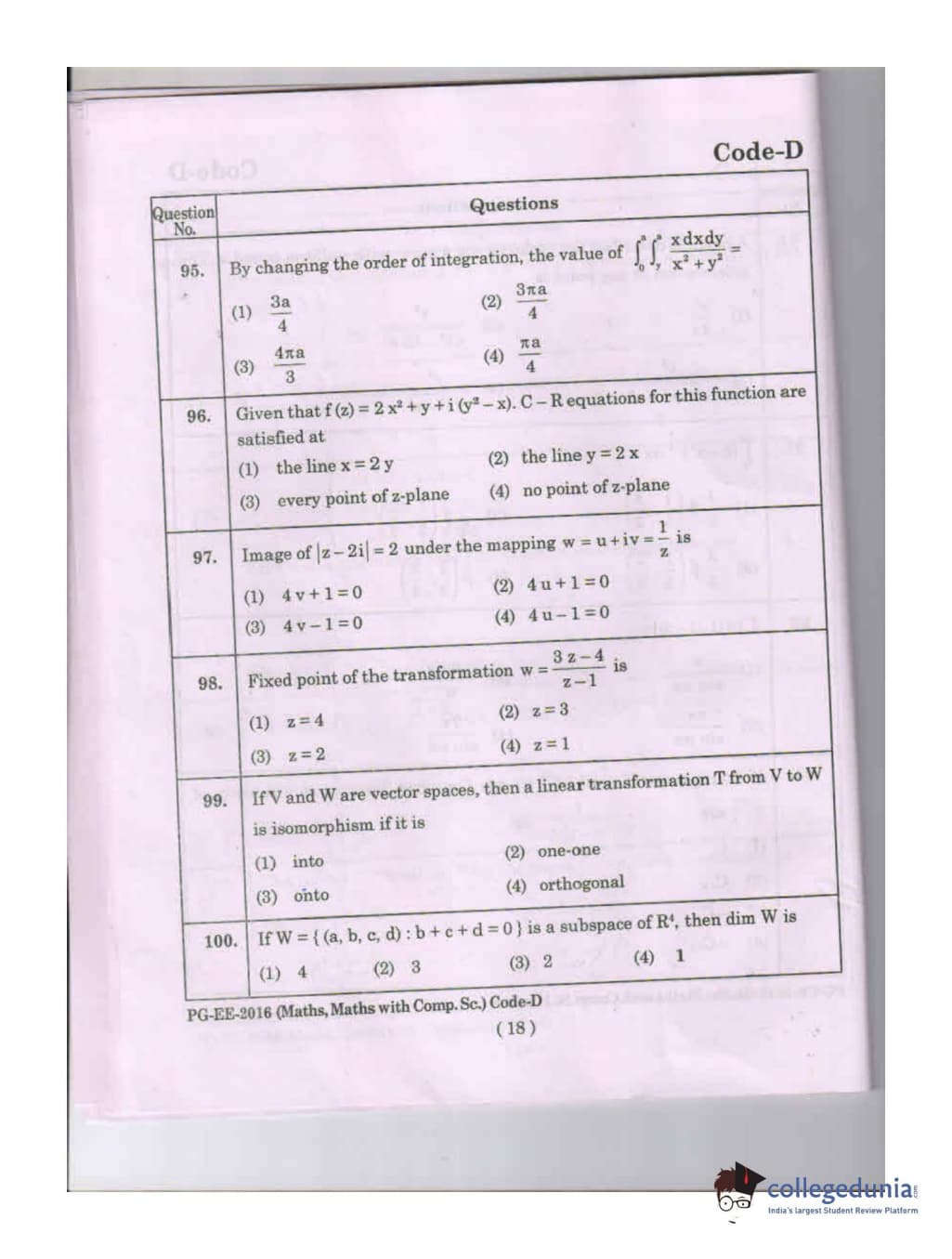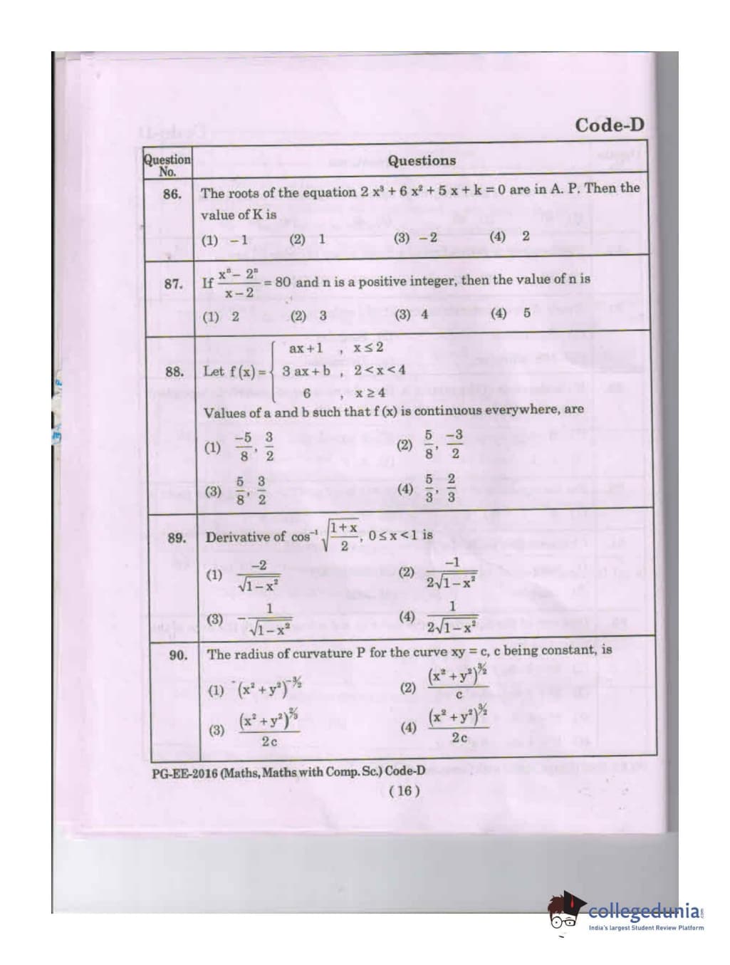 MDUCEE 2016 Math, Math With Computer Science Set D Question Paper with Answer Key PDFs