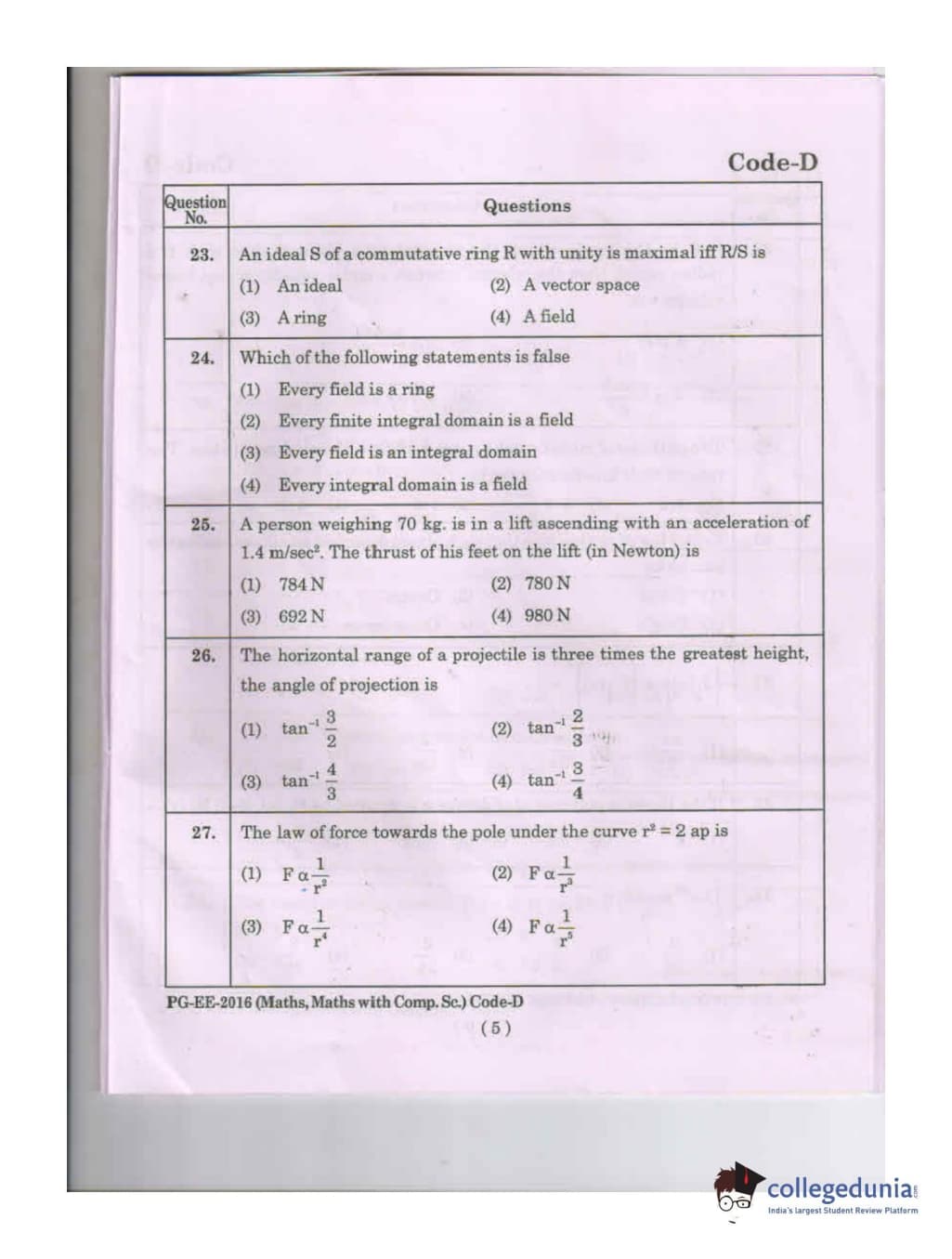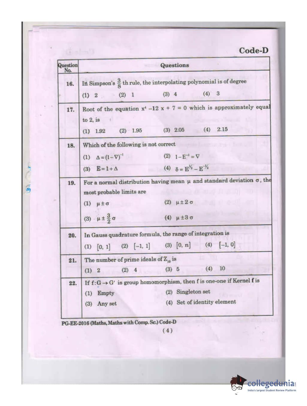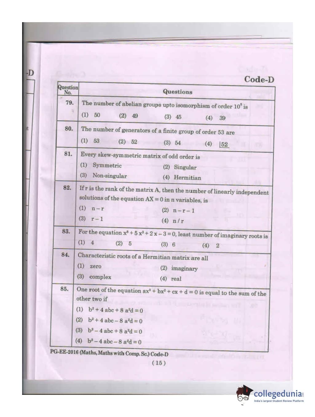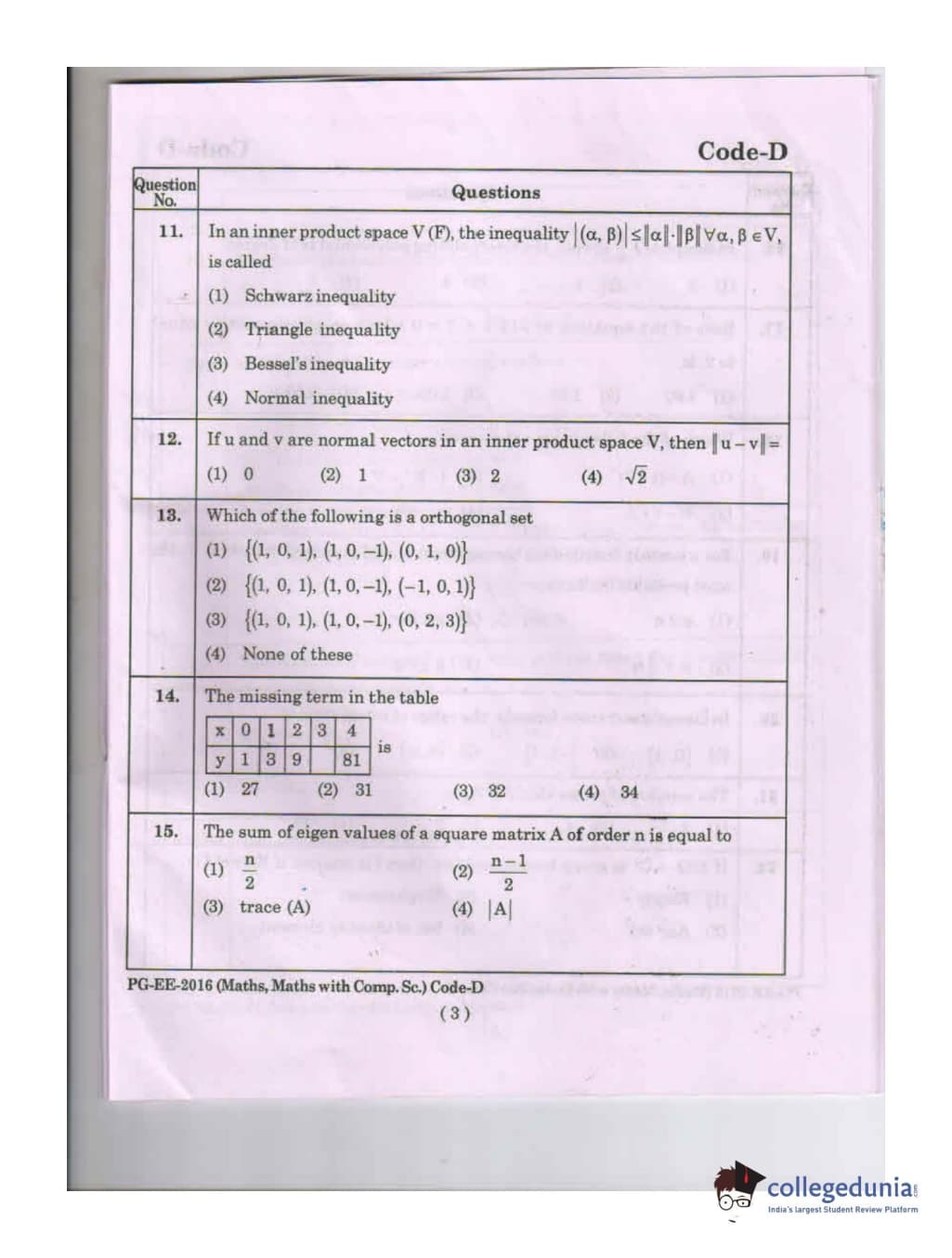 MDUCEE 2016 Math, Math With Computer Science Set D Question Paper with Answer Key PDFs