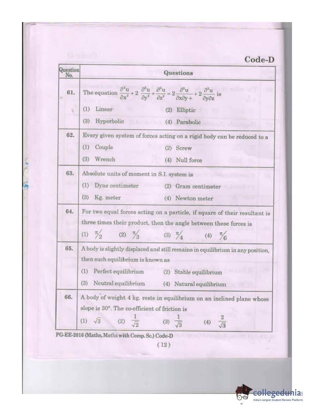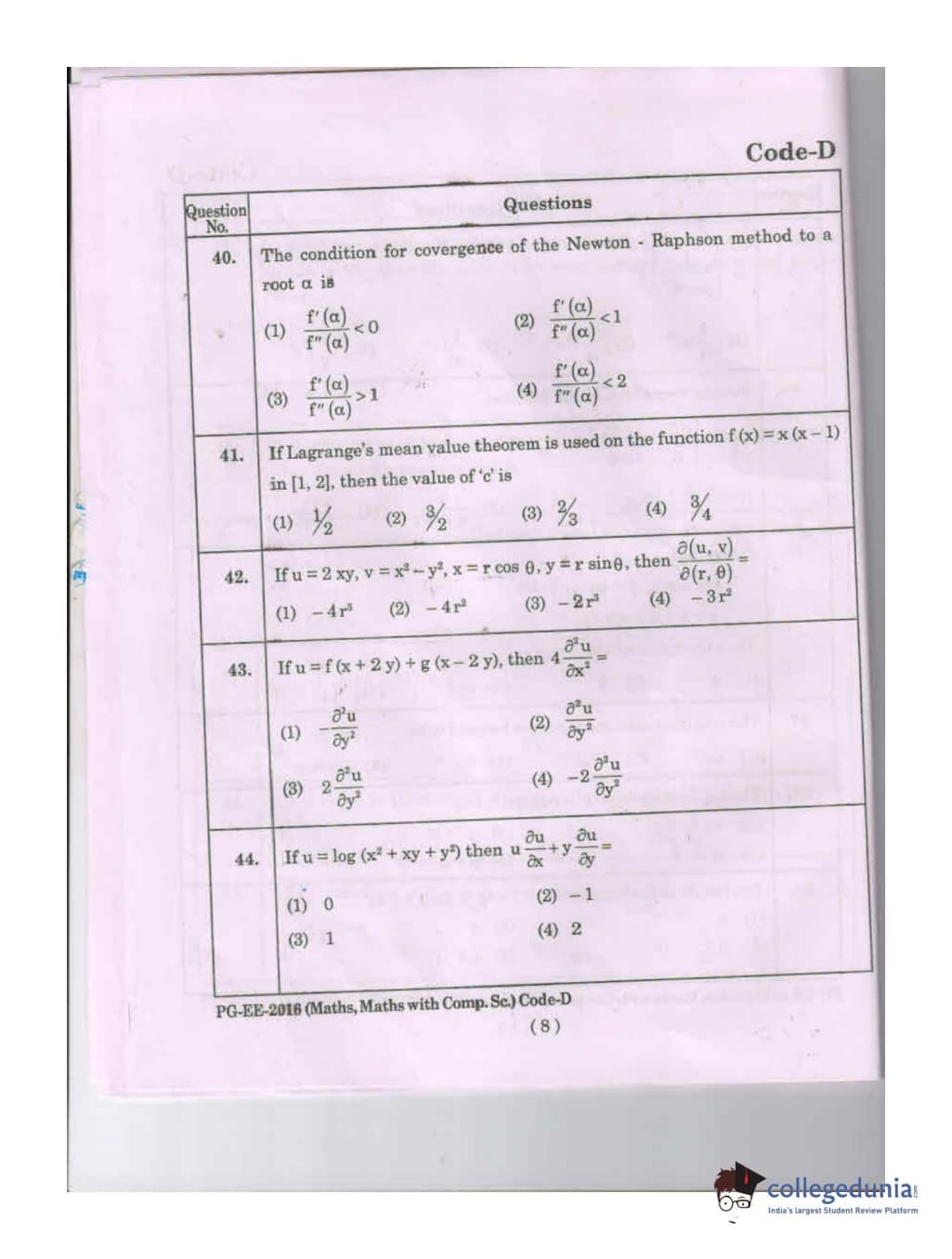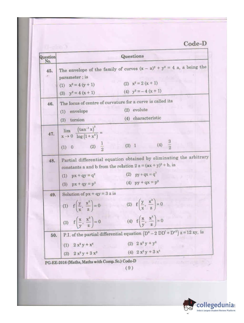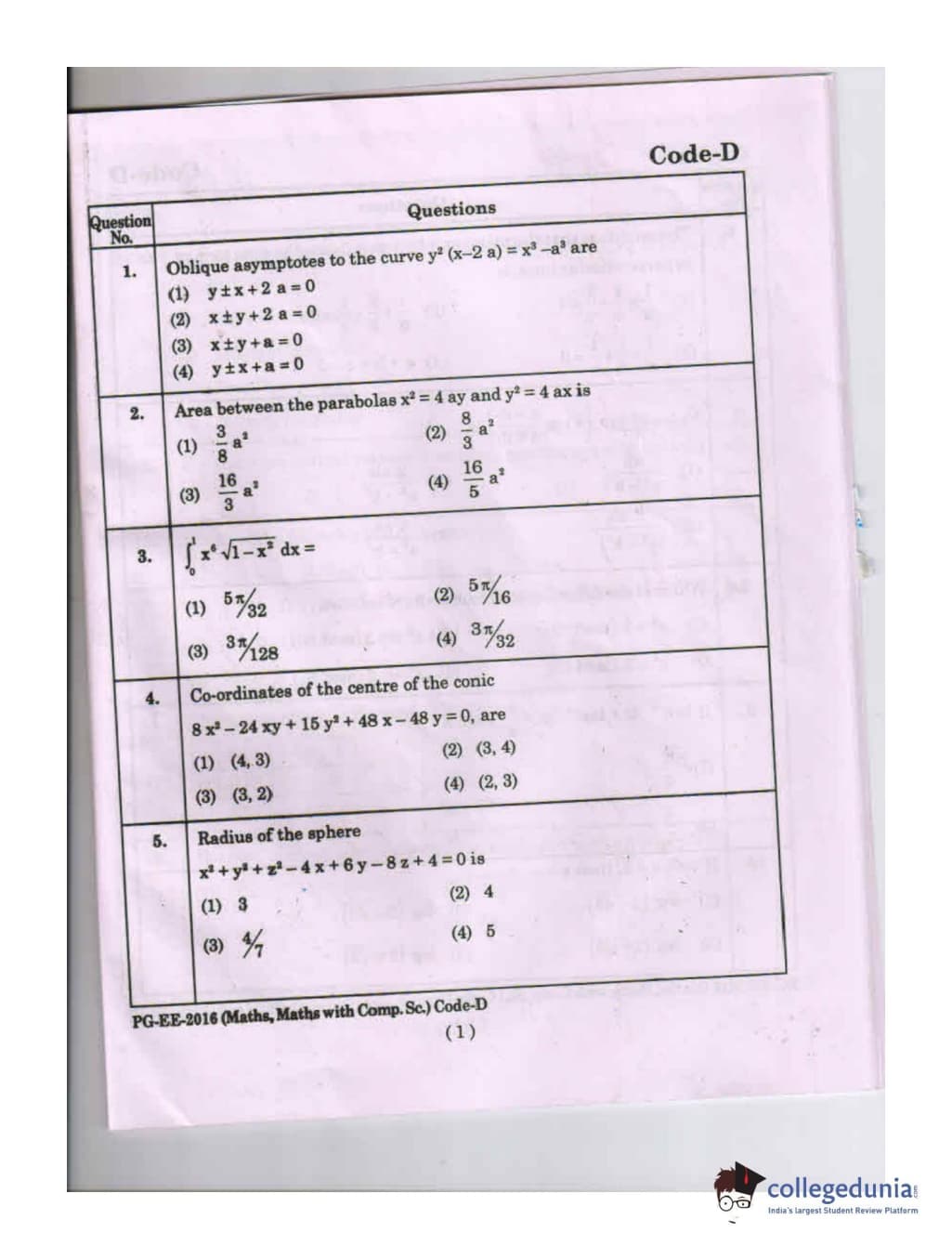 MDUCEE 2016 Math, Math With Computer Science Set D Question Paper with Answer Key PDFs