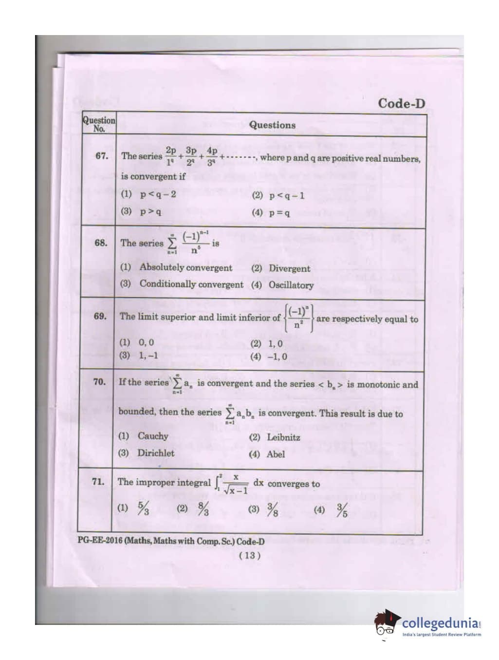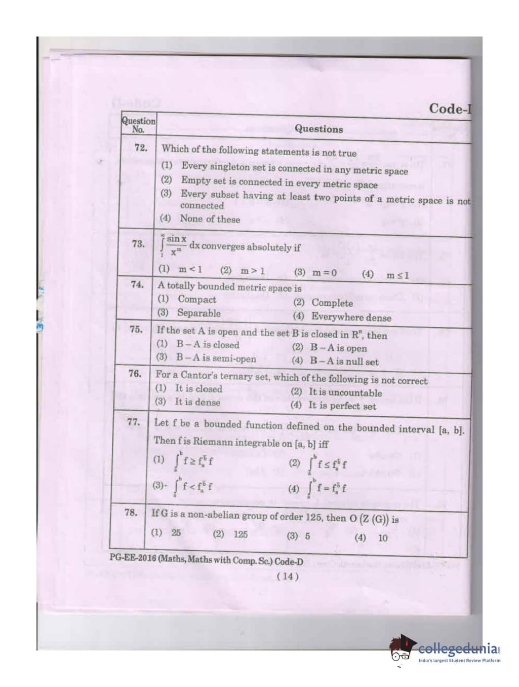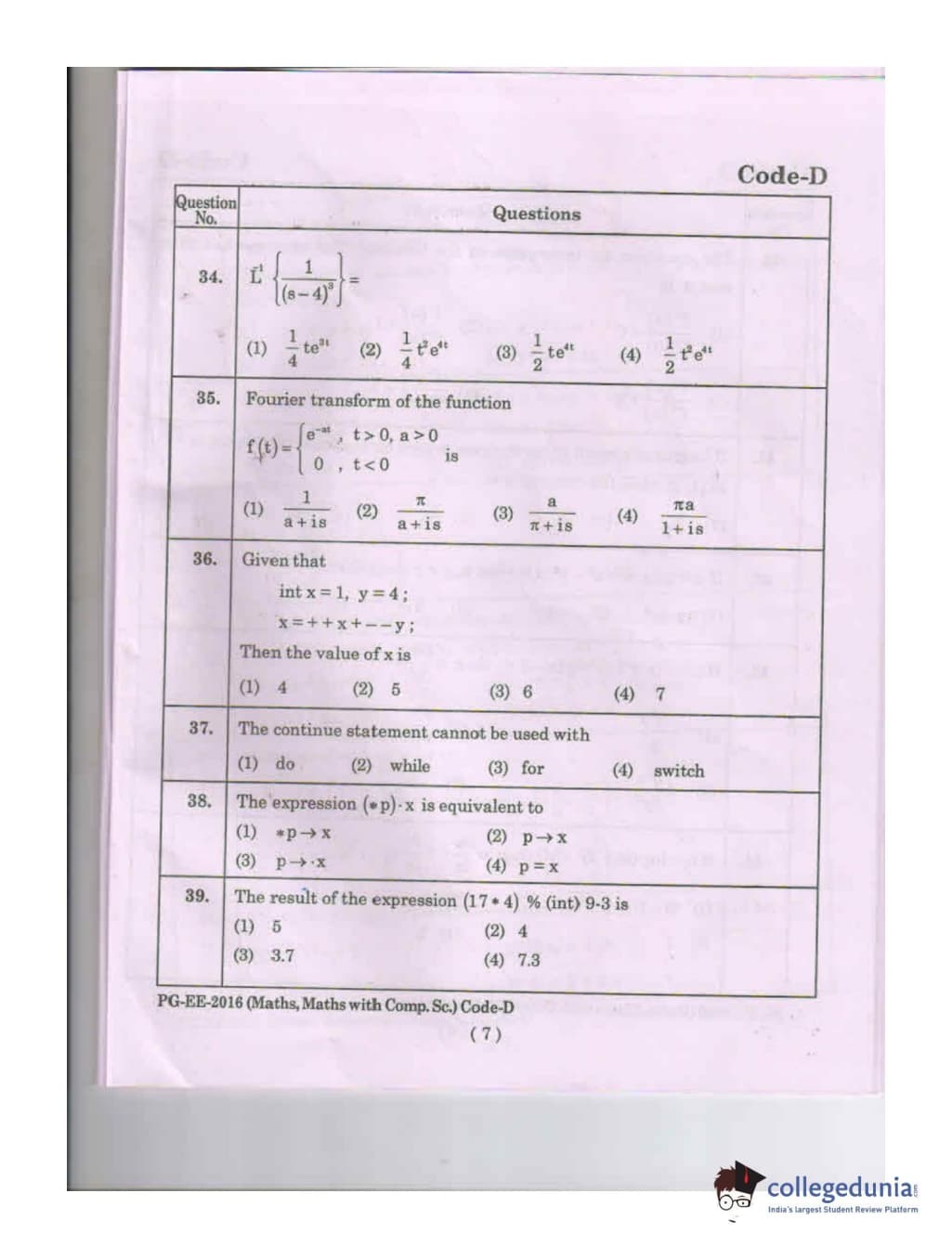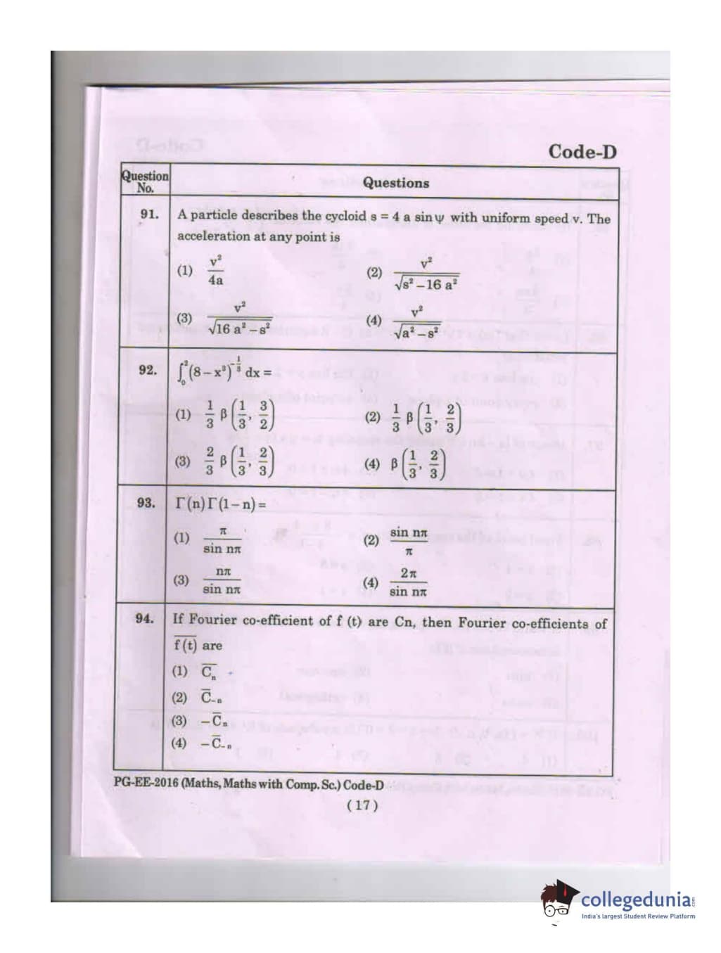 MDUCEE 2016 Math, Math With Computer Science Set D Question Paper with Answer Key PDFs