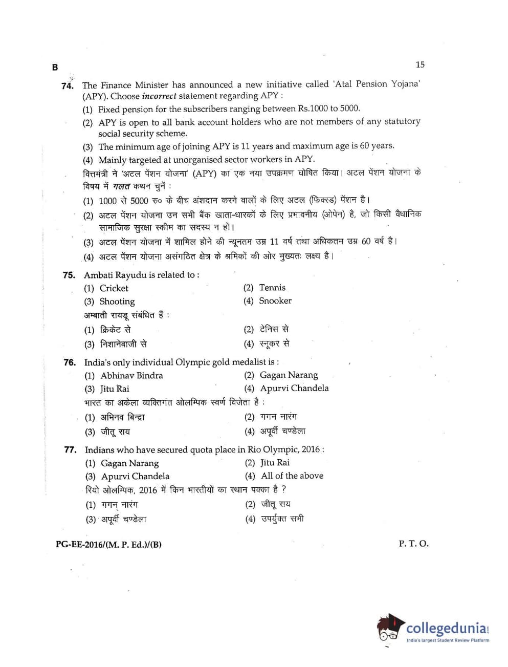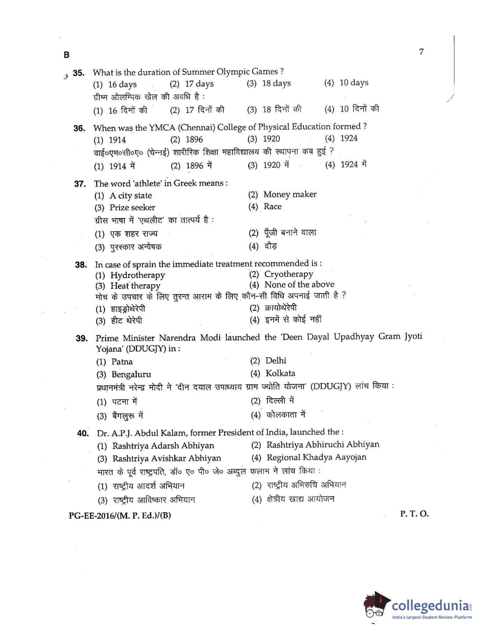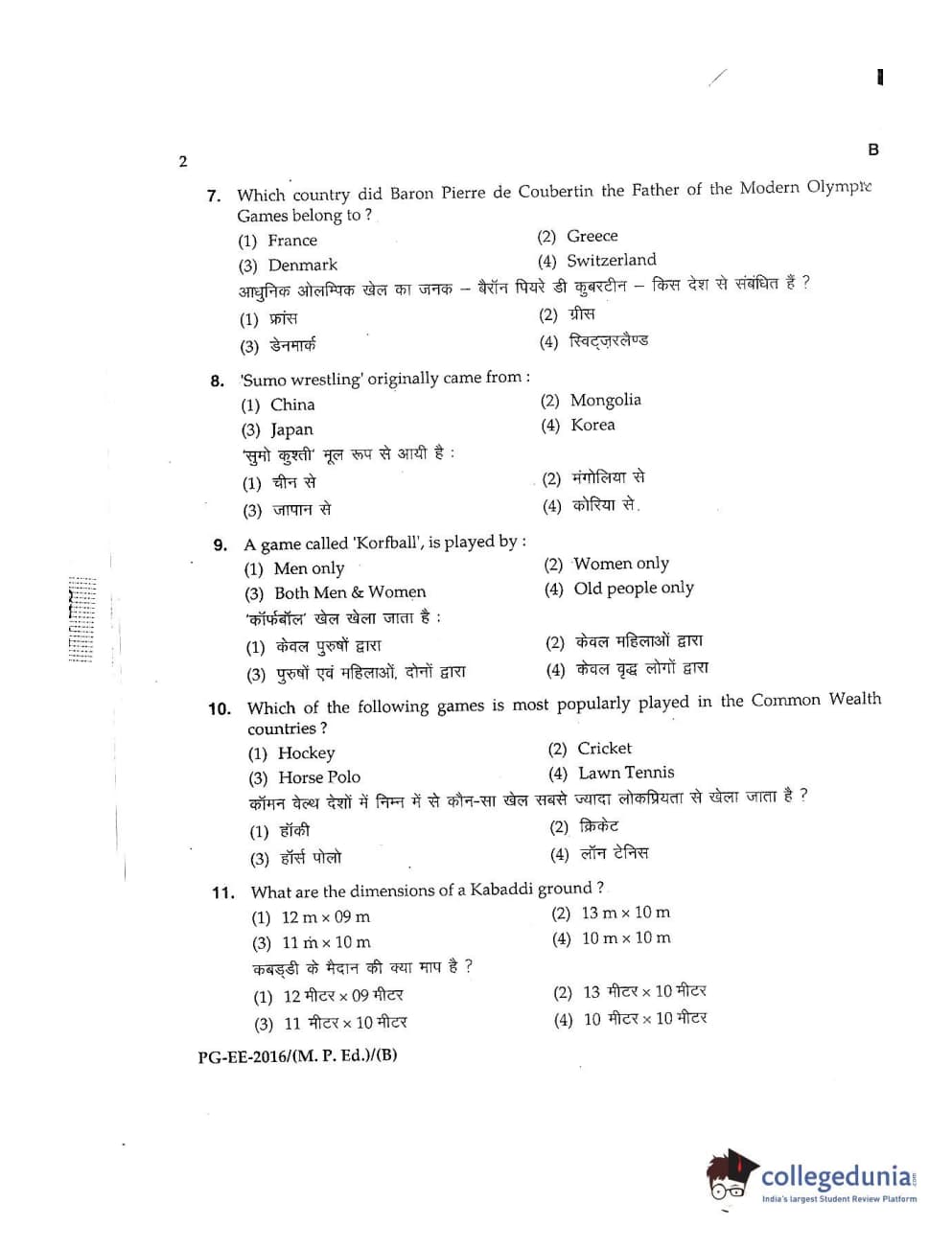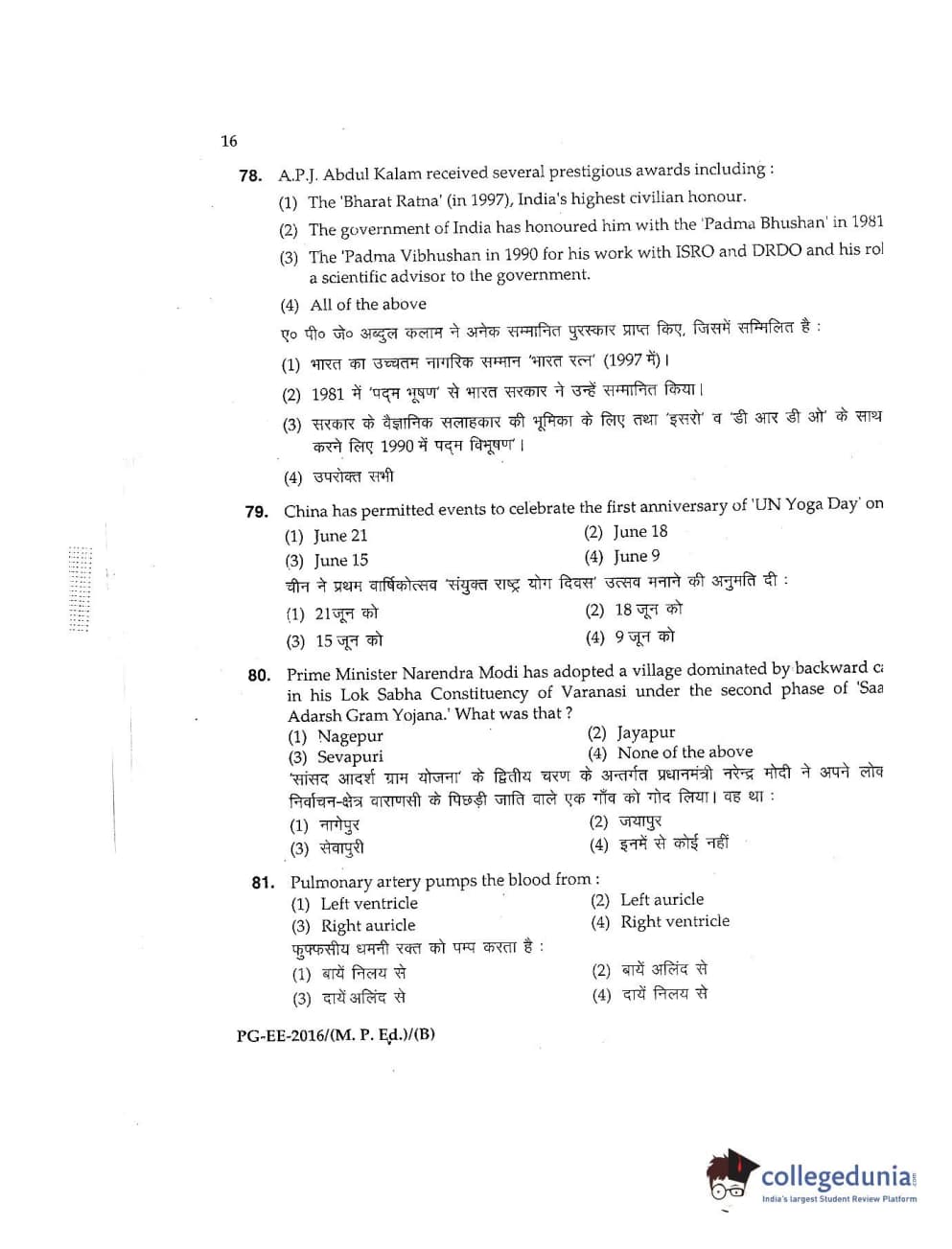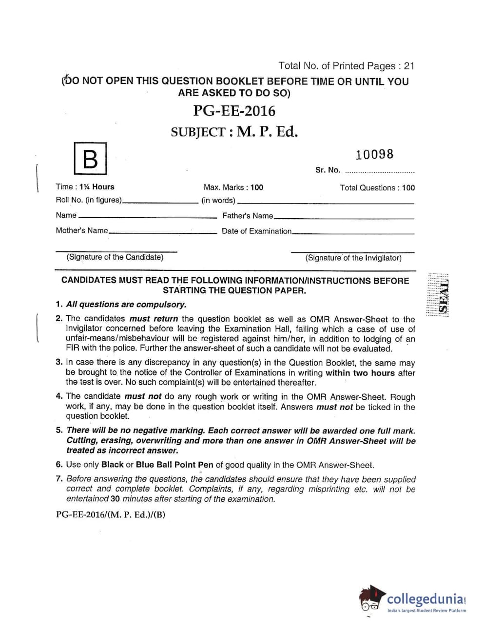 MDUCEE 2016 M.P.Ed. Set B Question Paper with Answer Key PDFs