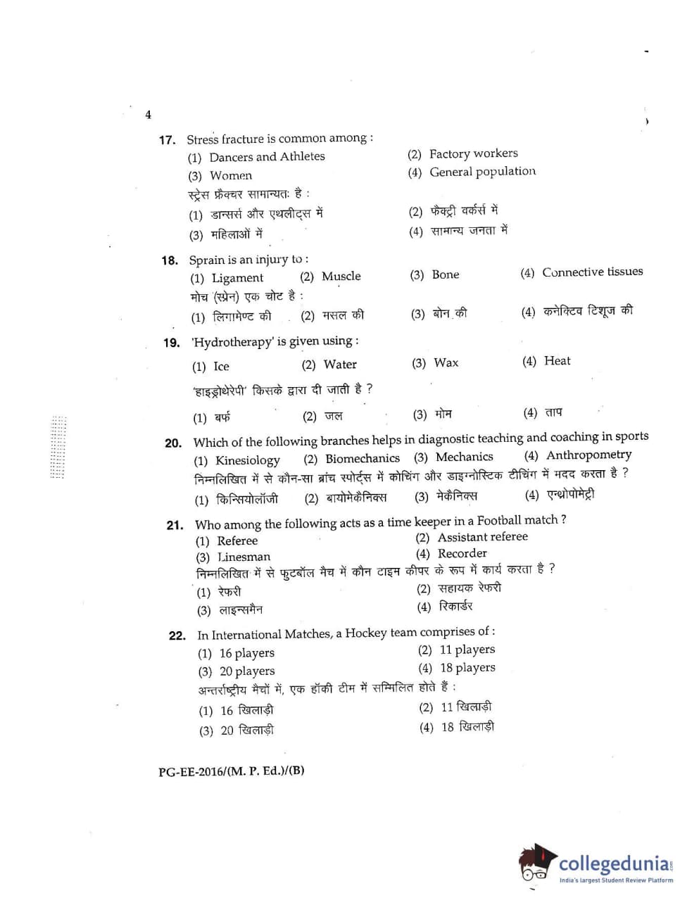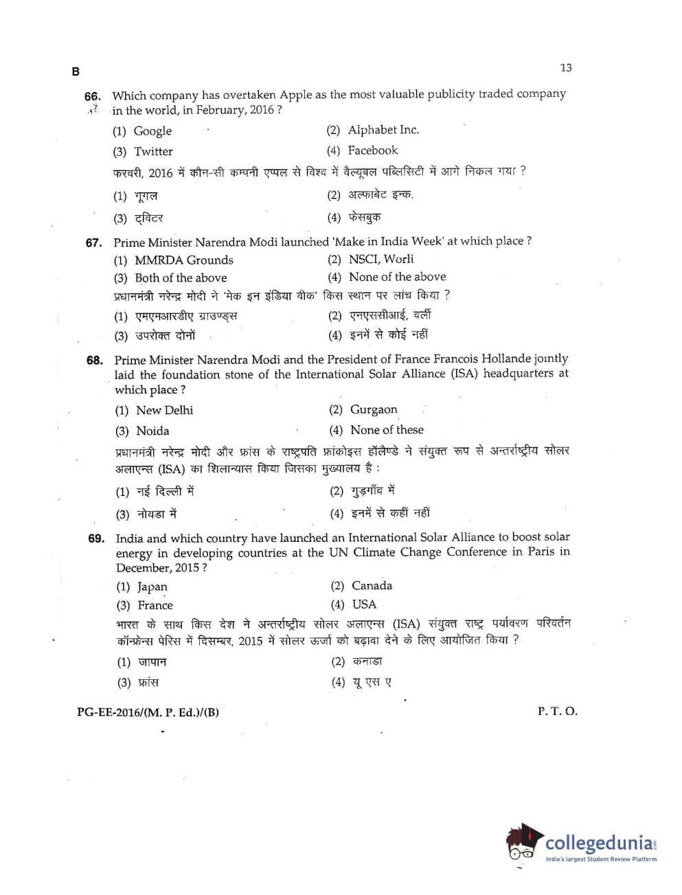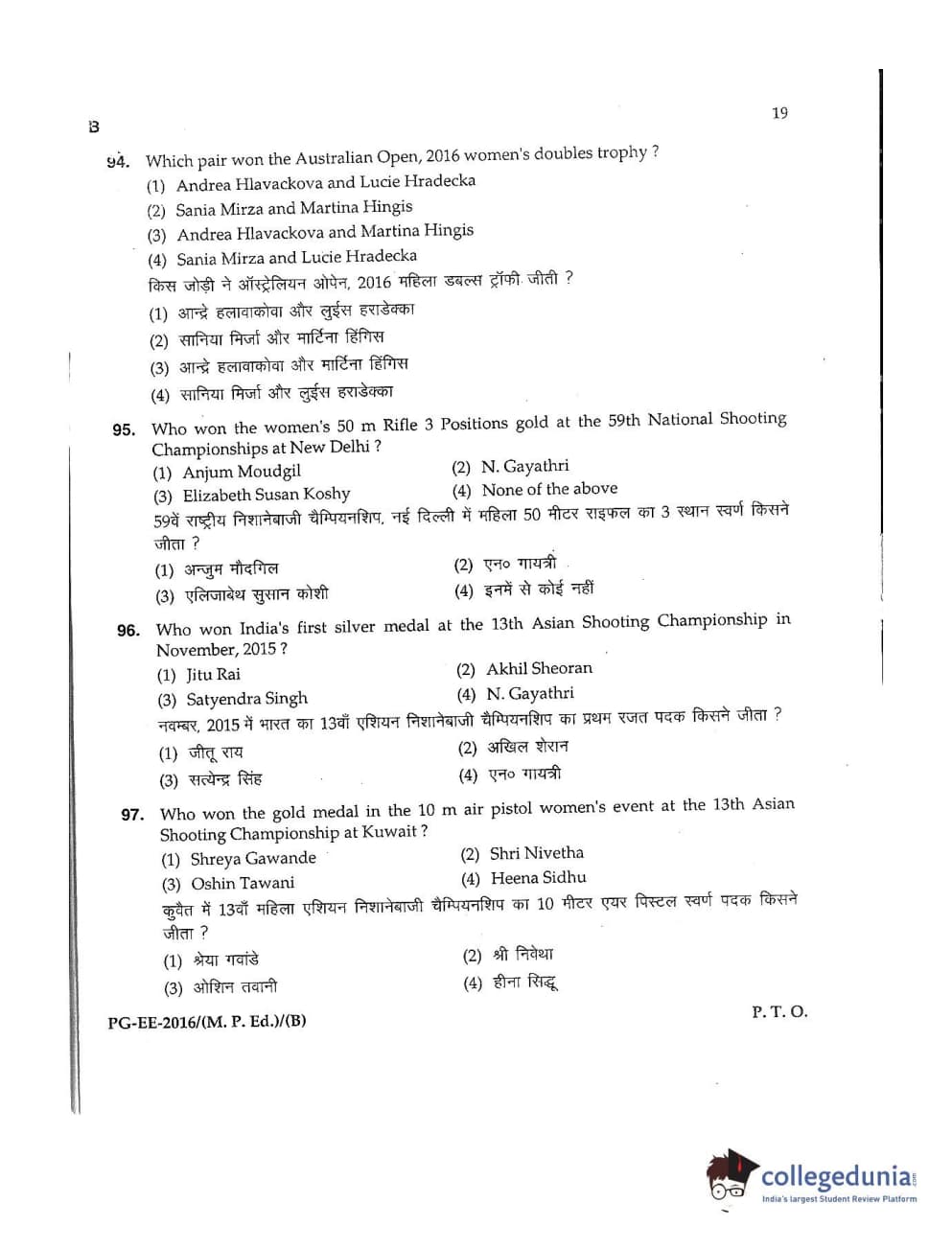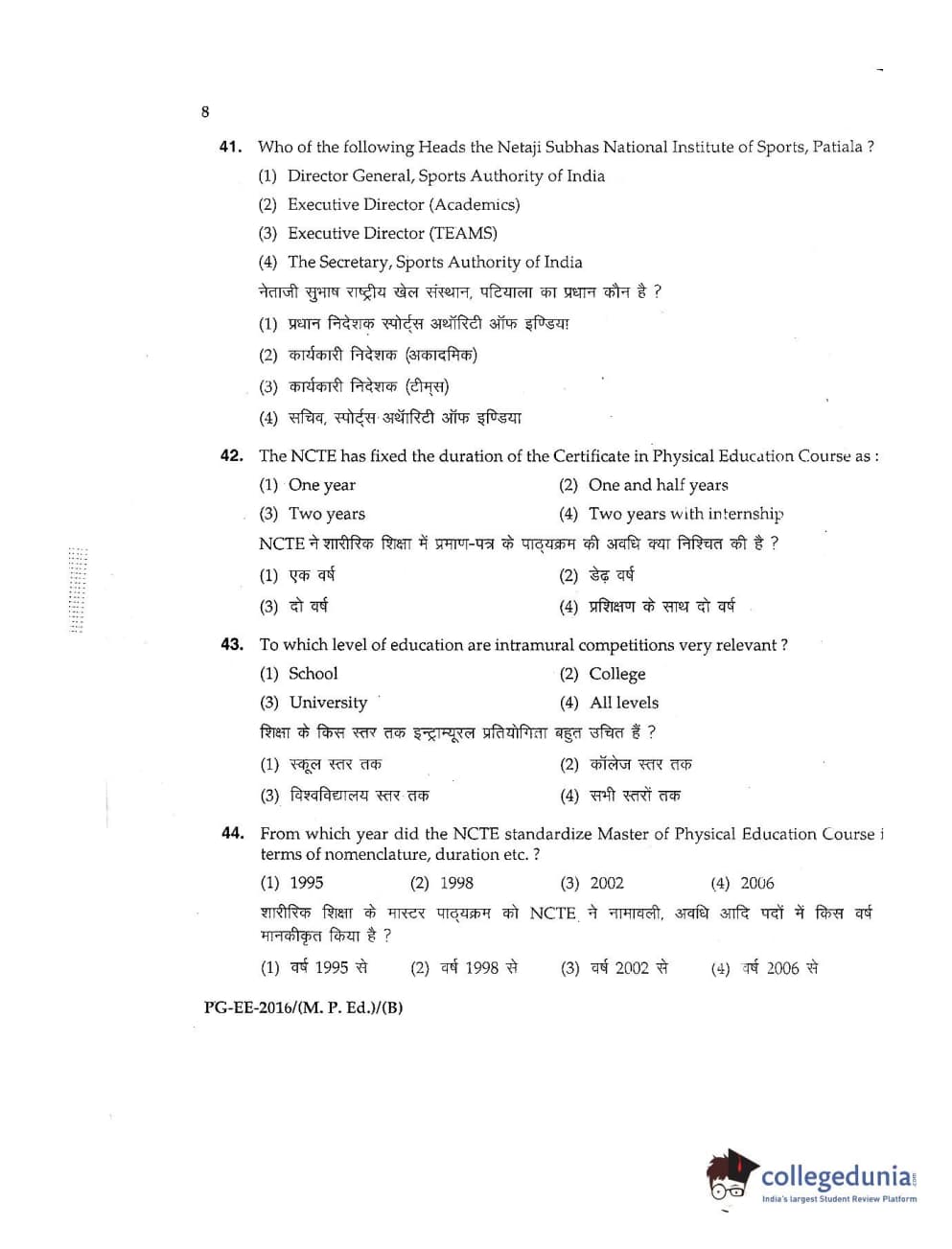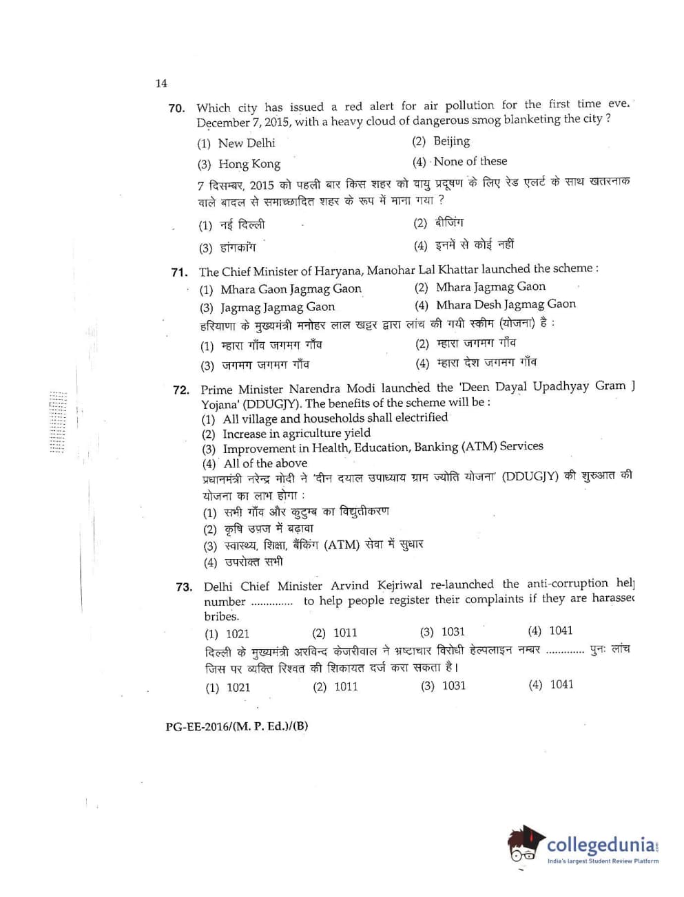 MDUCEE 2016 M.P.Ed. Set B Question Paper with Answer Key PDFs