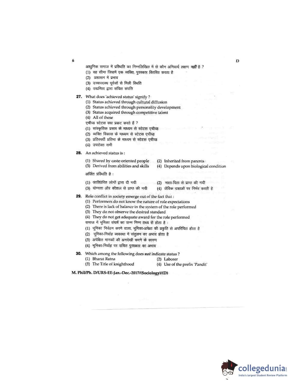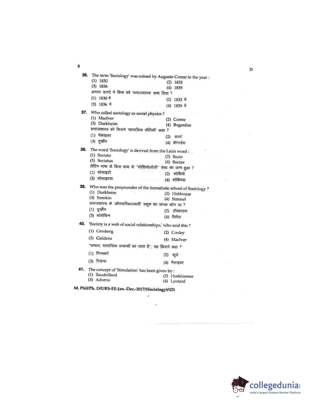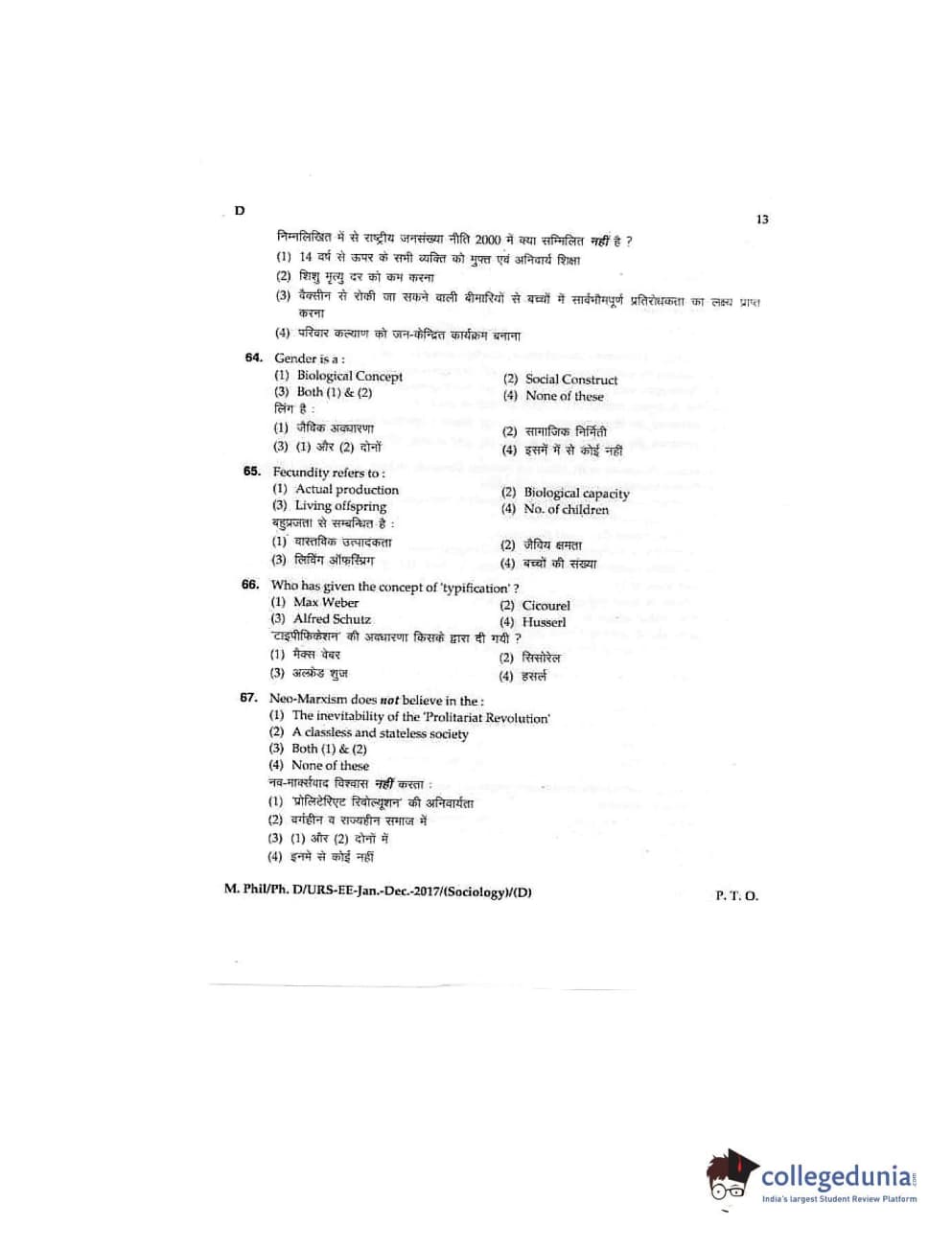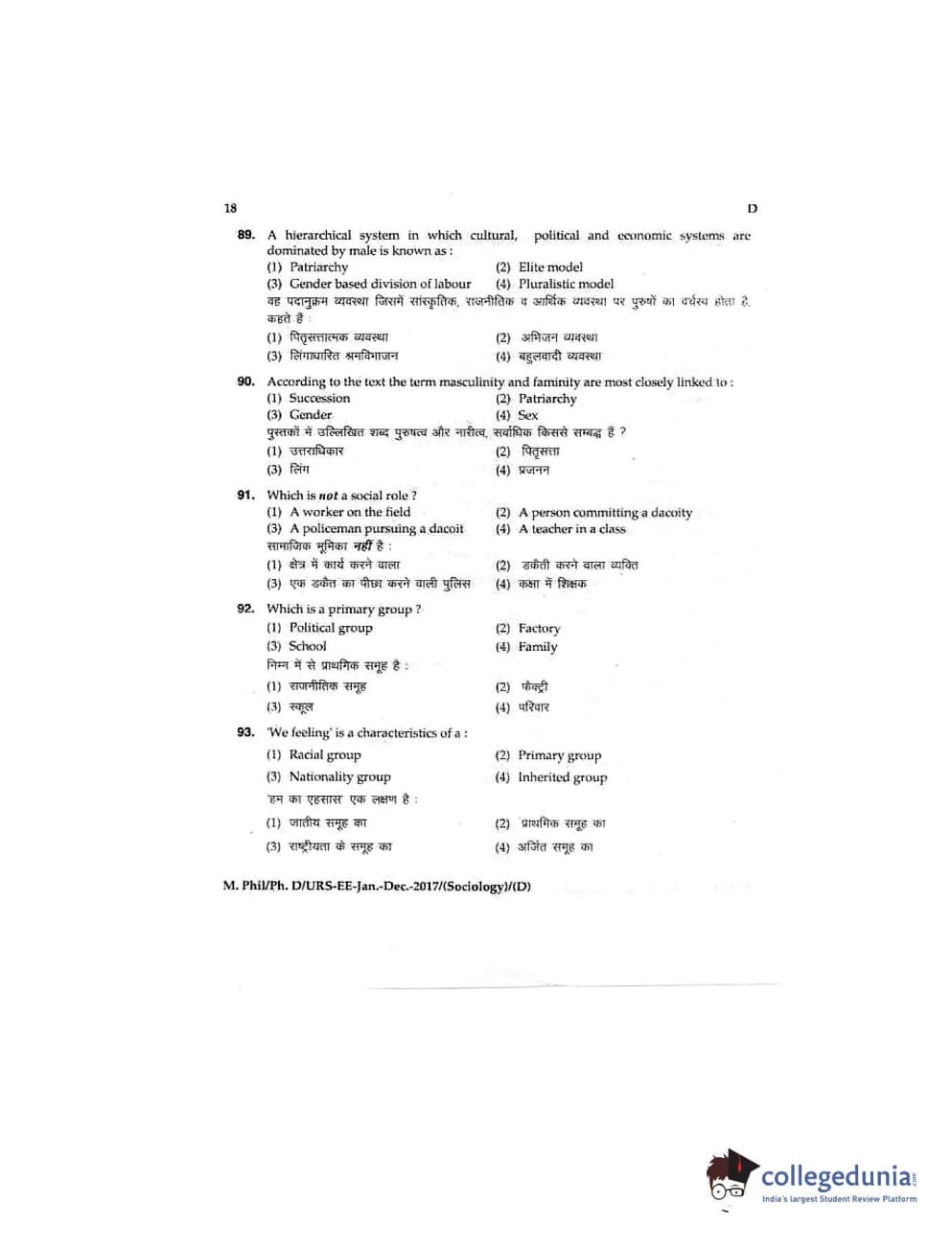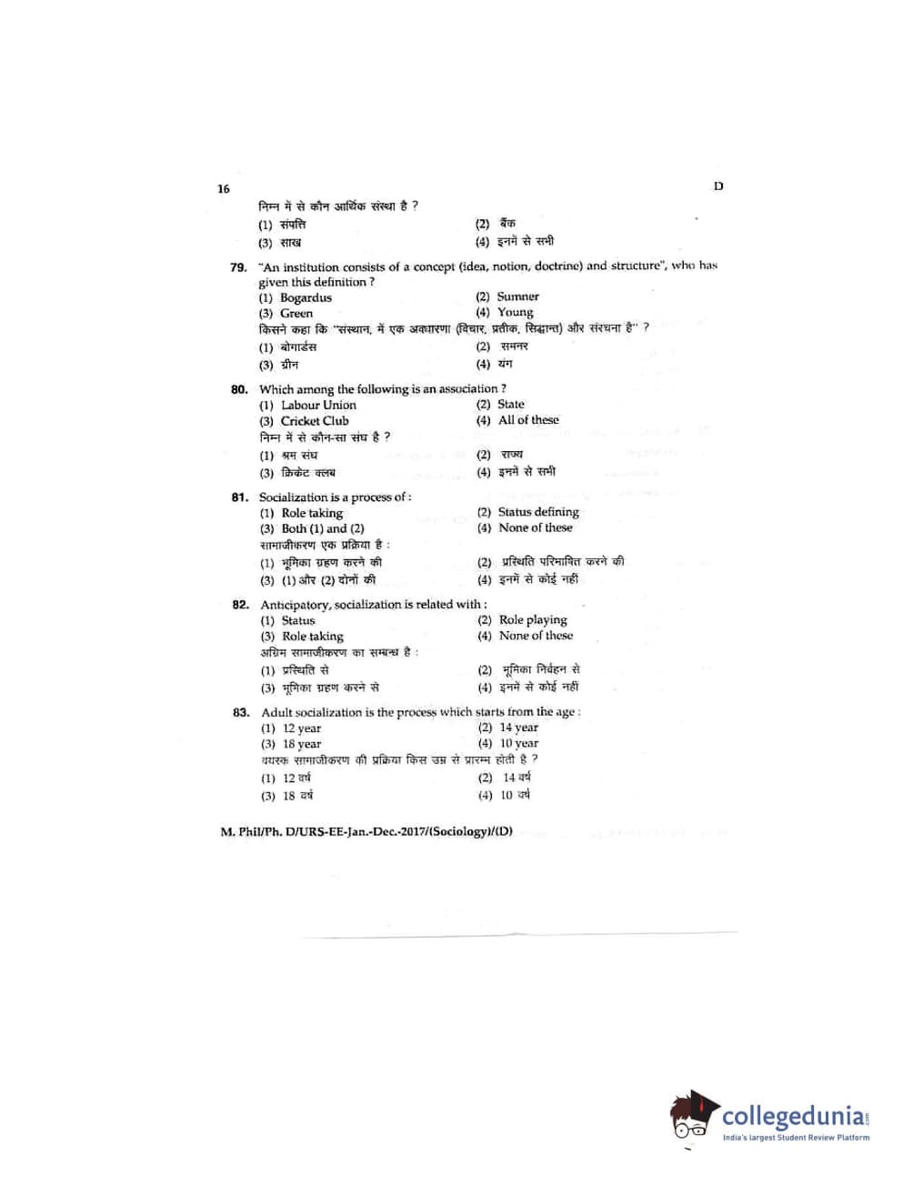 MDUCEE 2016 M.Phil./Ph.D./URS Sociology Set D Question Paper with Answer Key PDFs