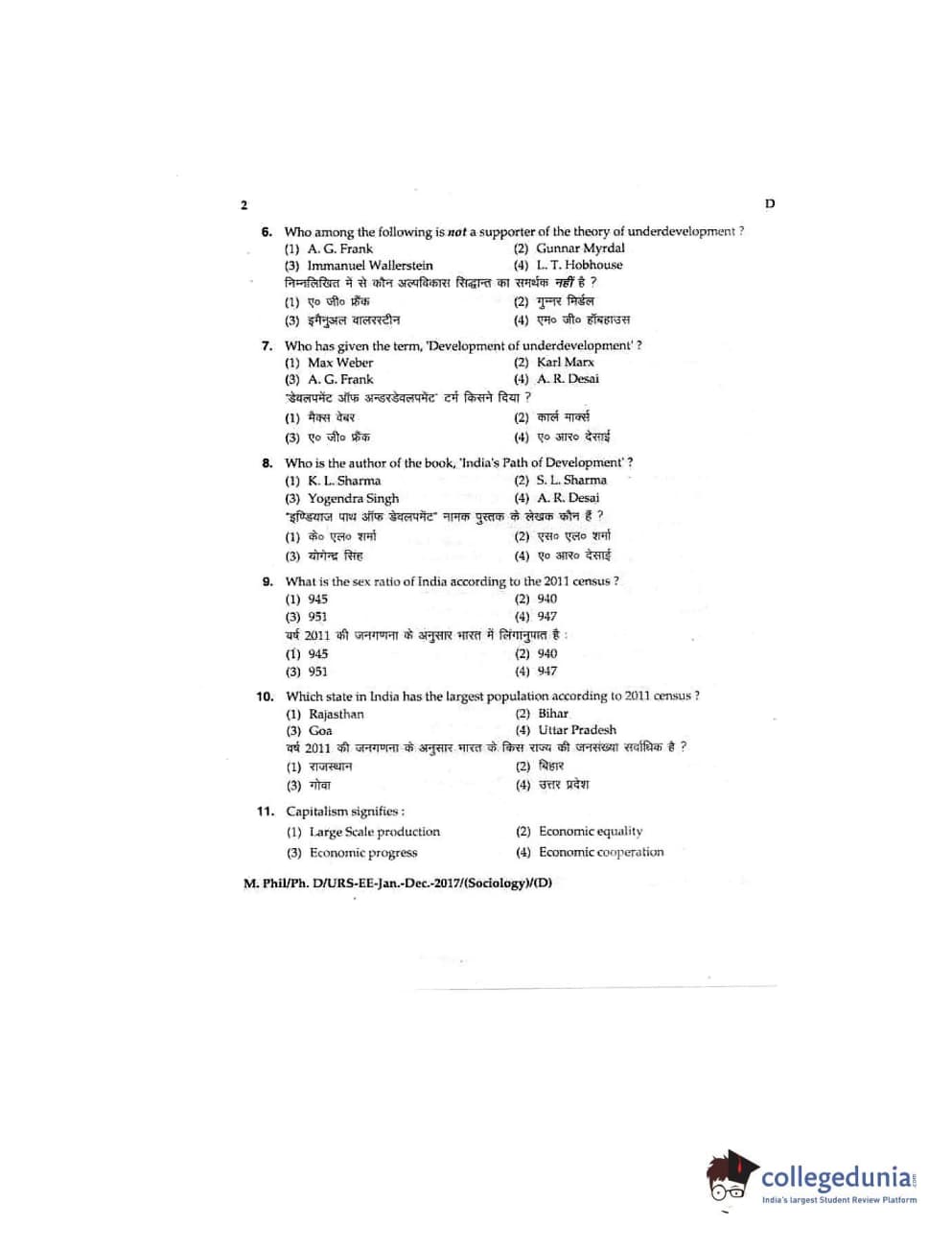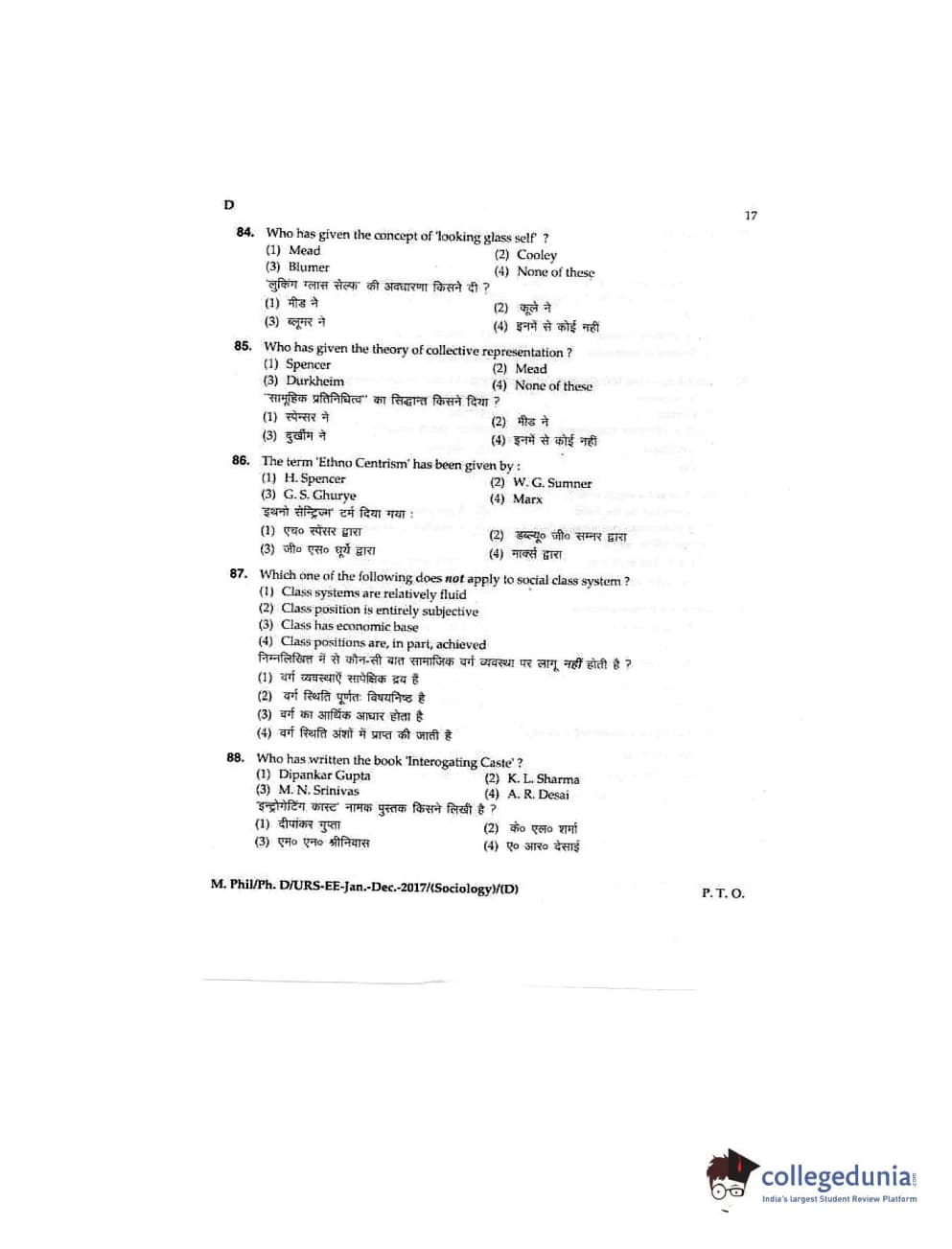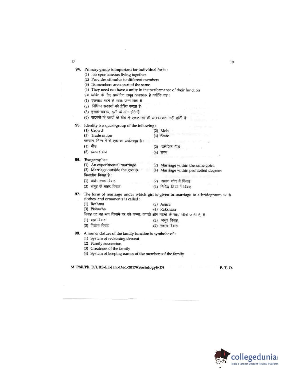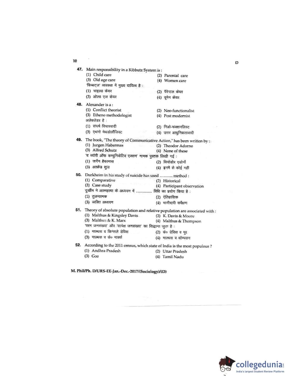 MDUCEE 2016 M.Phil./Ph.D./URS Sociology Set D Question Paper with Answer Key PDFs