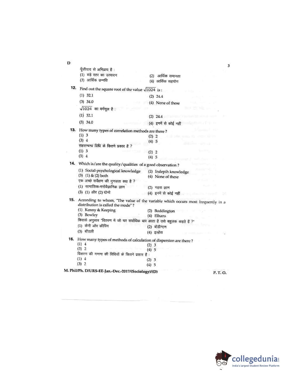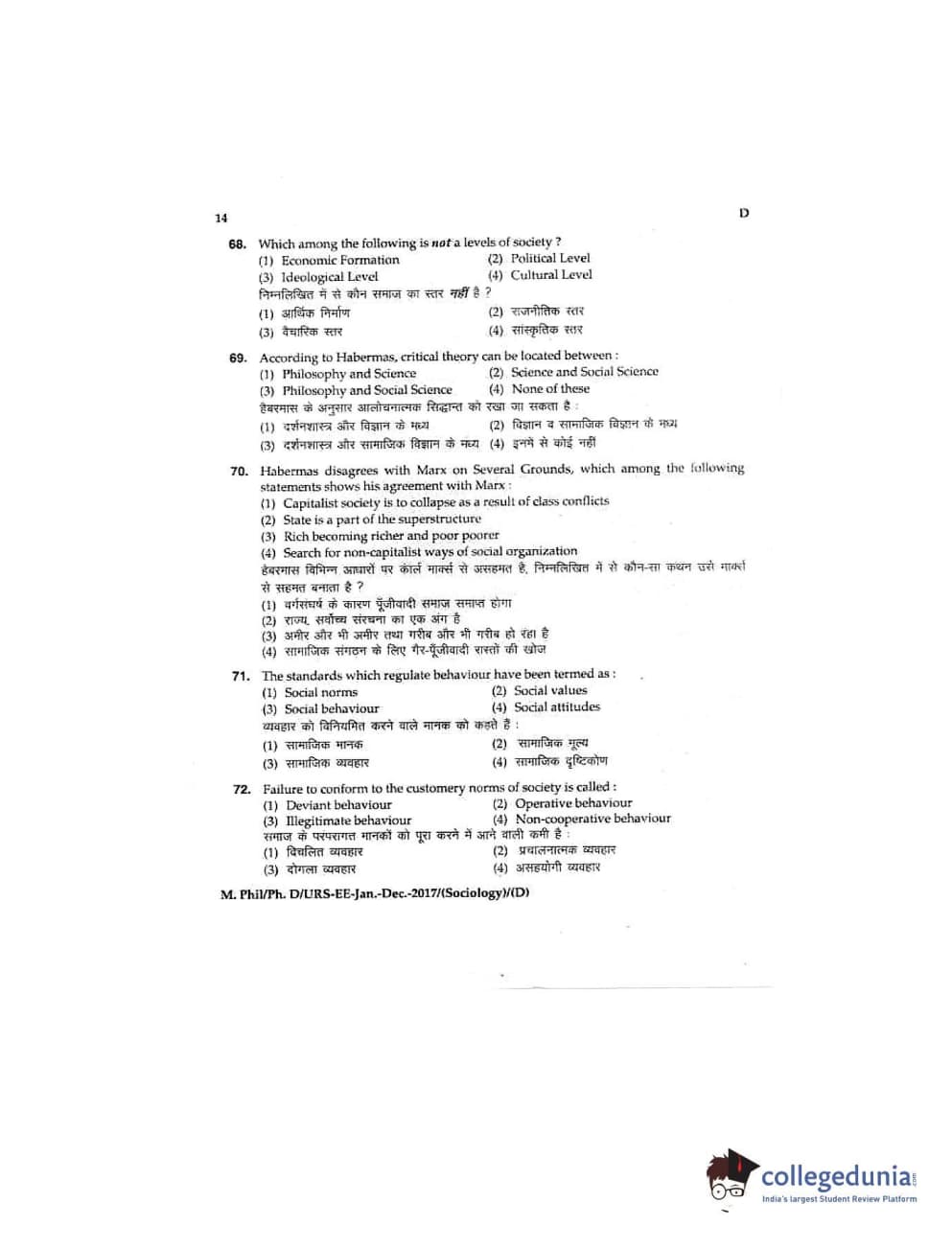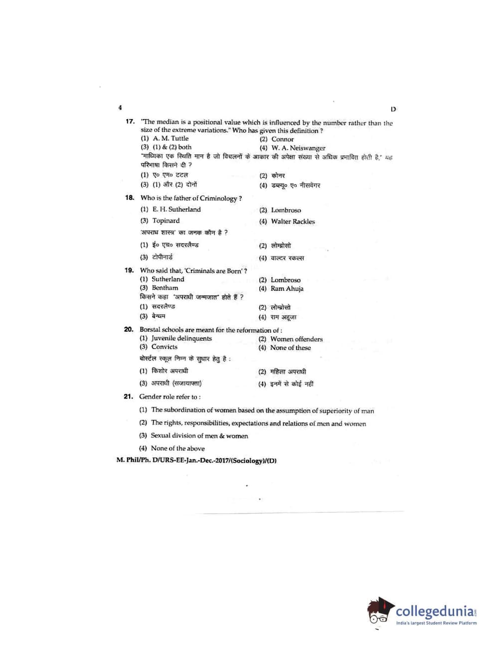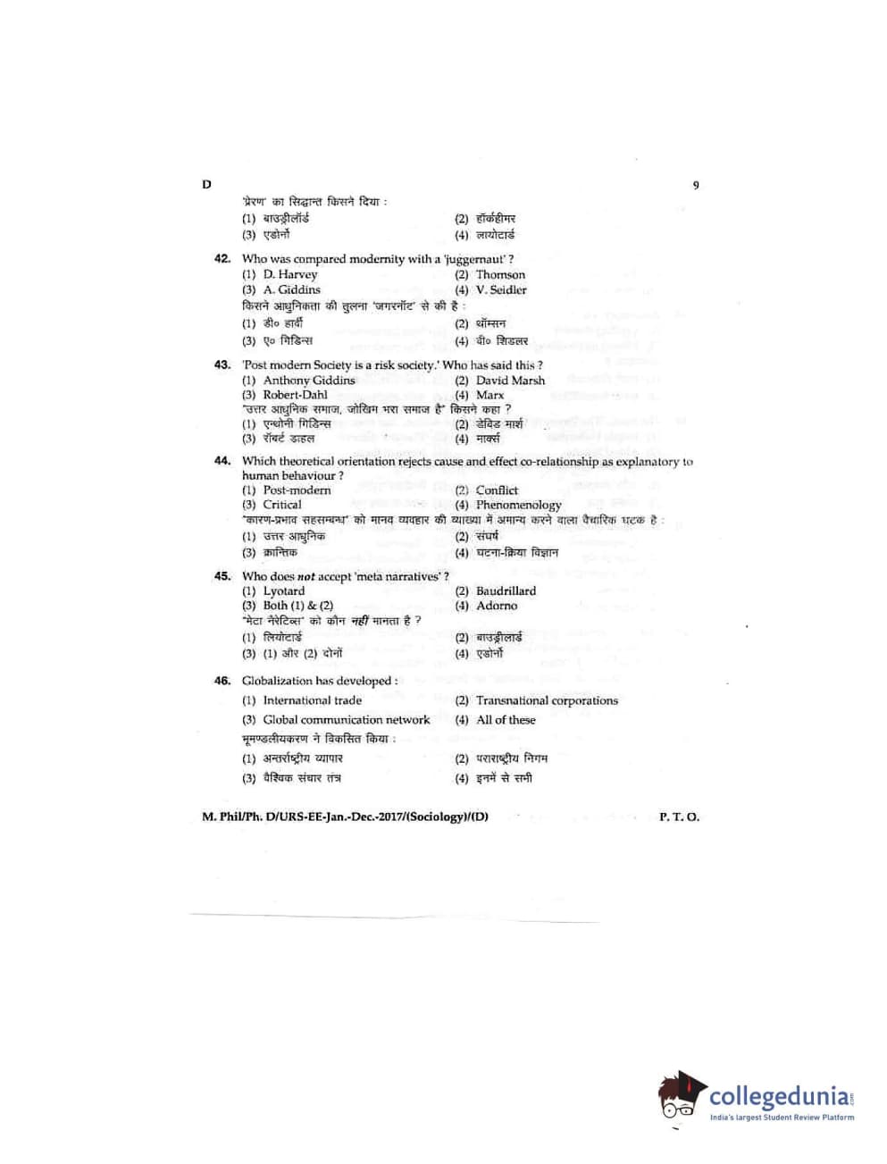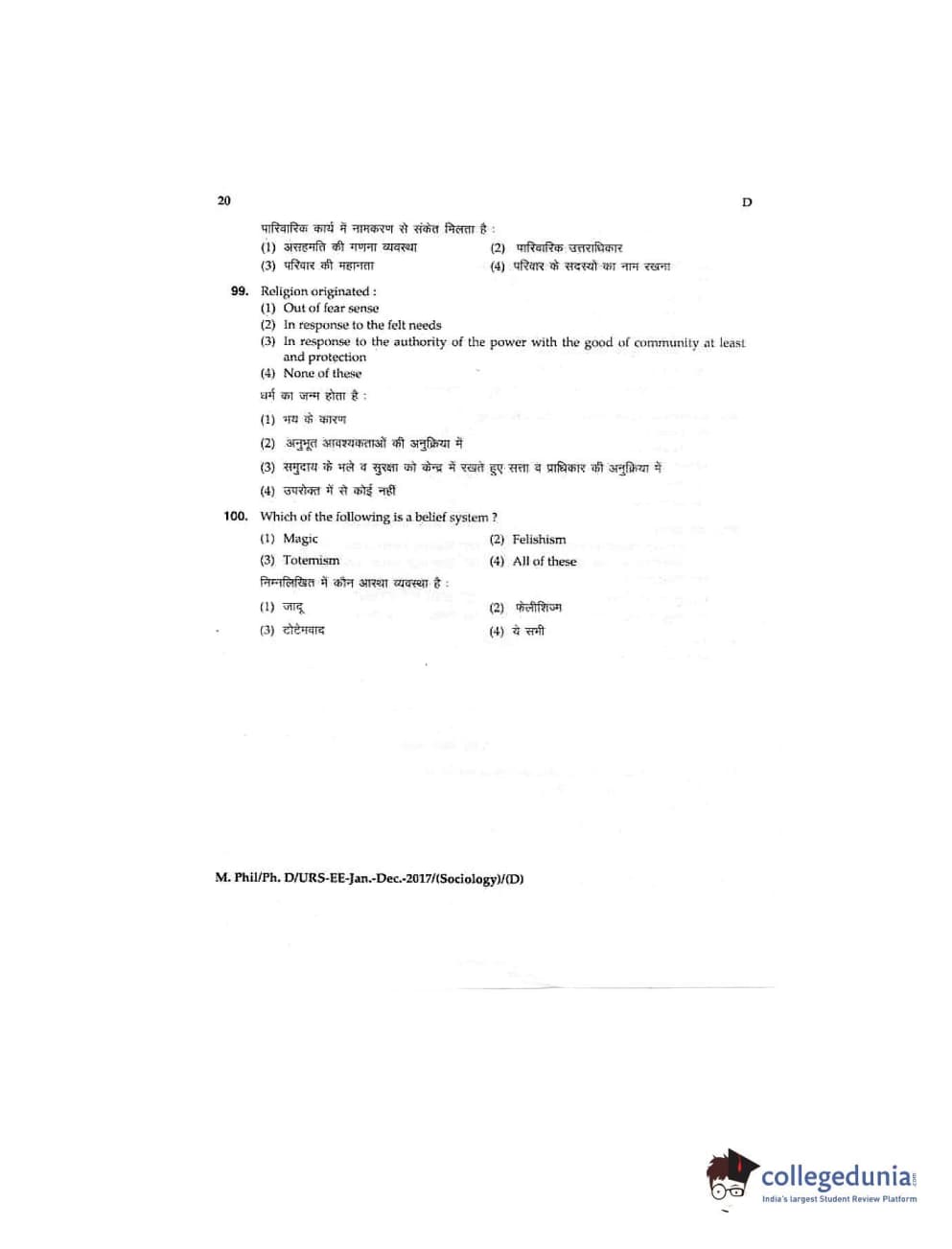 MDUCEE 2016 M.Phil./Ph.D./URS Sociology Set D Question Paper with Answer Key PDFs