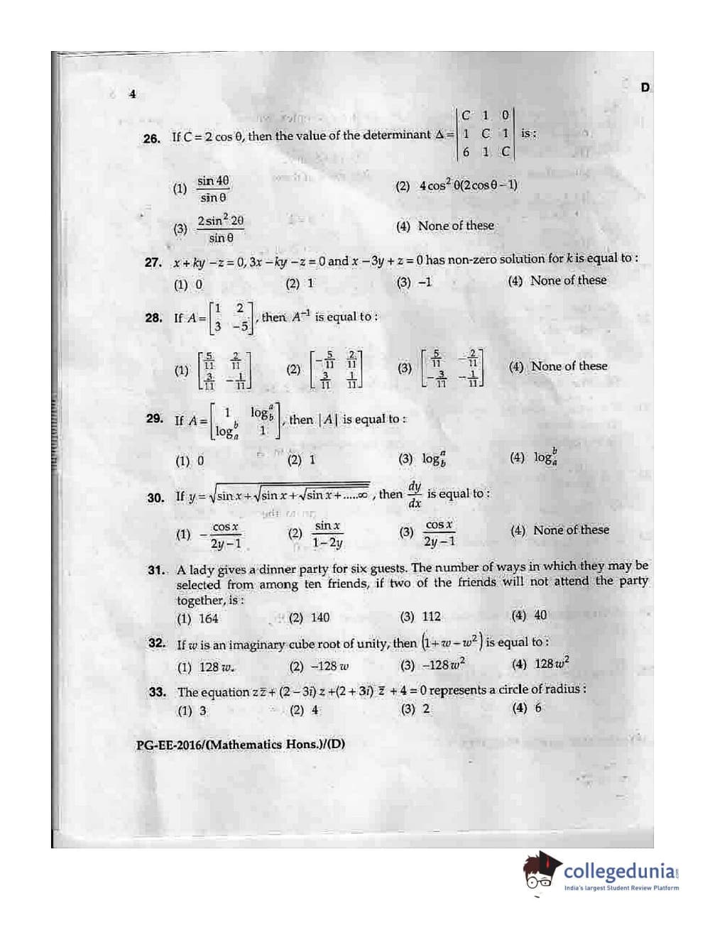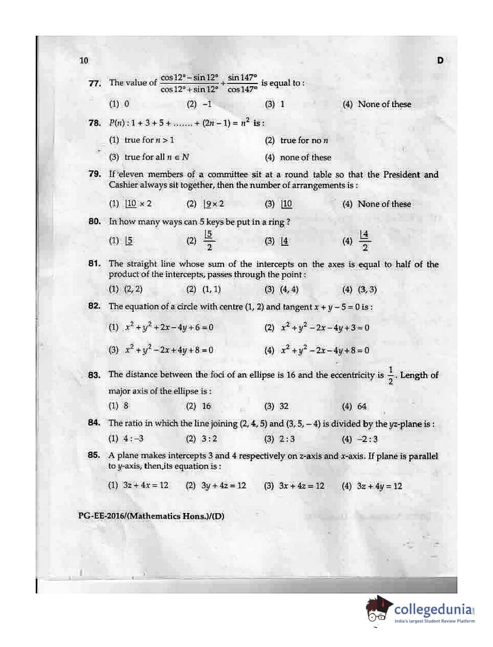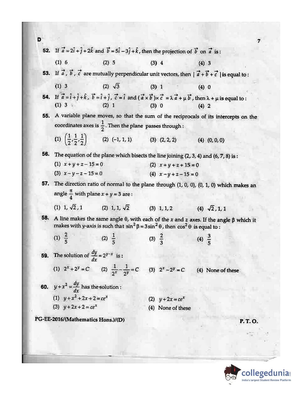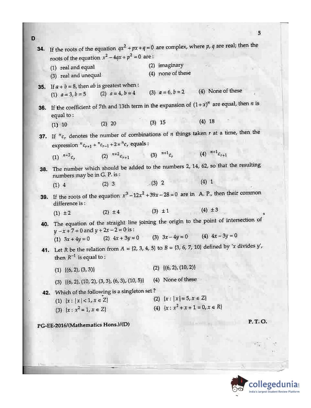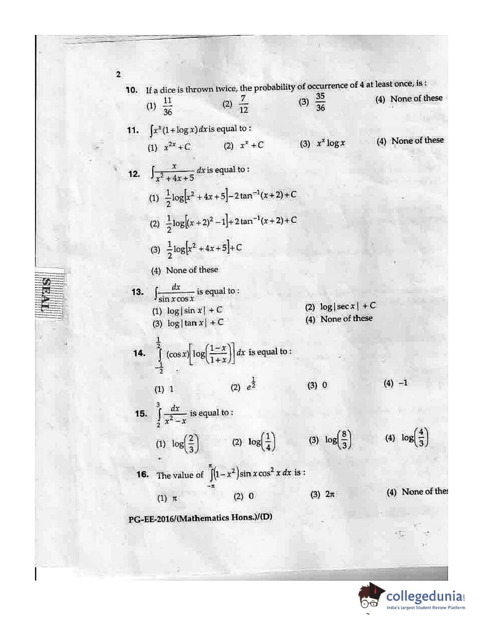 MDUCEE 2016 M.Sc. (Hons.) Mathematics 5-Years Integrated Set D Question Paper with Answer Key PDFs