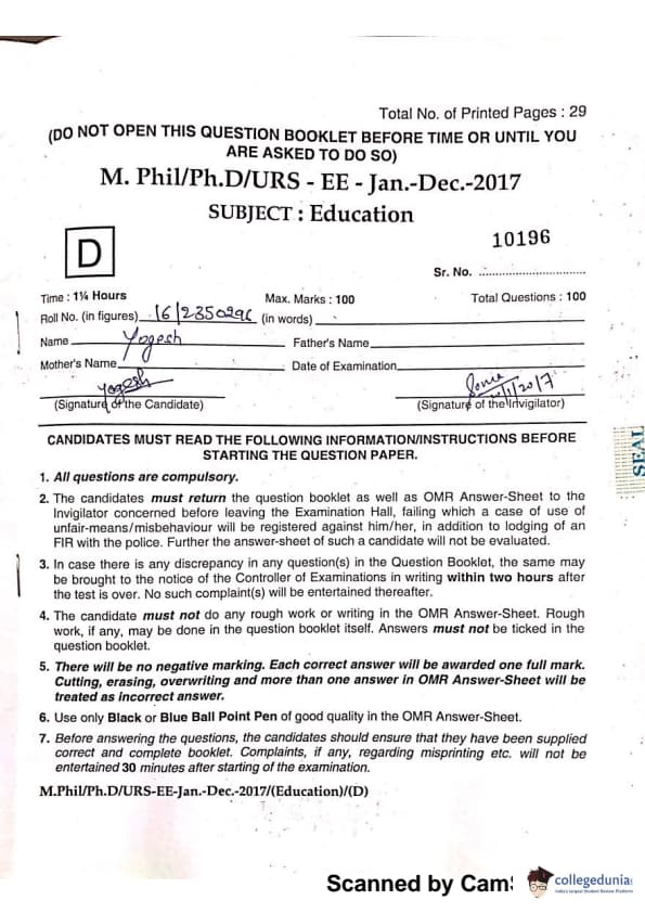 MDUCEE 2016 Ph.D/URS/M.Phil (Education) Set D Question paper with answer key pdf is available for download. The exam was successfully organized by Maharishi Dayanand University. The question paper comprised a total of 100 questions.