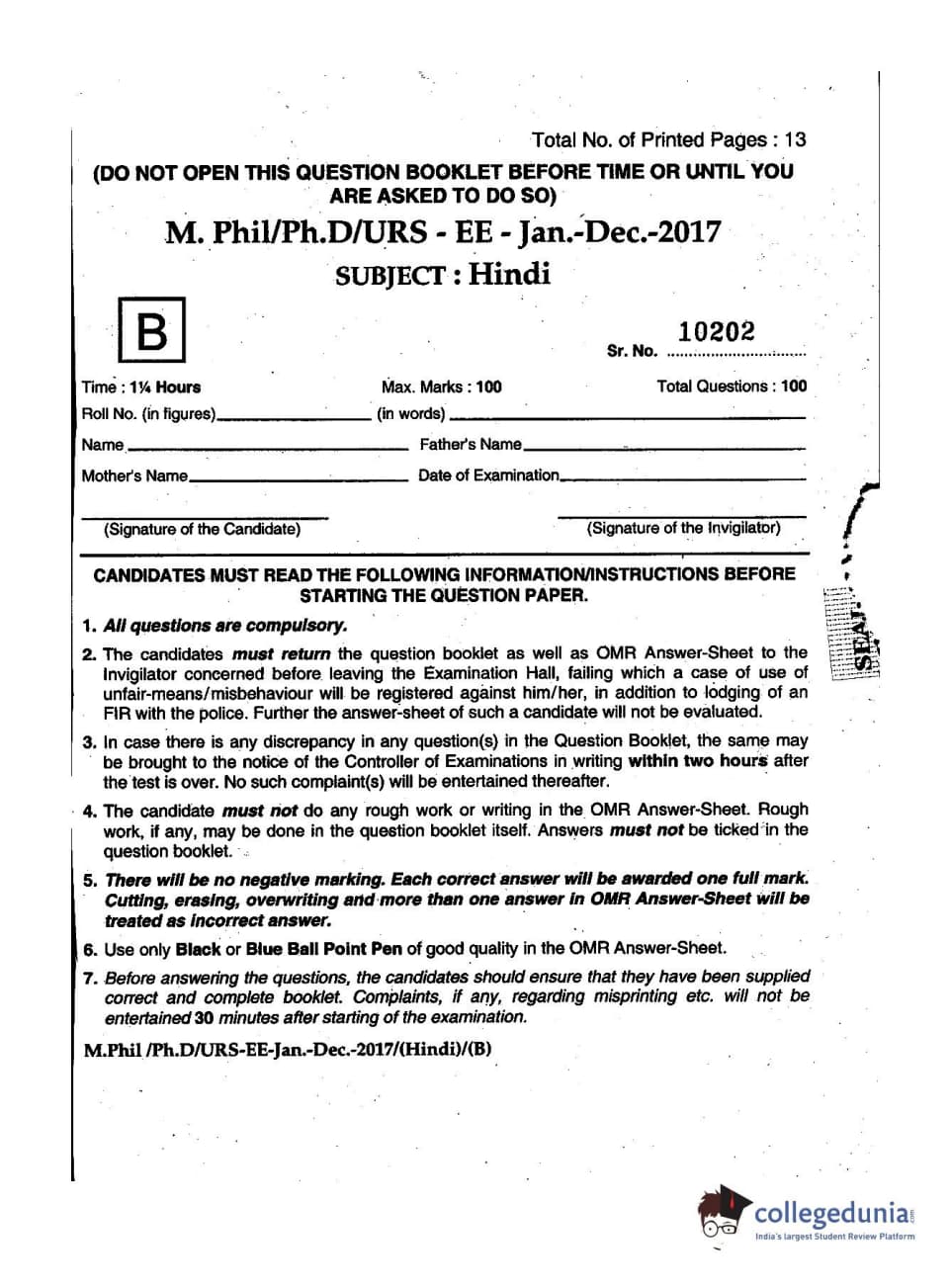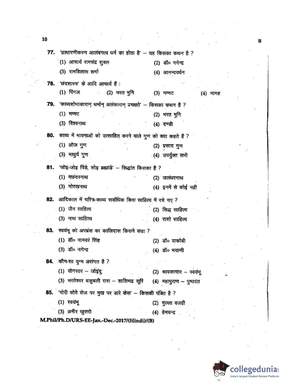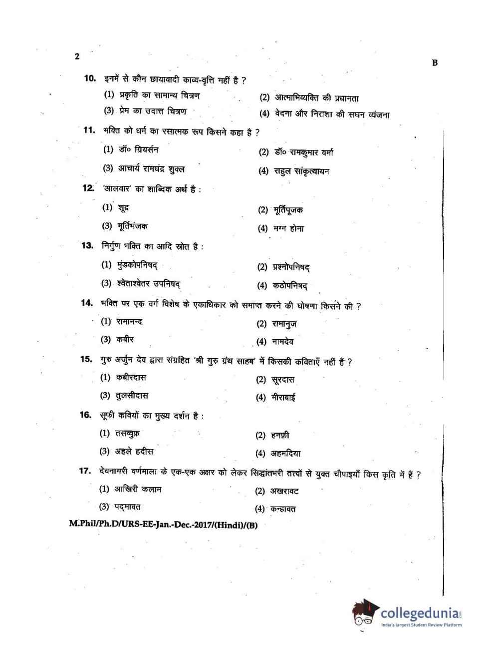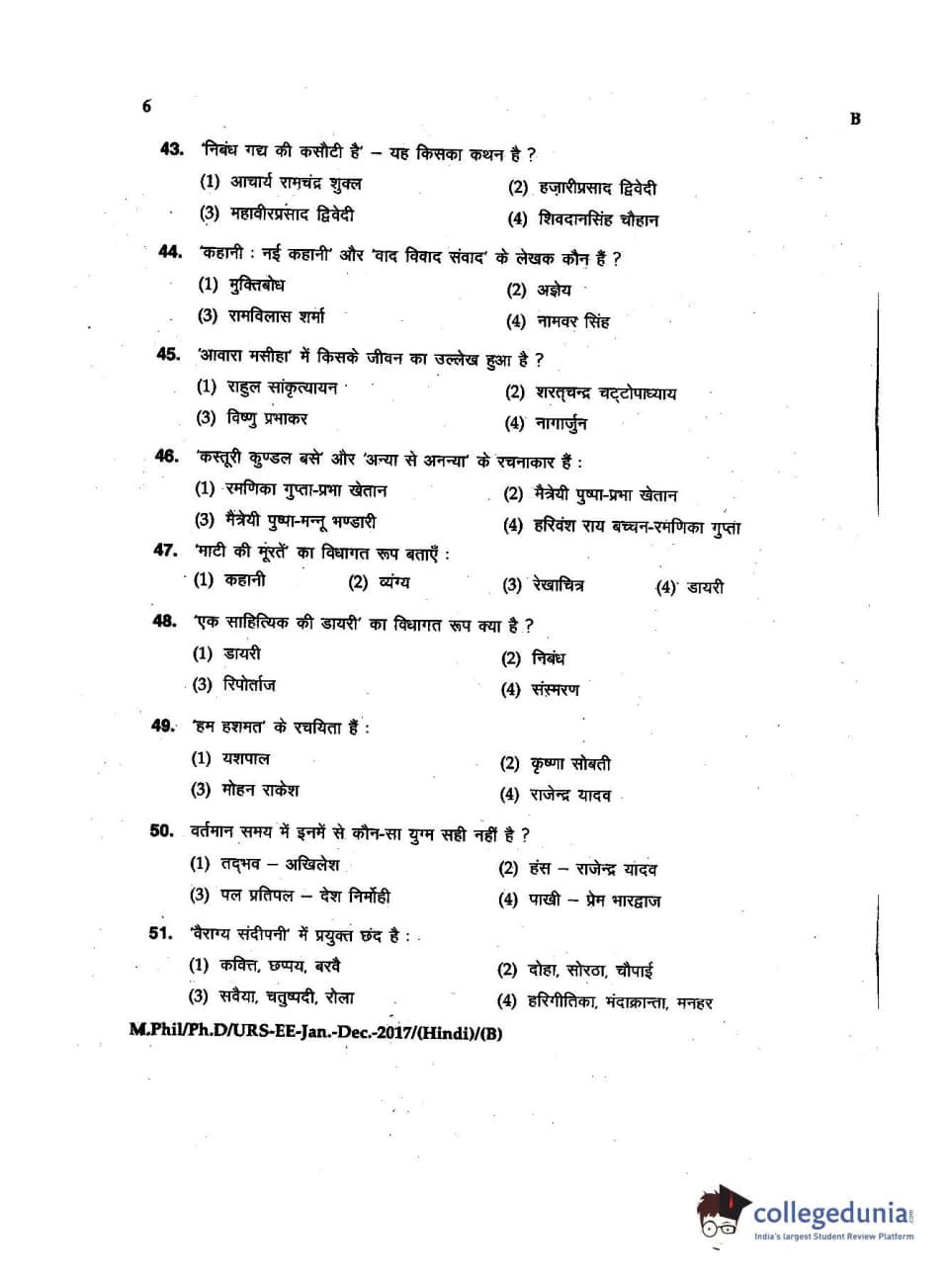 MDUCEE 2016 Ph.D/URS/M.Phil (Hindi) Set B Question Paper with Answer Key PDFs