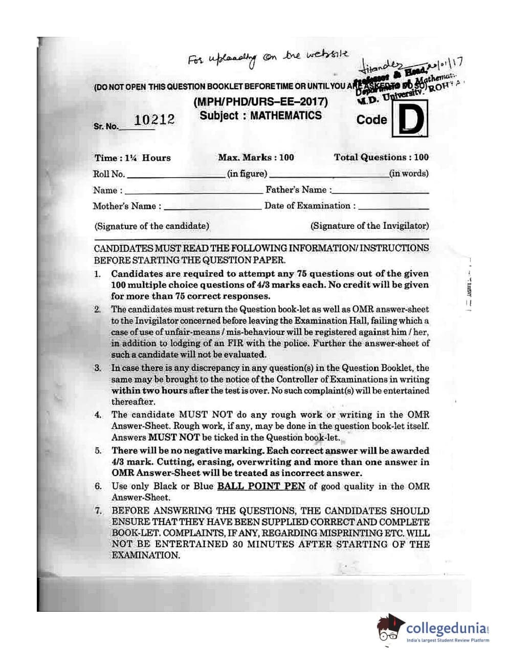 MDUCEE 2016 Ph.D/URS/M.Phil (Mathematics) Set D Question paper with answer key pdf is available for download. The exam was successfully organized by Maharishi Dayanand University. The question paper comprised a total of 100 questions.