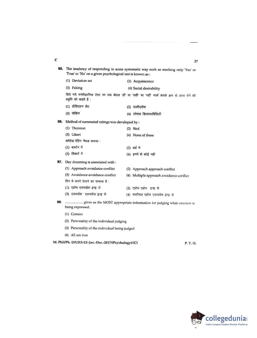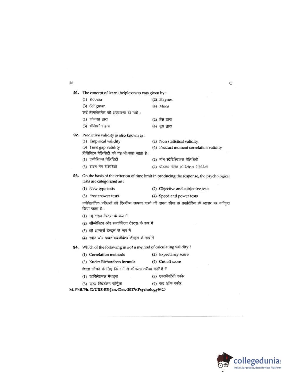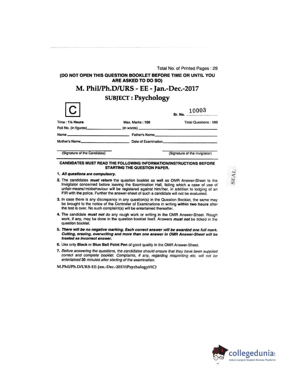 MDUCEE 2016 Ph.D/URS/M.Phil (Psychology) Set C Question paper with answer key pdf is available for download. The exam was successfully organized by Maharishi Dayanand University. The question paper comprised a total of 100 questions.