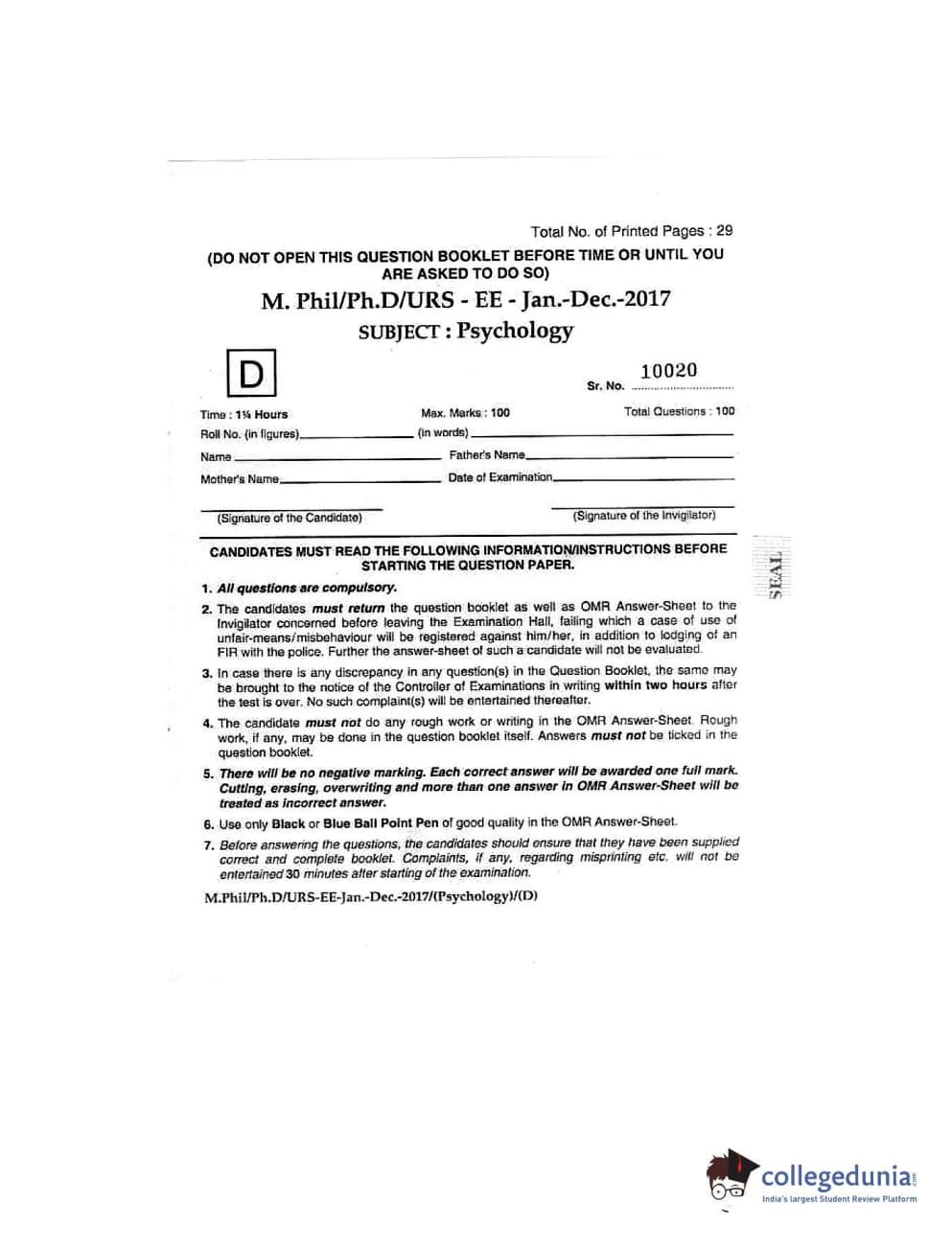 | MDUCEE 2016 Ph.D/URS/M.Phil (Psychology) Set D Question Paper PDF | MDUCEE 2016 Ph.D/URS/M.Phil (Psychology) Set D Answer Key PDF |