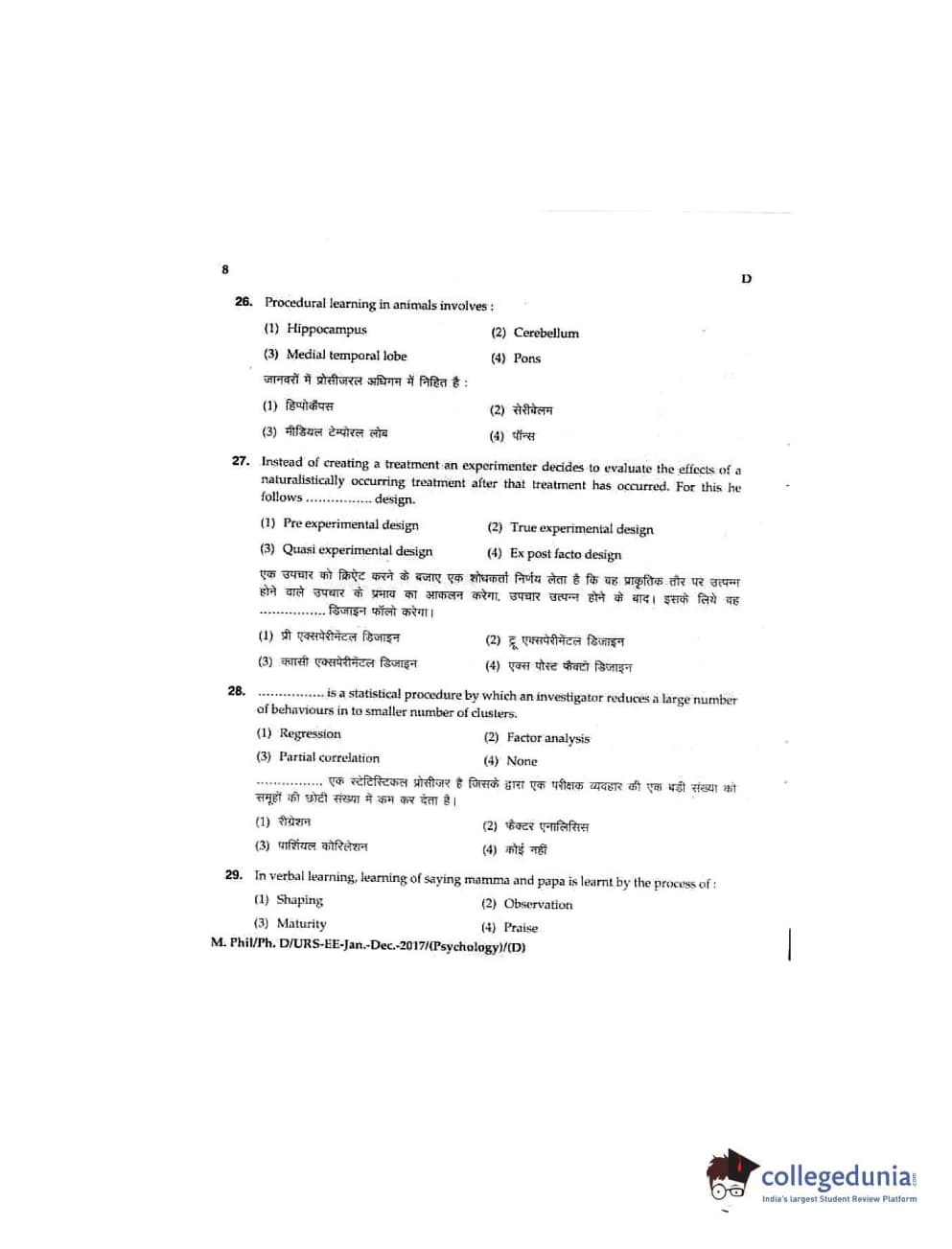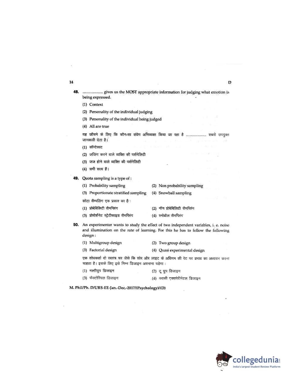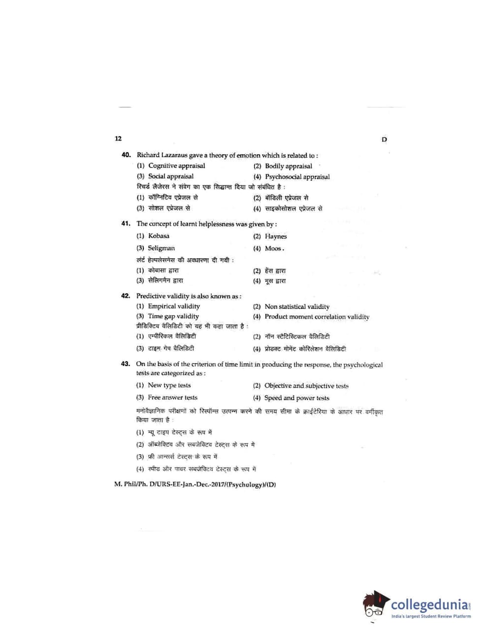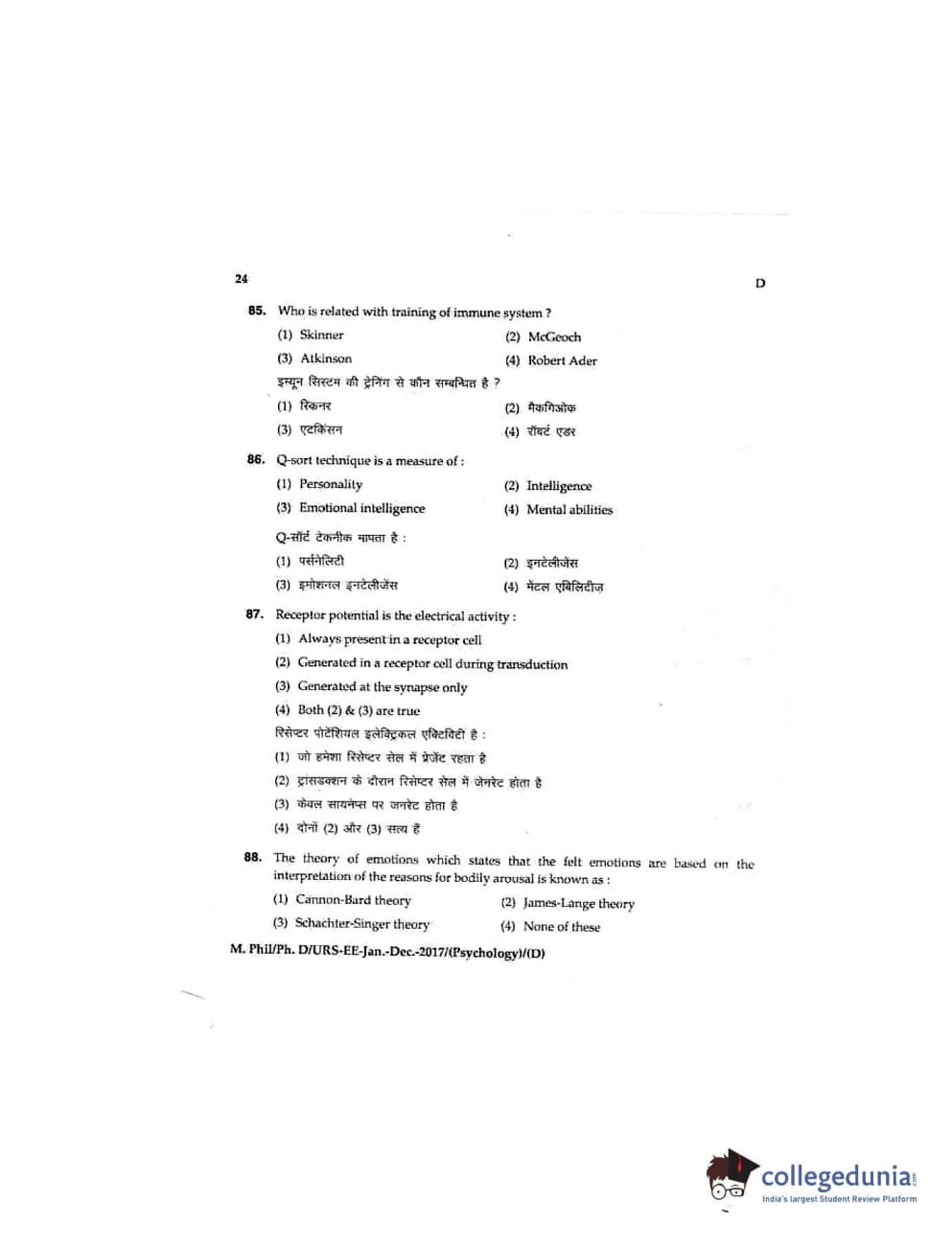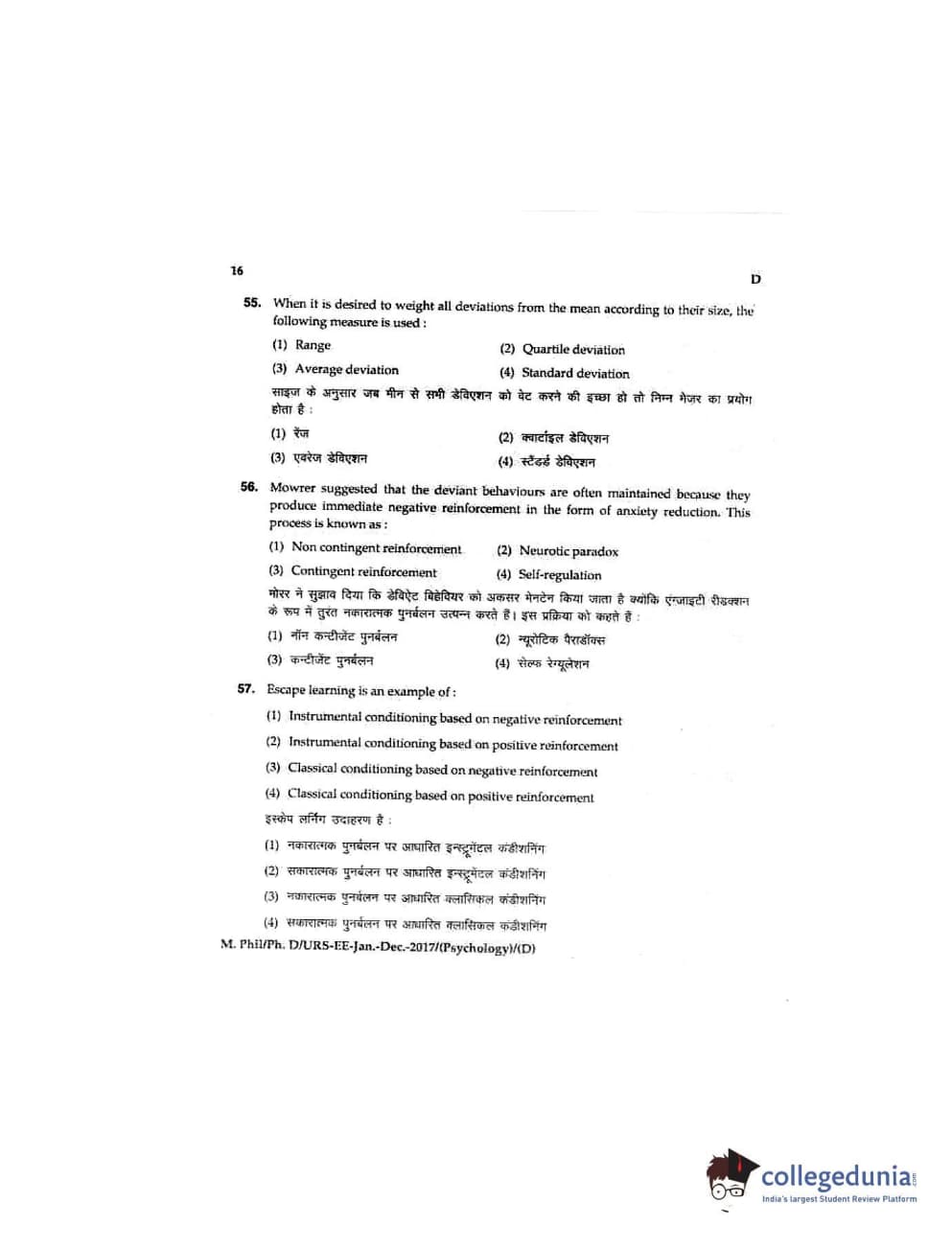 MDUCEE 2016 Ph.D/URS/M.Phil (Psychology) Set D Question Paper with Answer Key PDFs