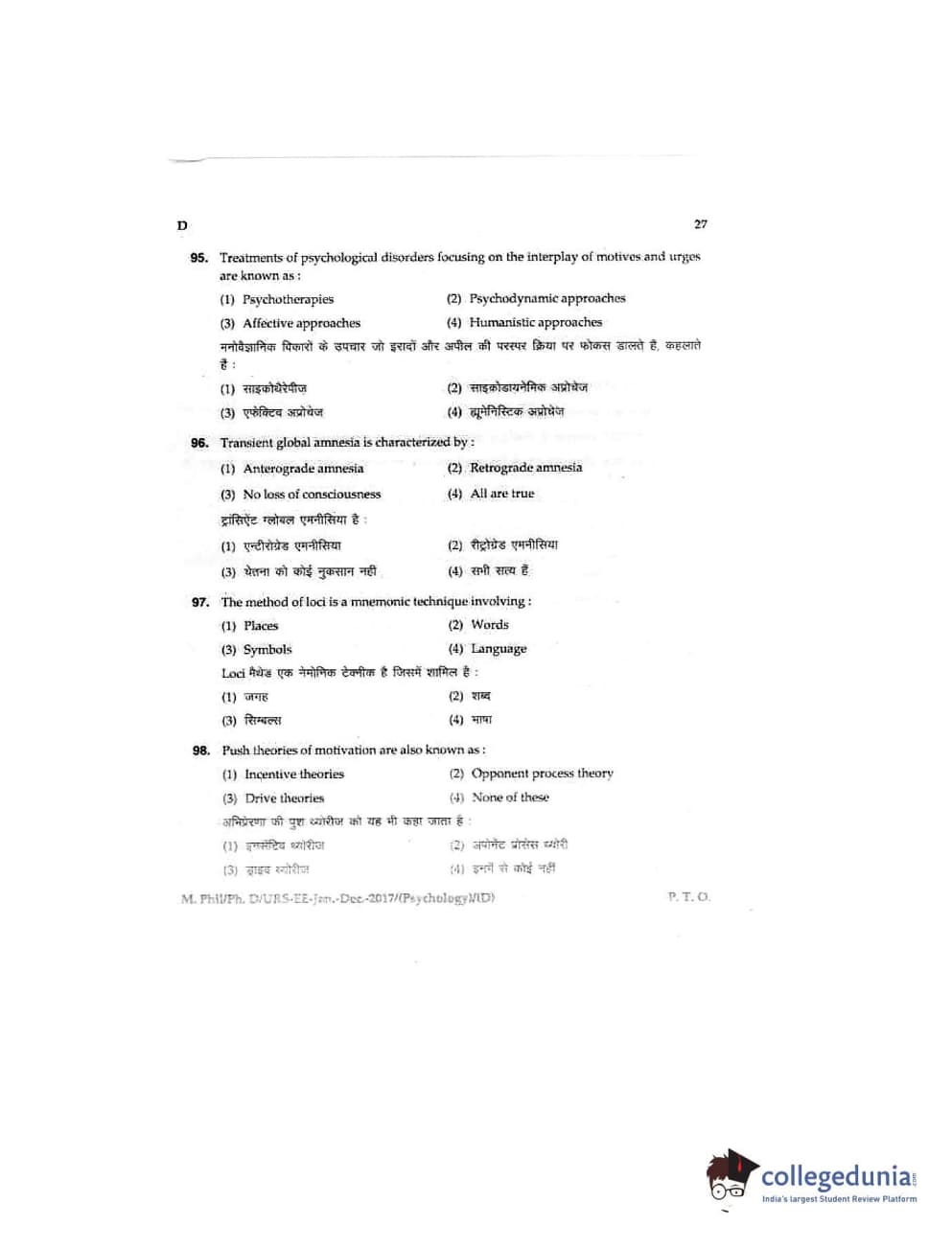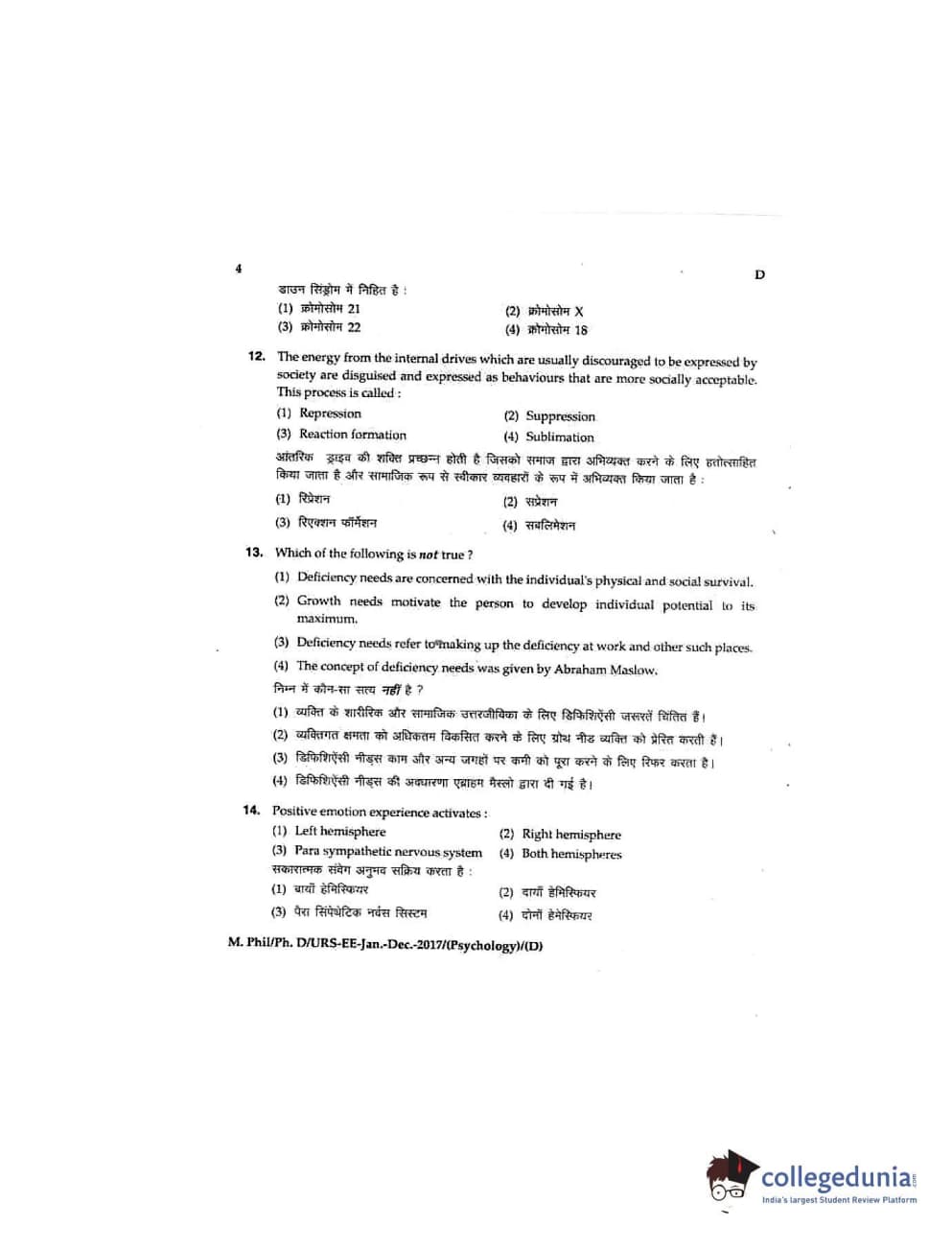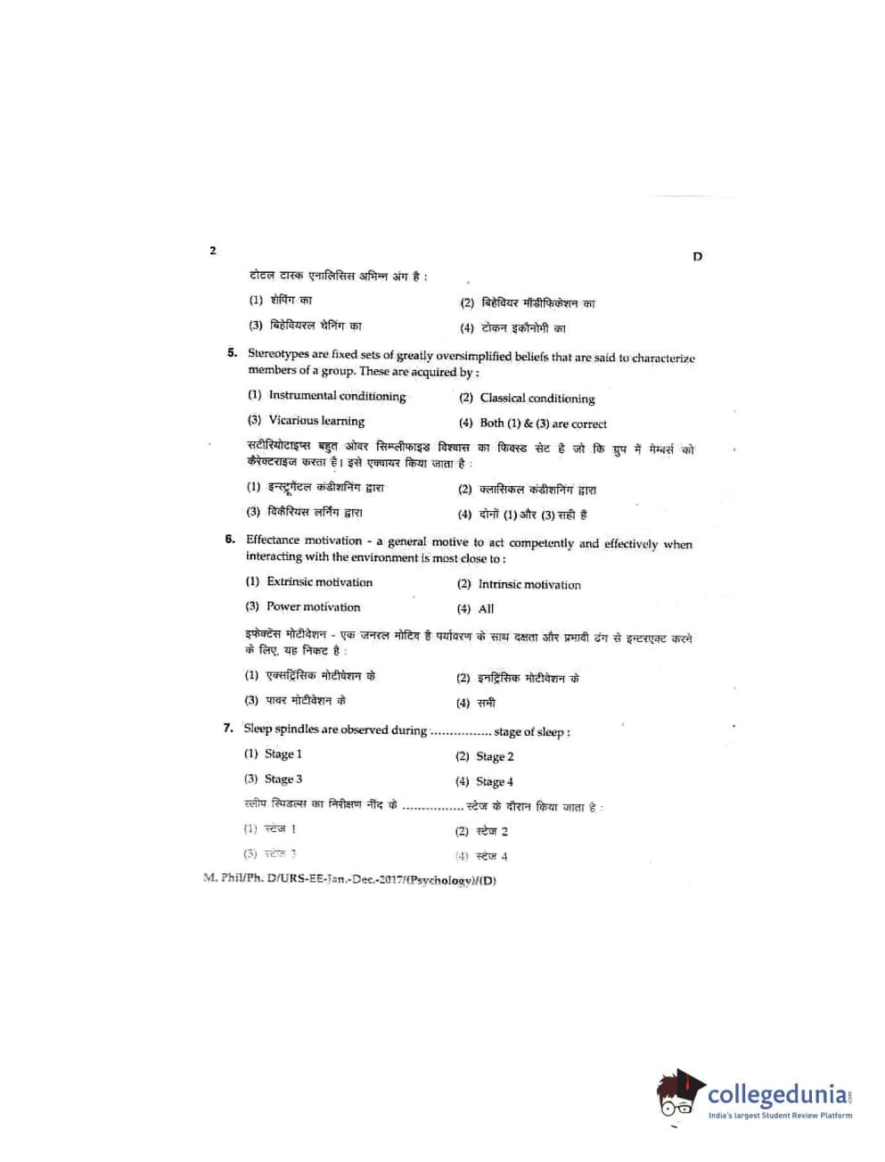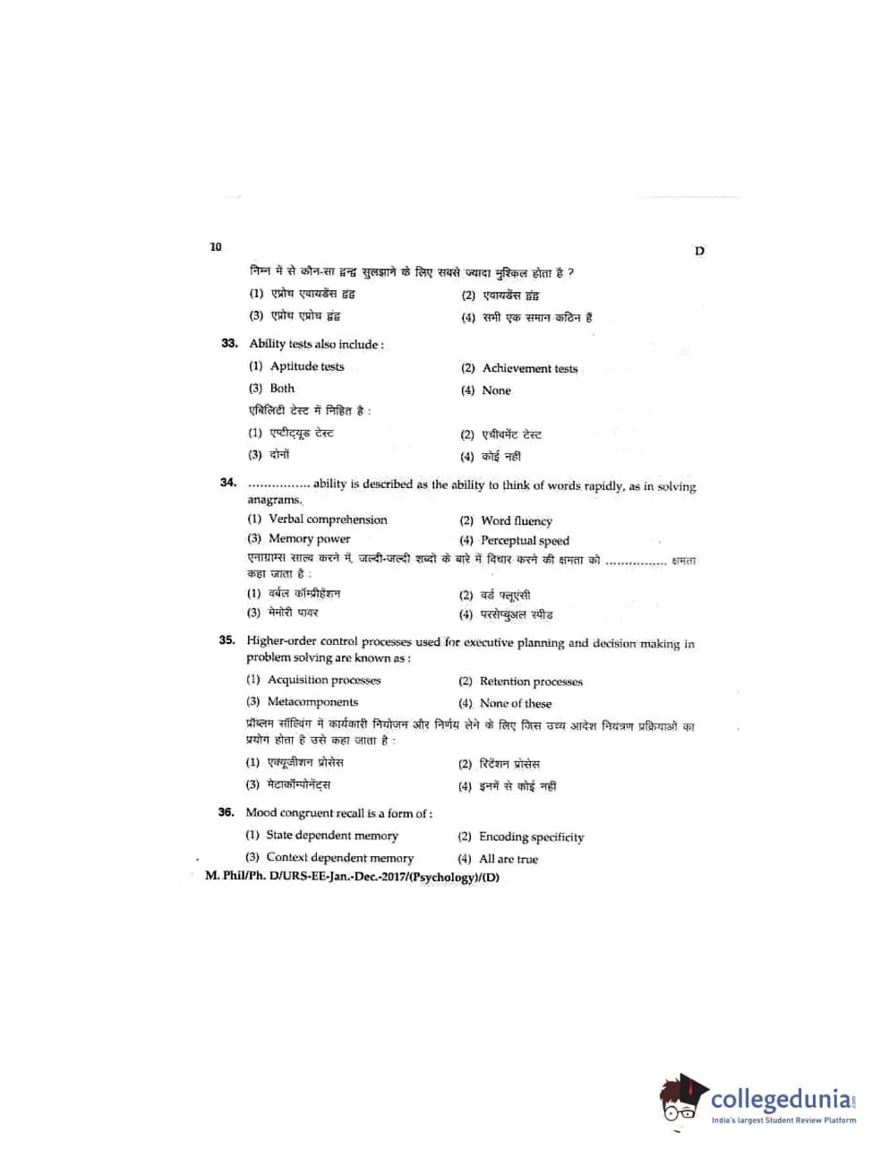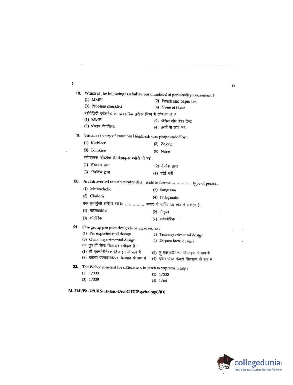 MDUCEE 2016 Ph.D/URS/M.Phil (Psychology) Set D Question Paper with Answer Key PDFs