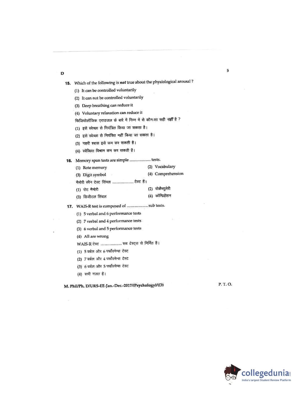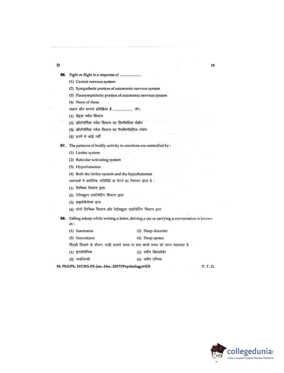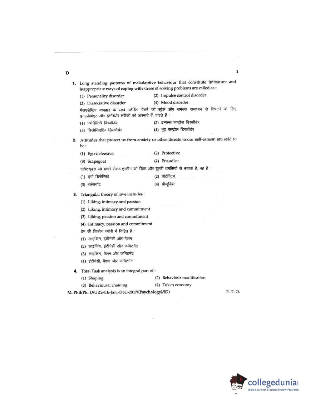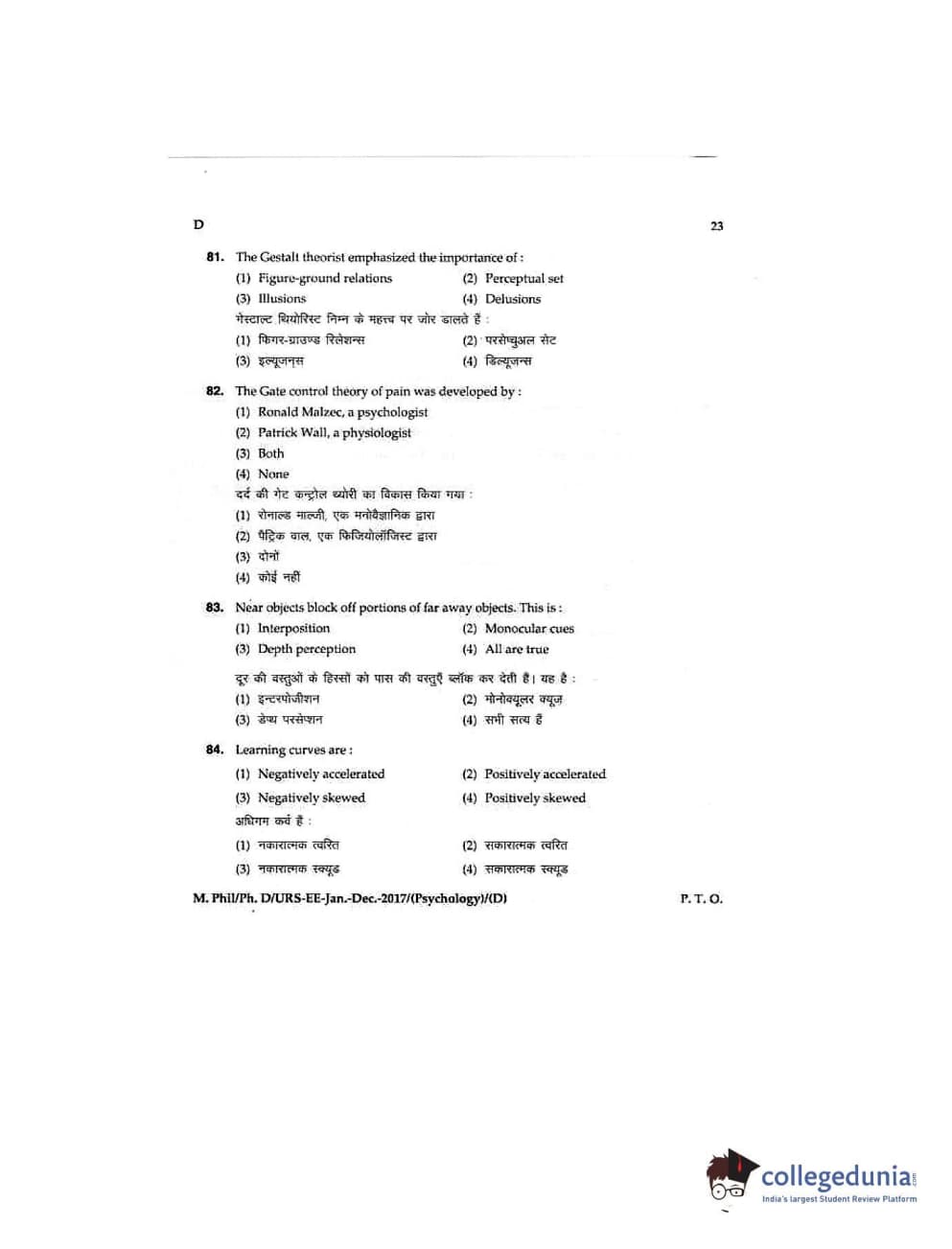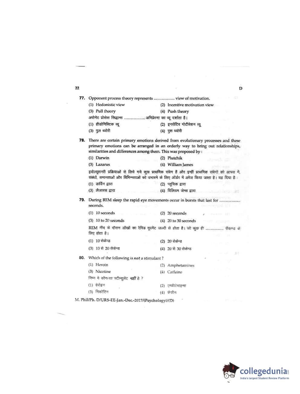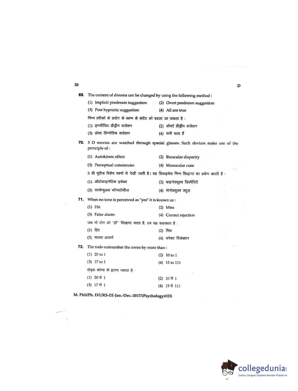 MDUCEE 2016 Ph.D/URS/M.Phil (Psychology) Set D Question Paper with Answer Key PDFs