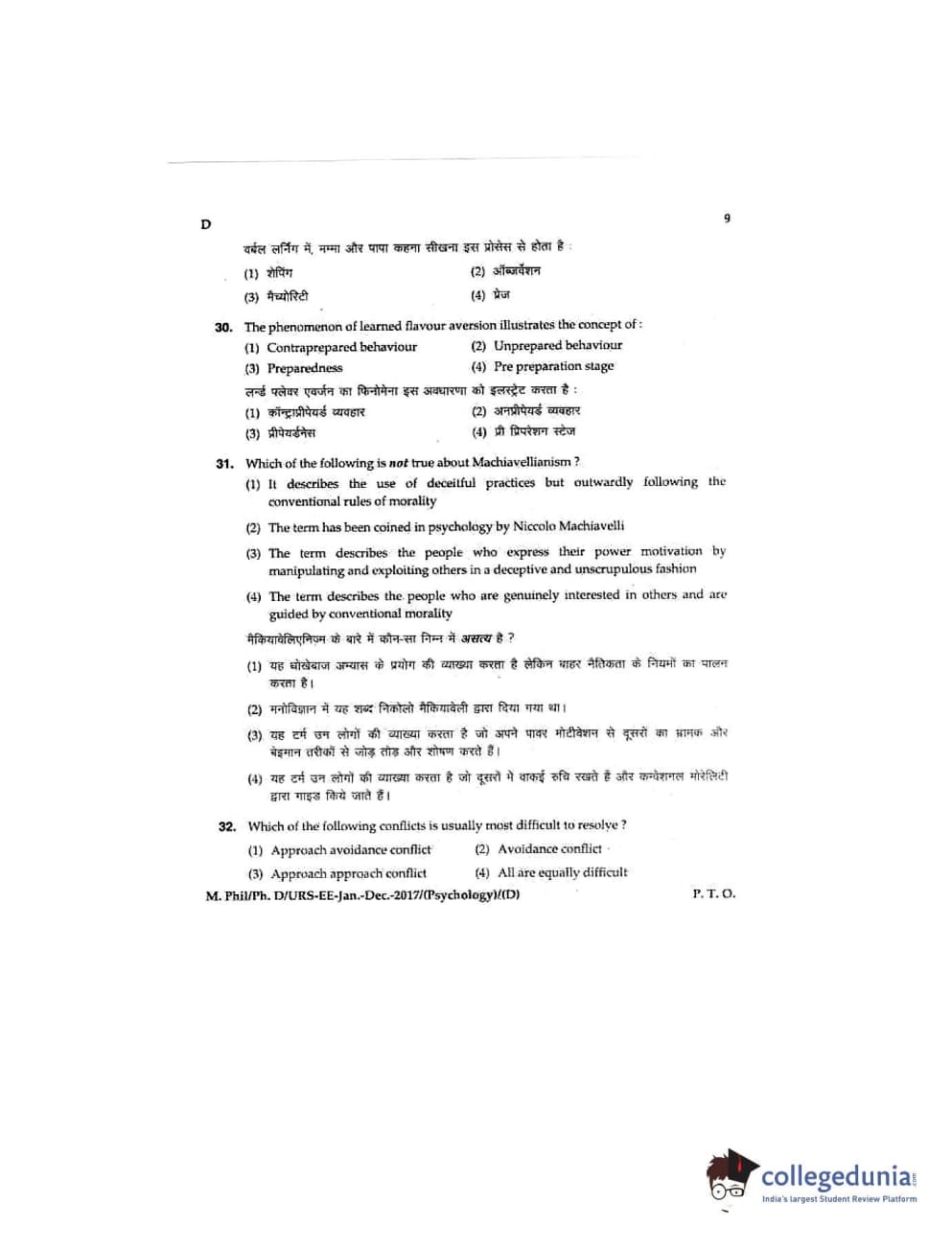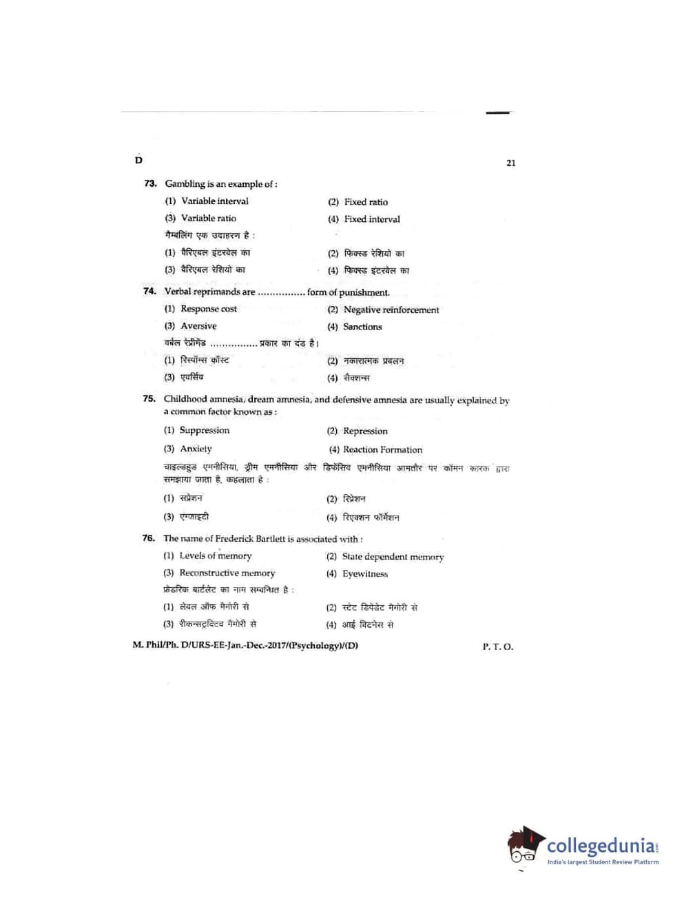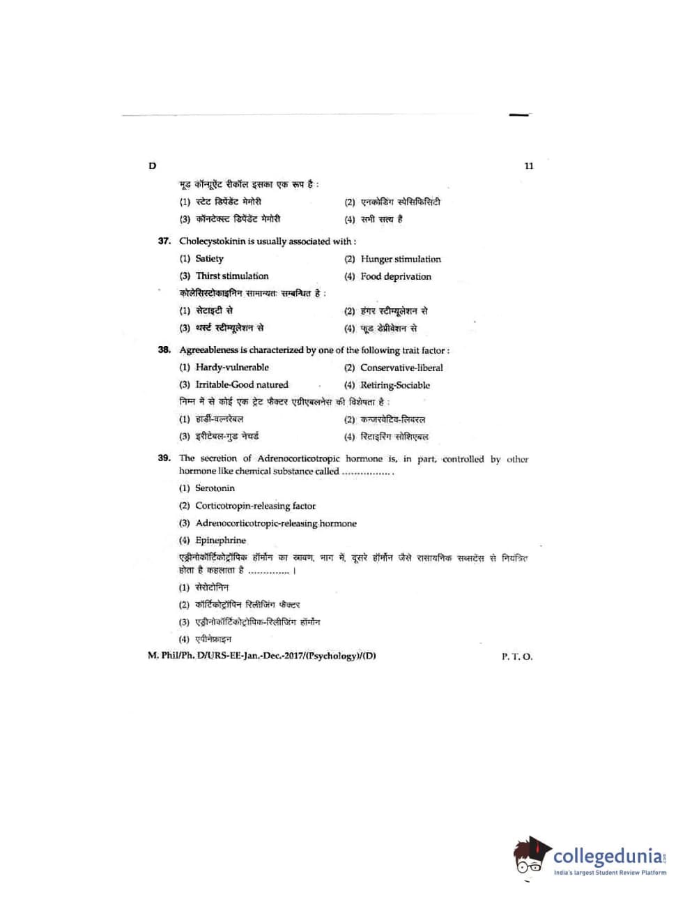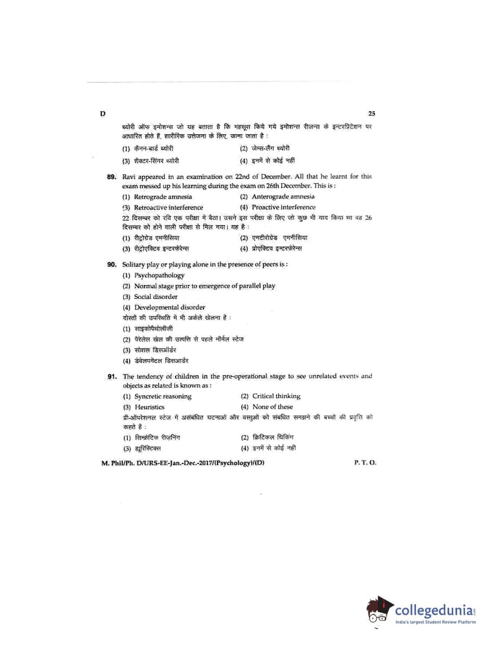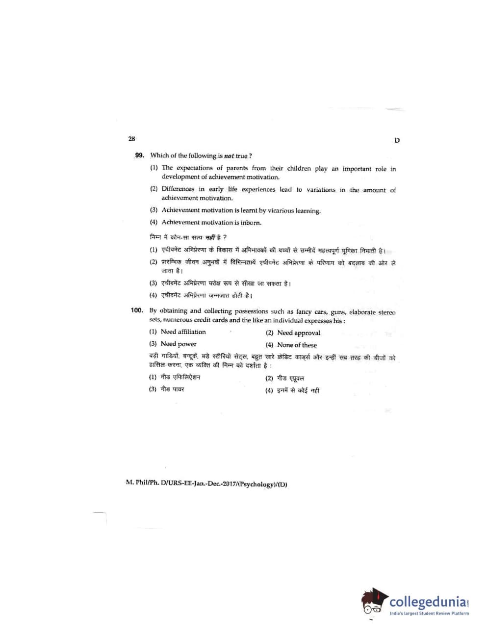 MDUCEE 2016 Ph.D/URS/M.Phil (Psychology) Set D Question Paper with Answer Key PDFs