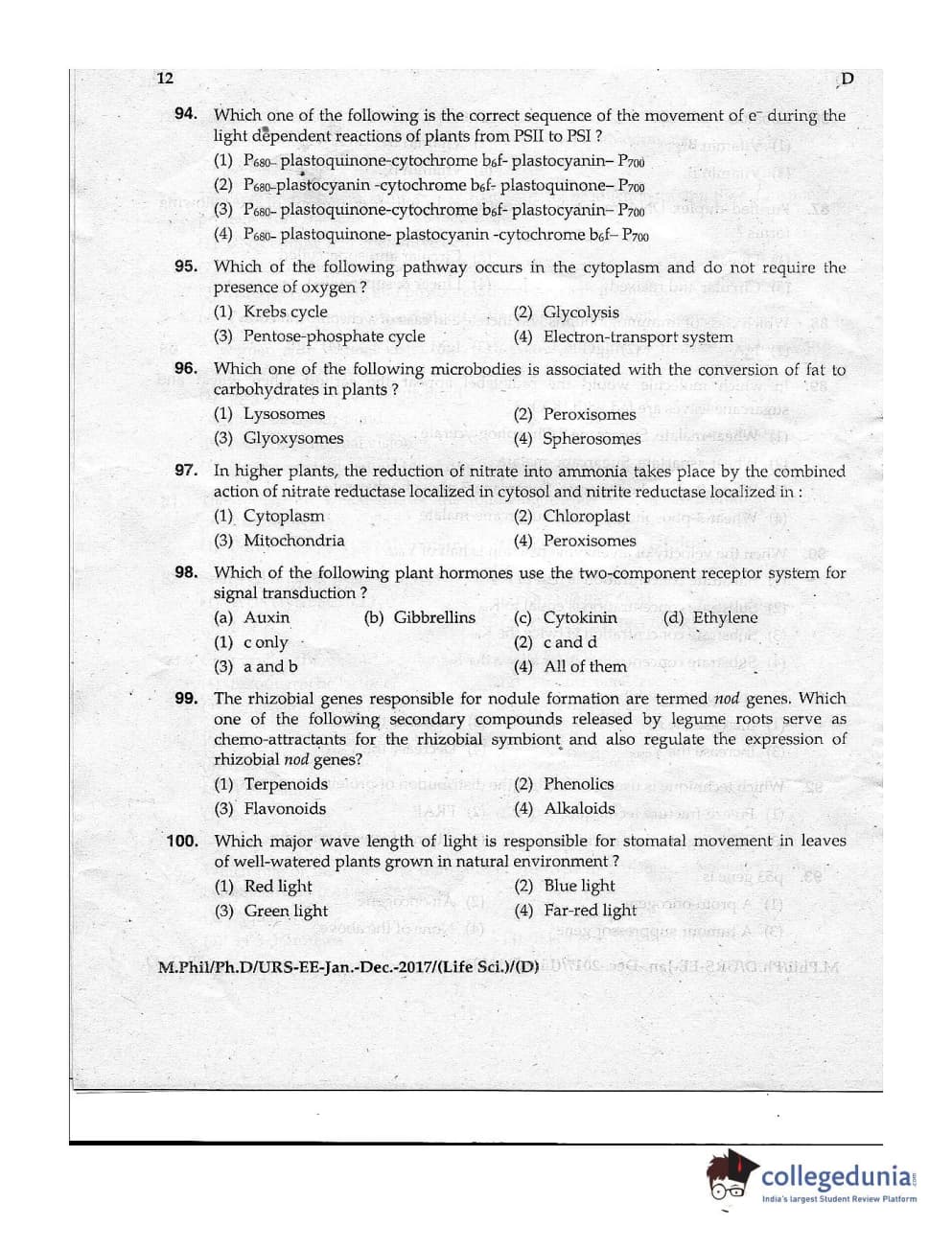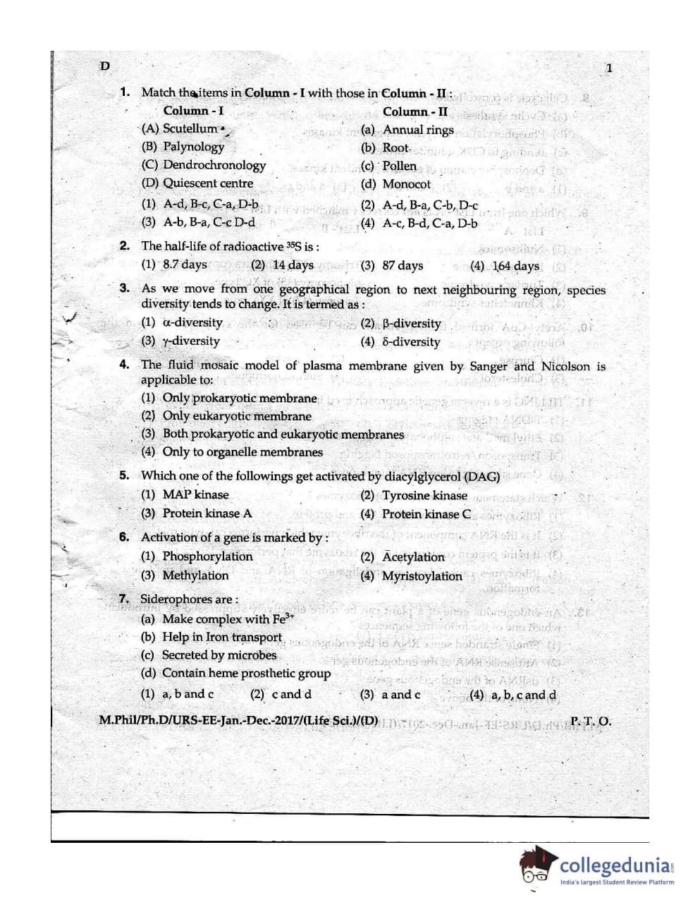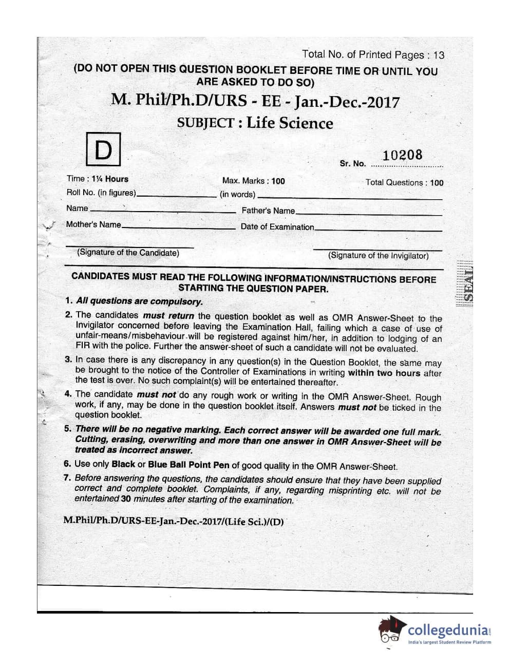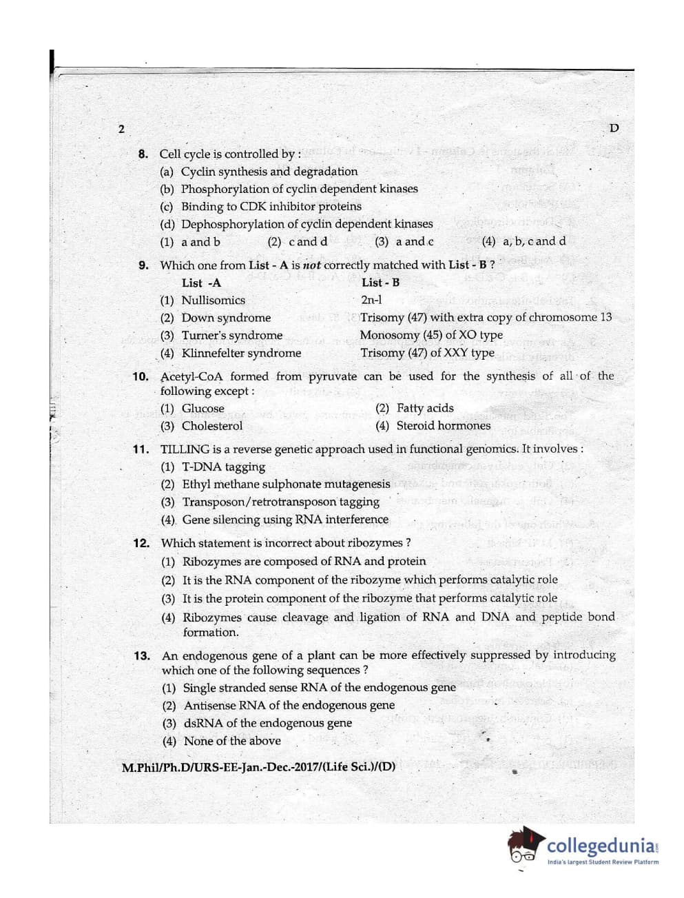 | MDUCEE 2016 Ph.D/URS Life Science Set D Question Paper PDF | MDUCEE 2016 Ph.D/URS Life Science Set D Answer Key PDF |