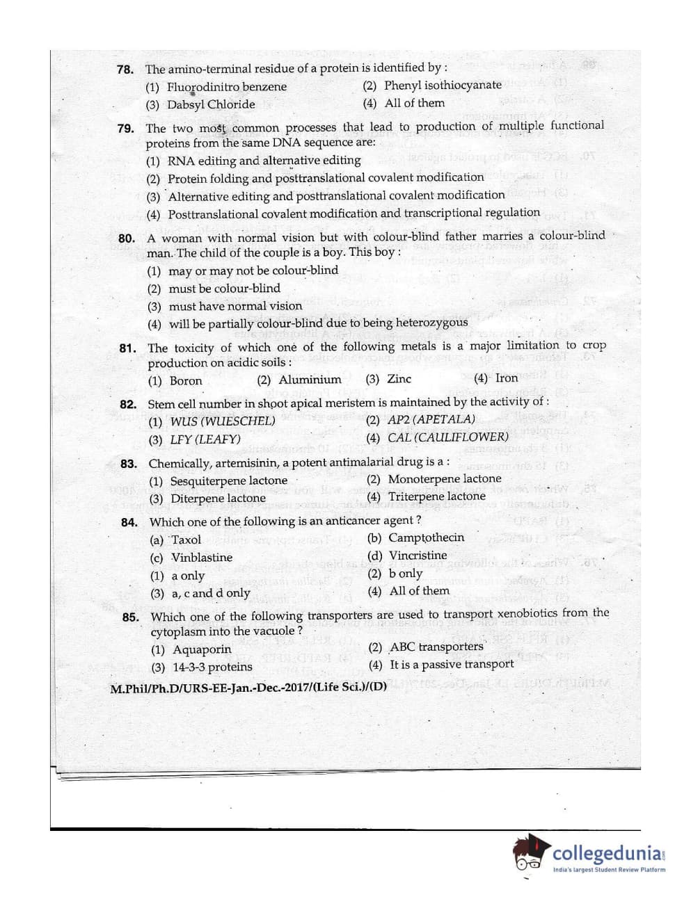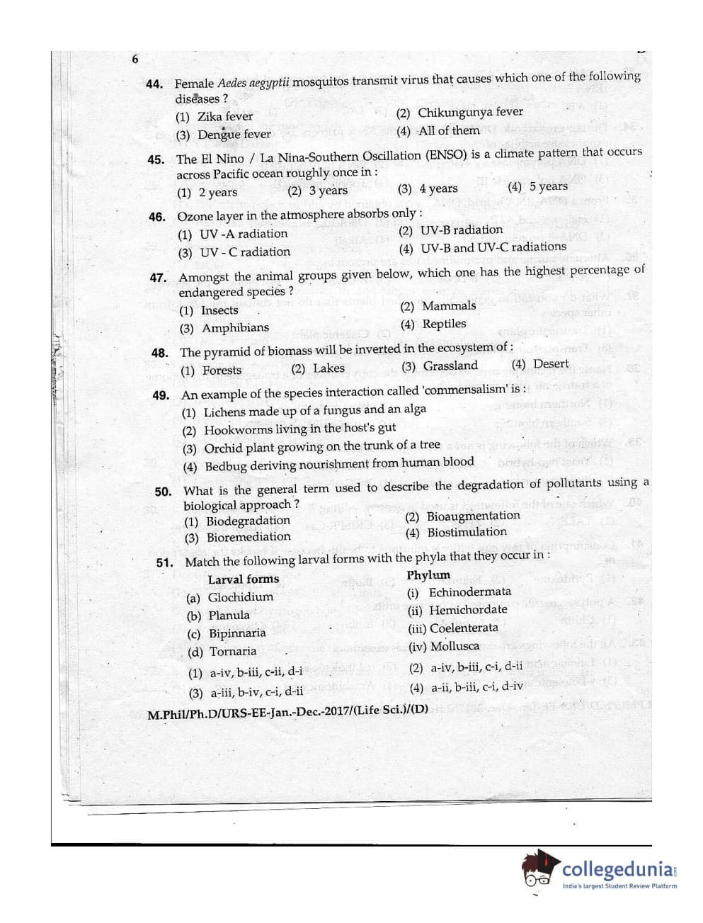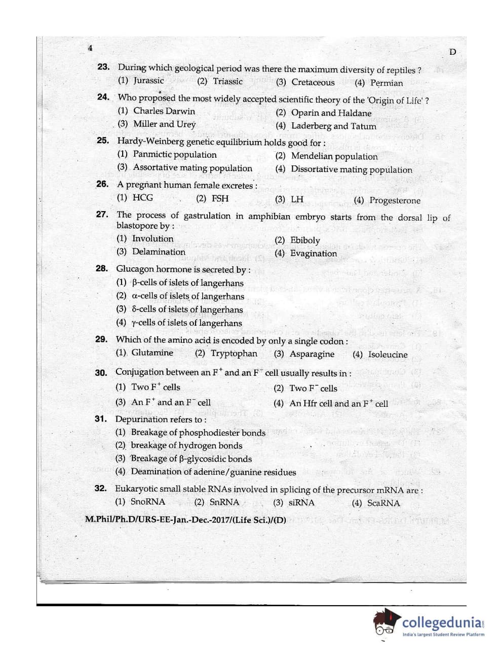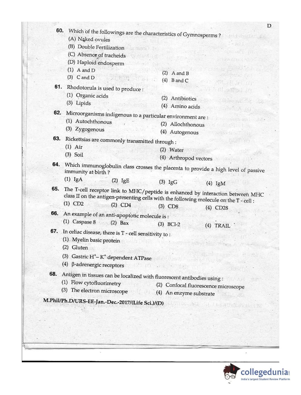 MDUCEE 2016 Ph.D/URS Life Science Set D Question Paper with Answer Key PDFs