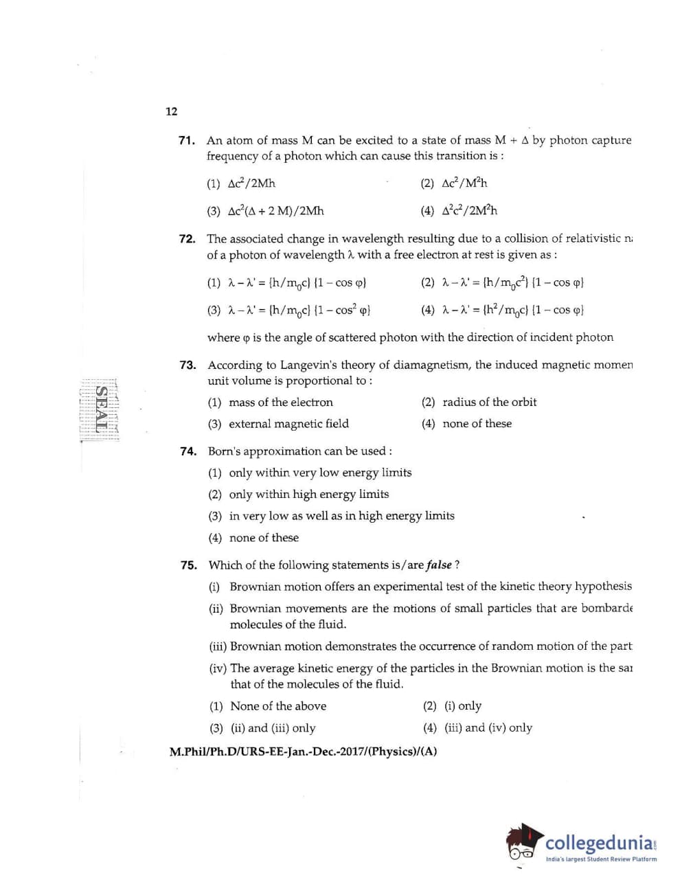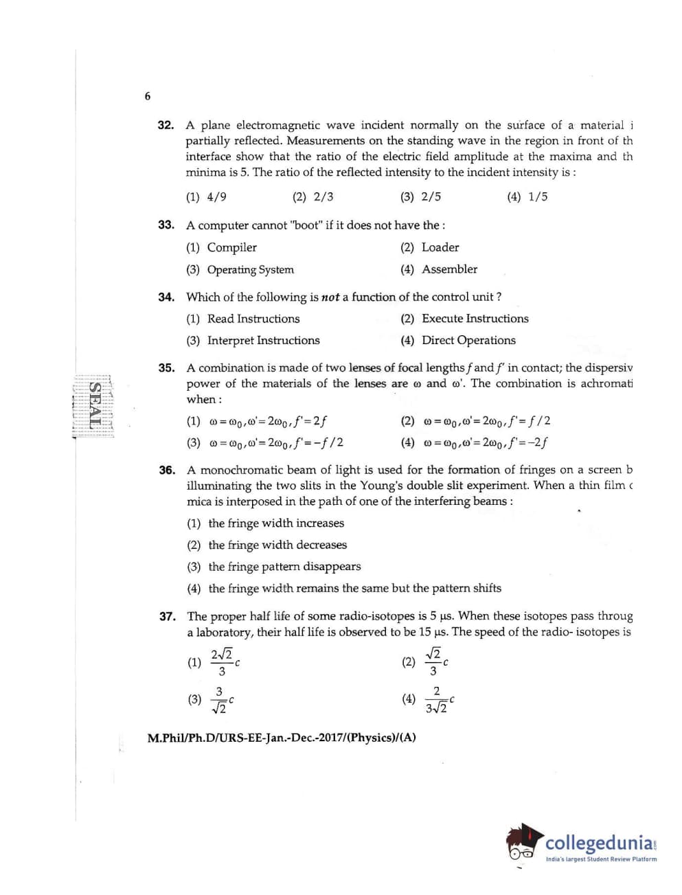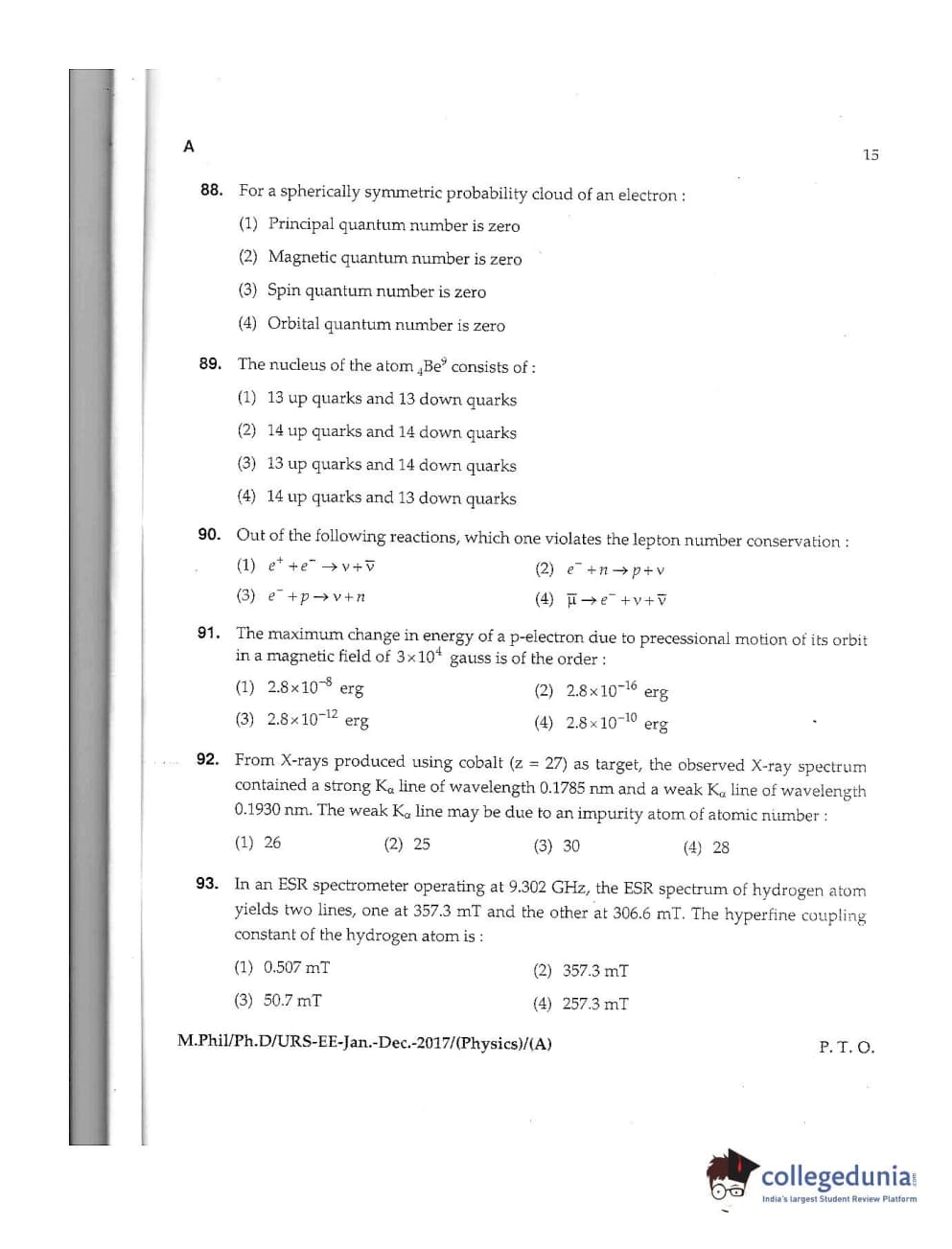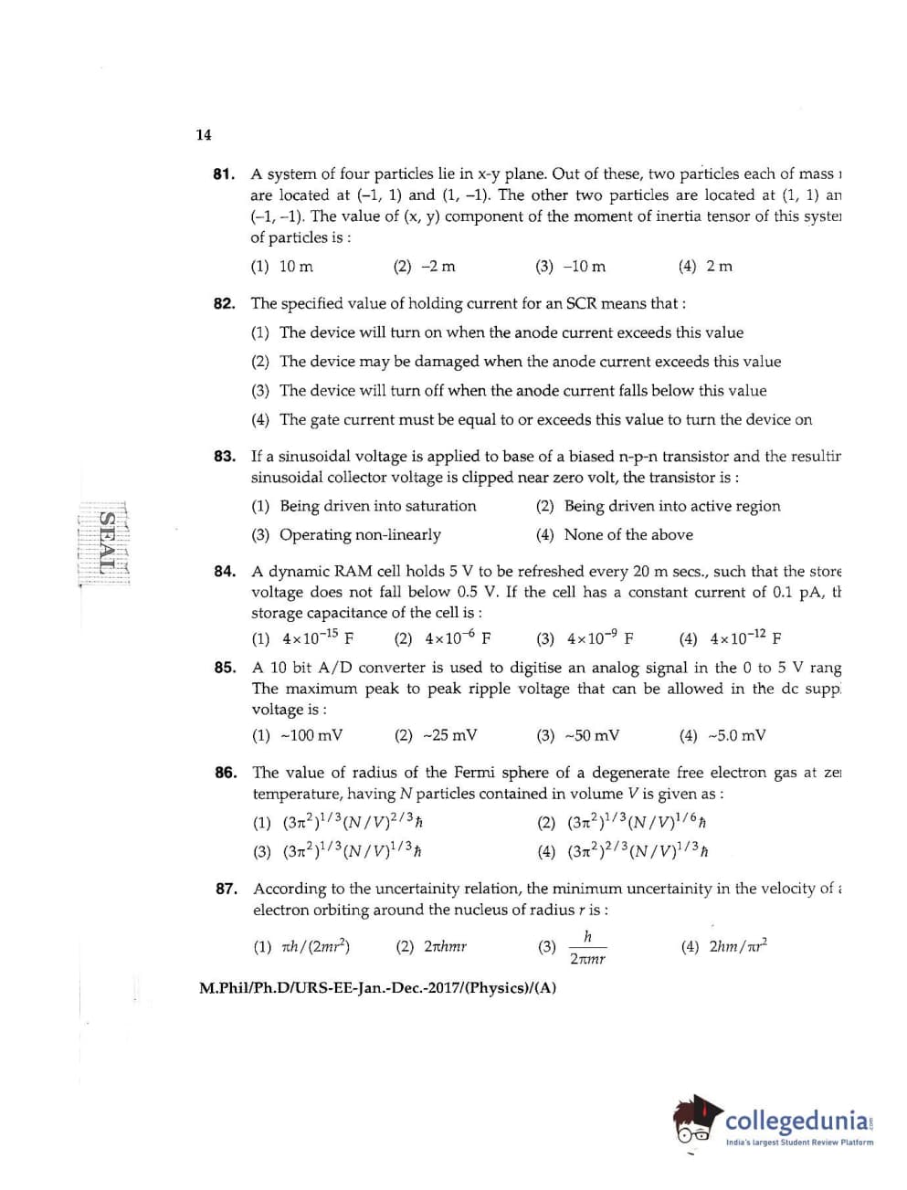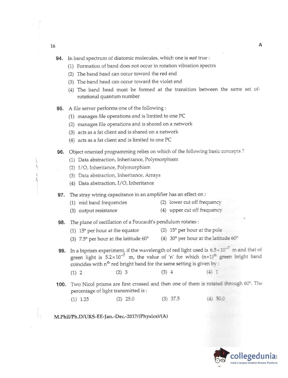 MDUCEE 2016 Ph.D /URS (Physics) Set A Question Paper with Answer Key PDFs