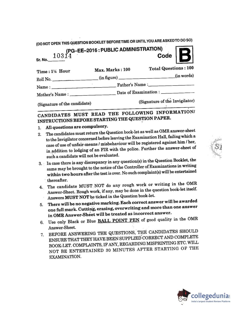 MDUCEE 2016 Public Administration Set B Question paper with answer key pdf is available for download. The exam was successfully organized by Maharishi Dayanand University. The question paper comprised a total of 100 questions.