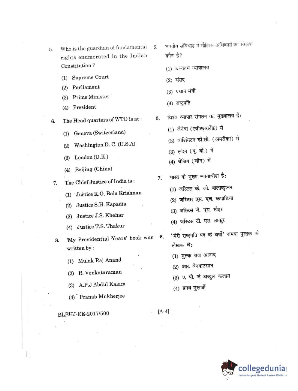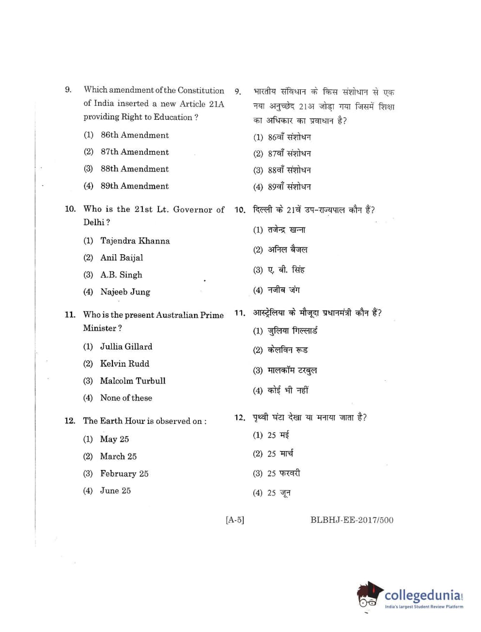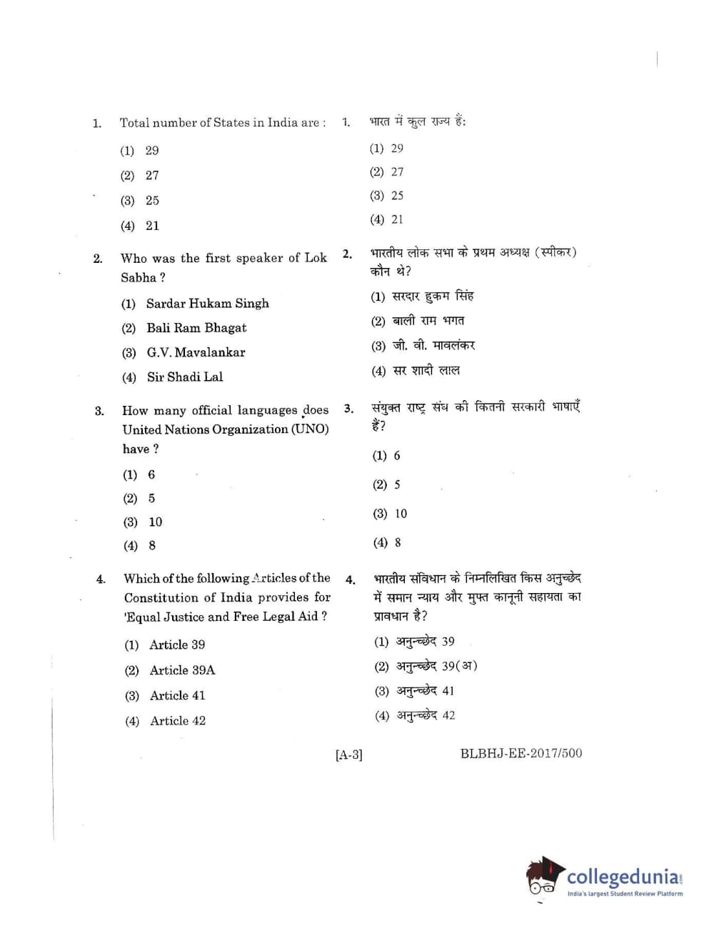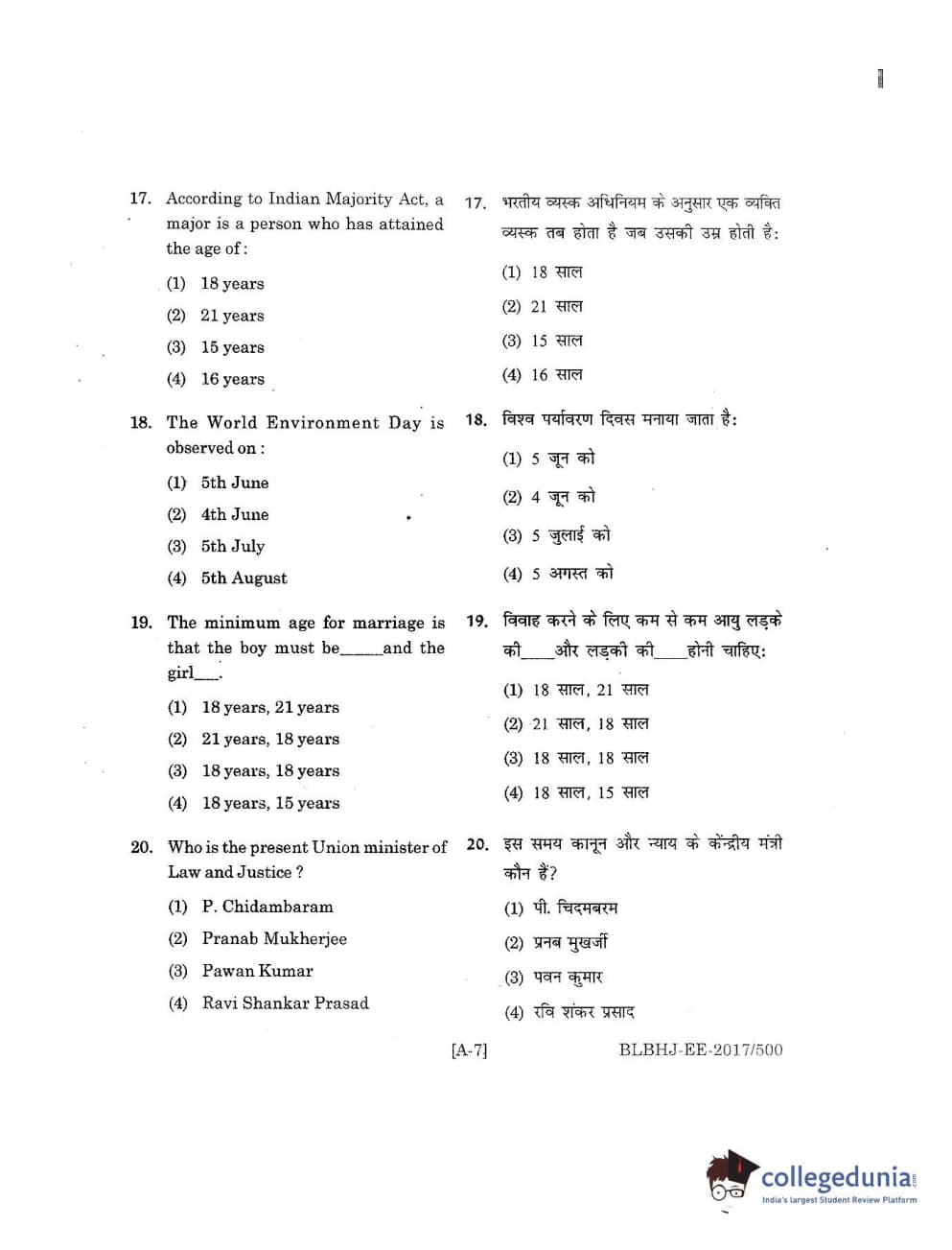 MDUCEE 2017 B.A. LL.B (Hons) 5 Years Integrated Set A Question Paper with Answer Key PDFs