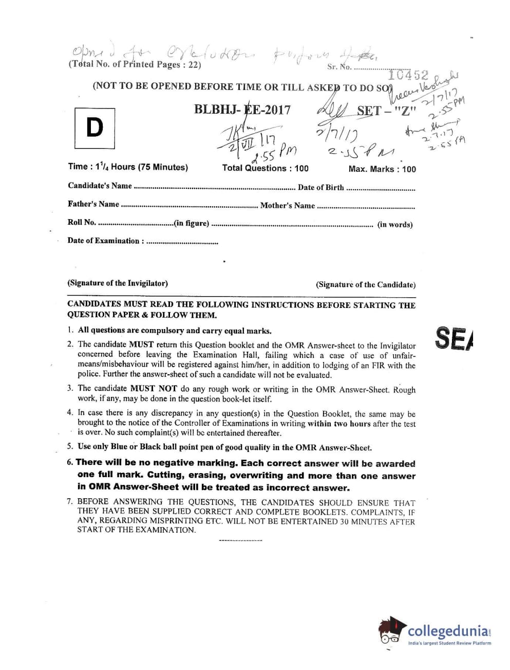 MDUCEE 2017 B.A. LL.B (Hons) 5 Years Integrated Set D Question paper with answer key pdf is available for download. The exam was successfully organized by Maharishi Dayanand University. The question paper comprised a total of 100 questions.