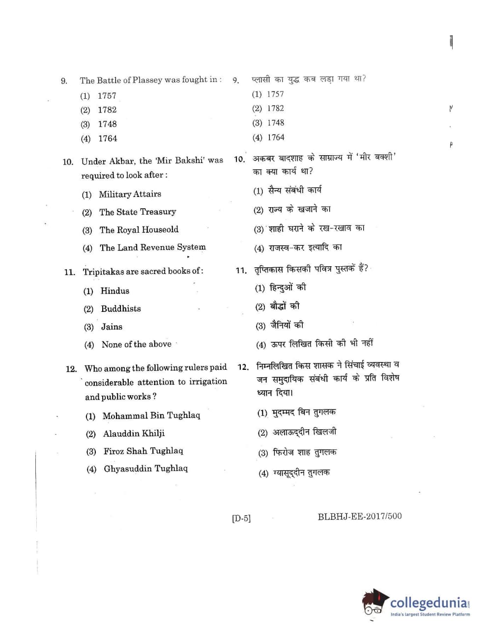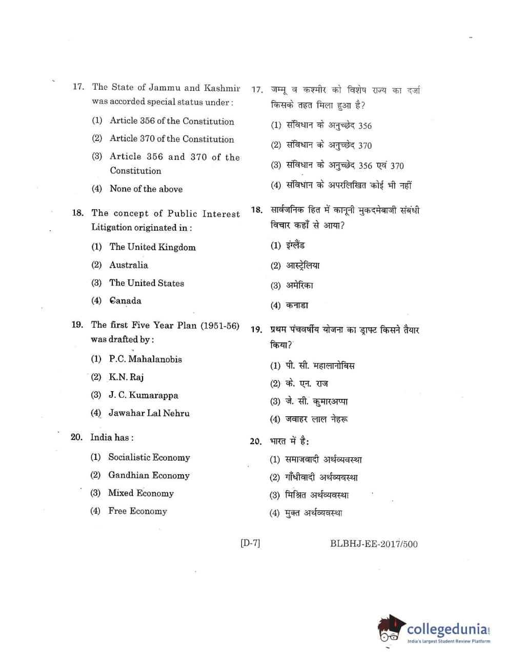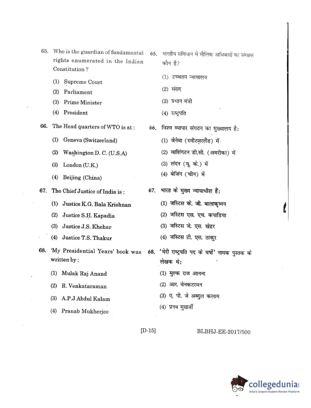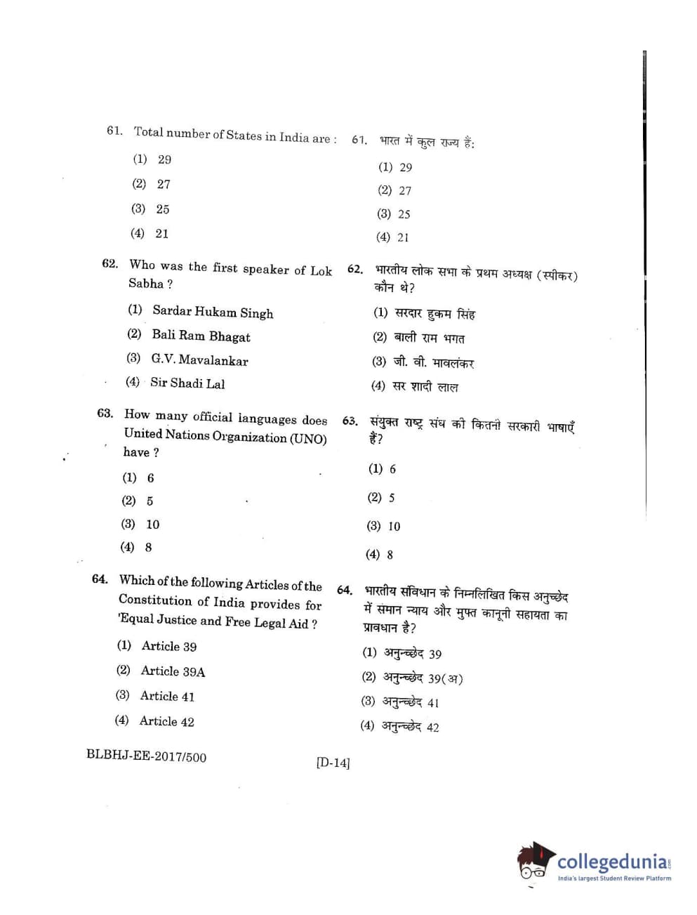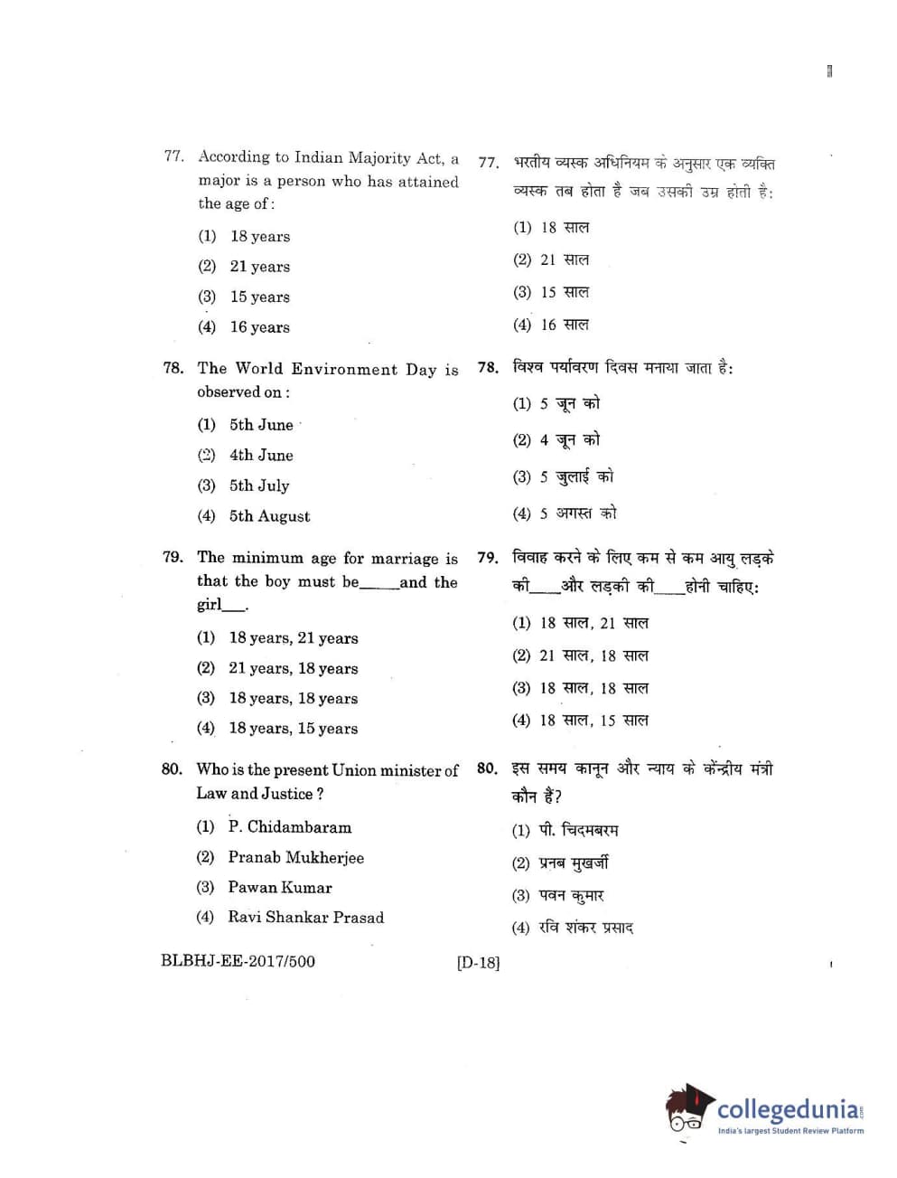 MDUCEE 2017 B.A. LL.B (Hons) 5 Years Integrated Set D Question Paper with Answer Key PDFs