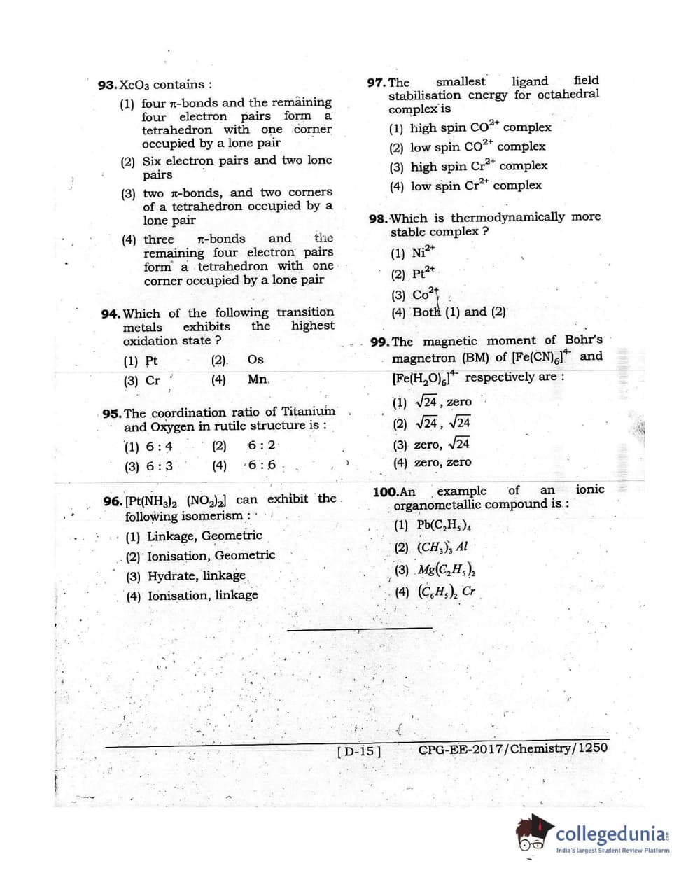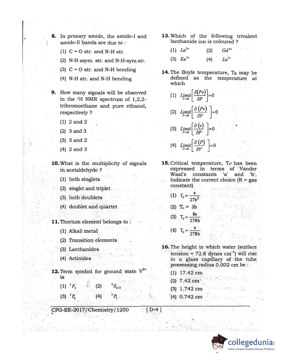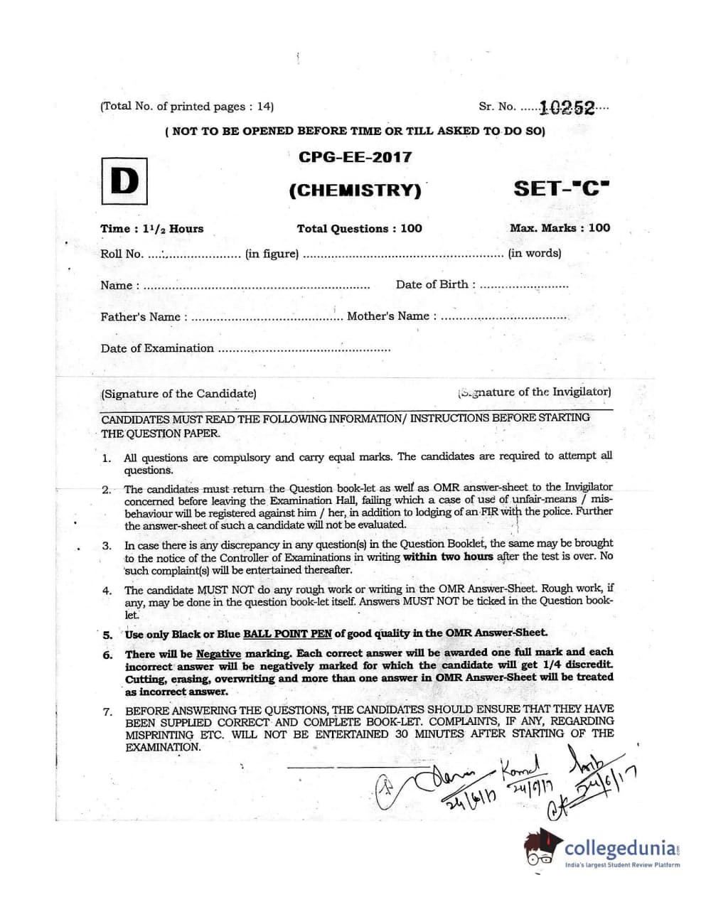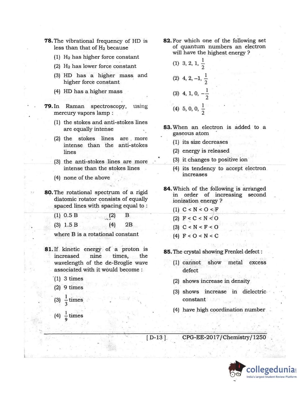MDUCEE 2017 Chemistry Set D Question Paper with Answer Key PDFs