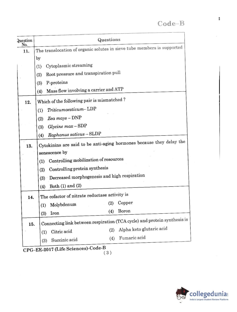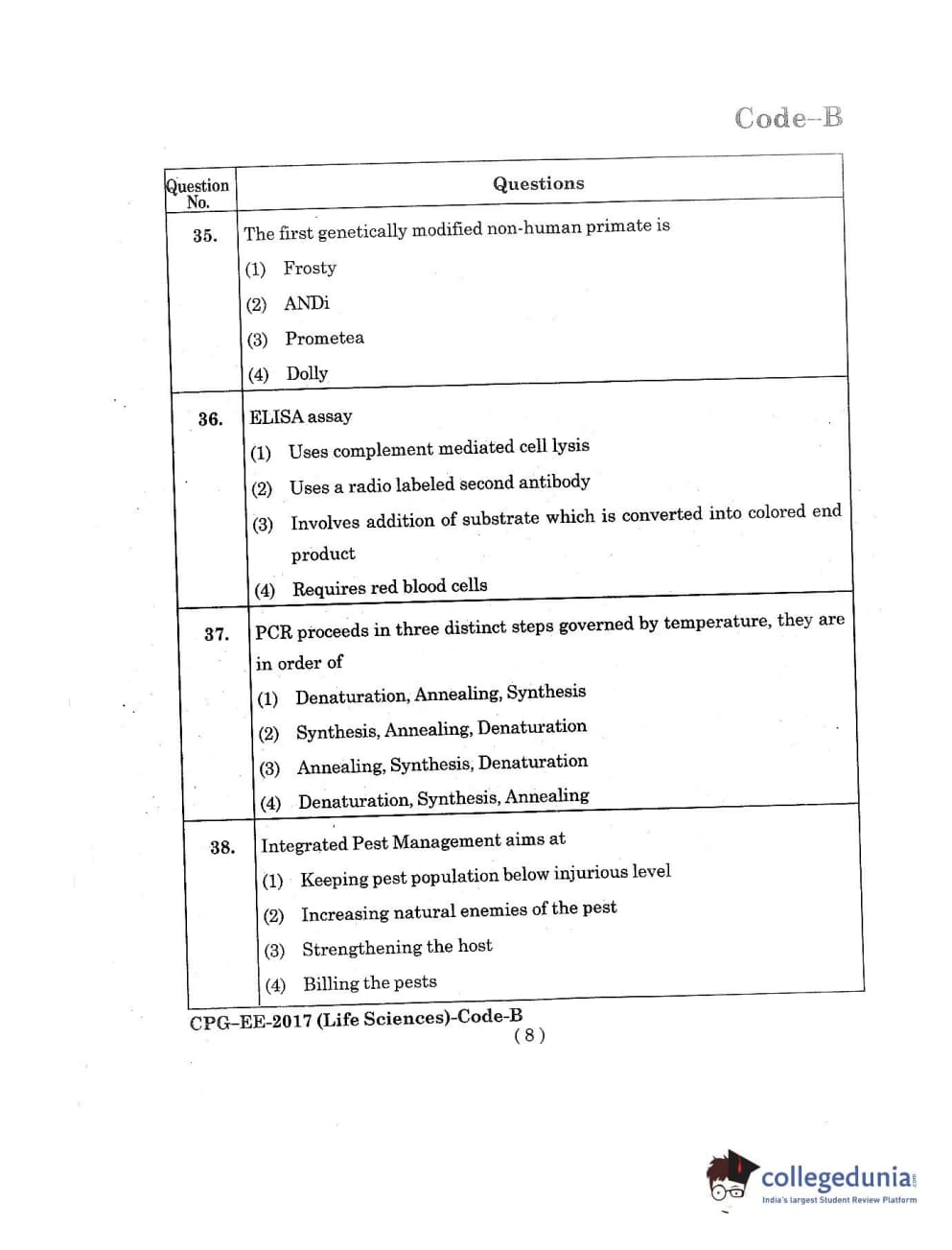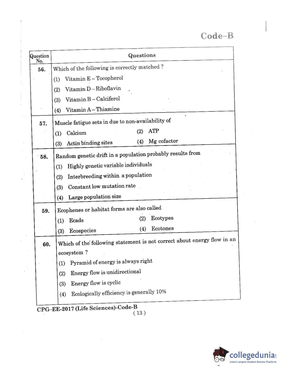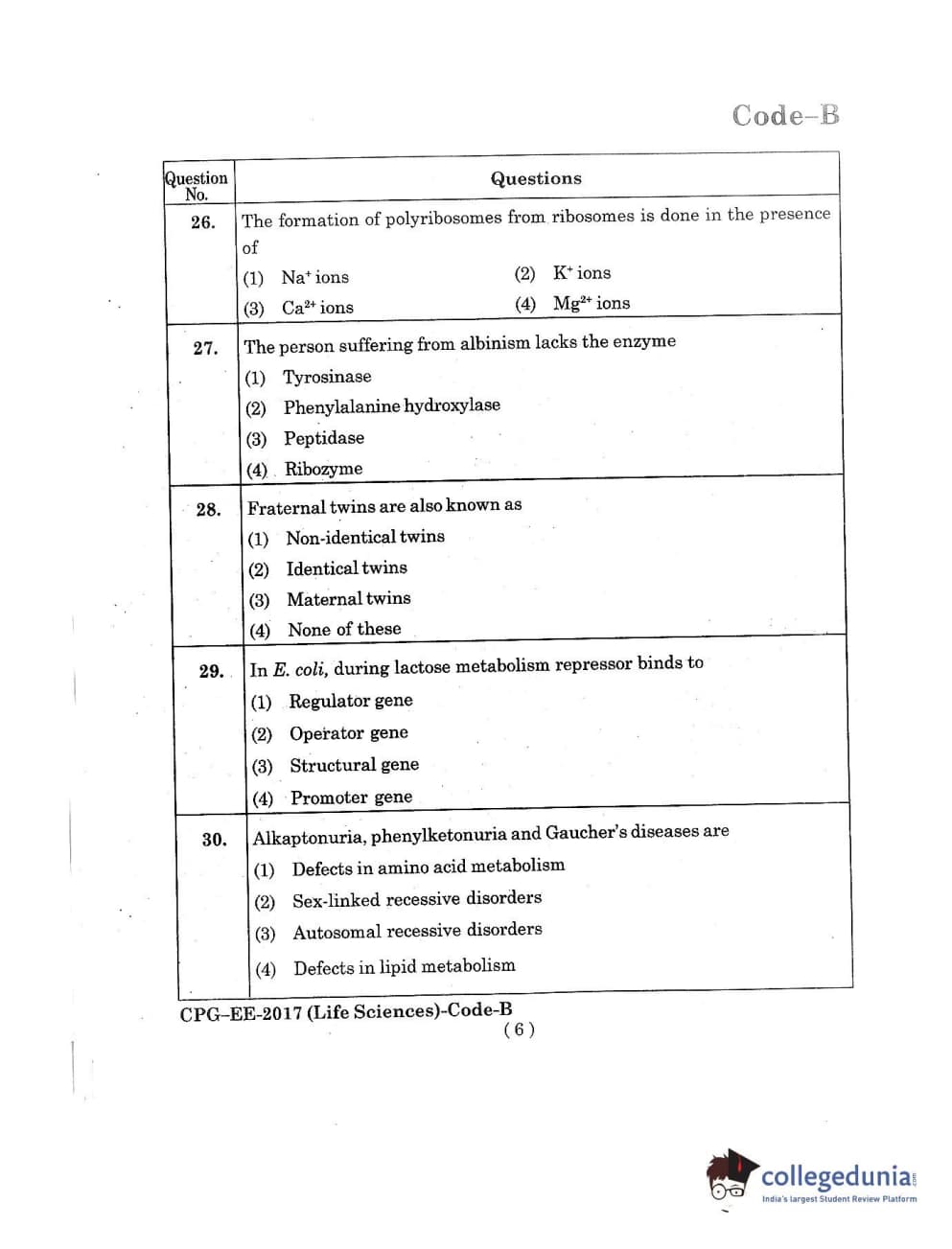 MDUCEE 2017 Life Sciences Set B Question Paper with Answer Key PDFs
