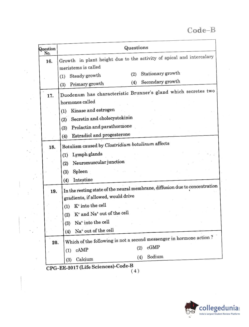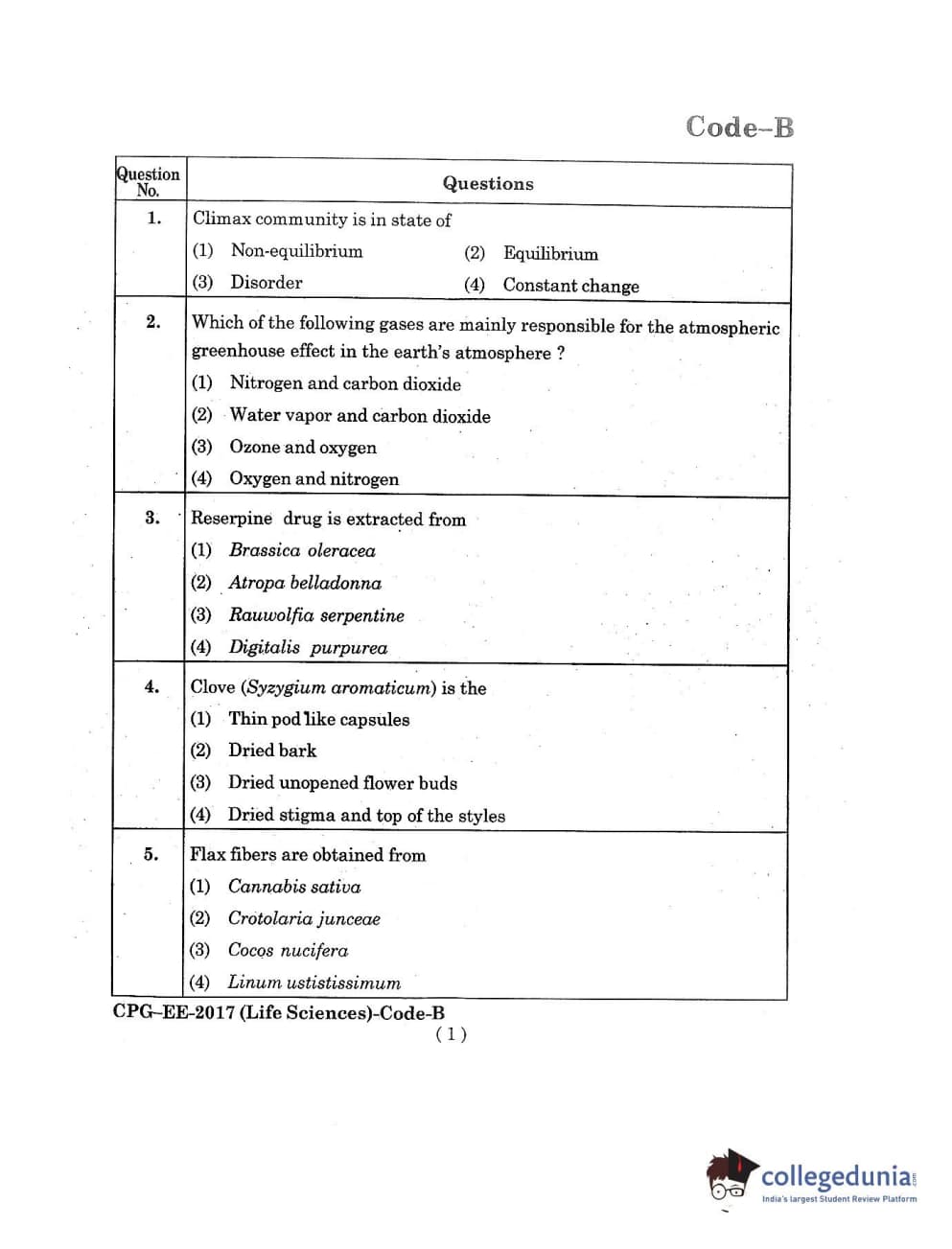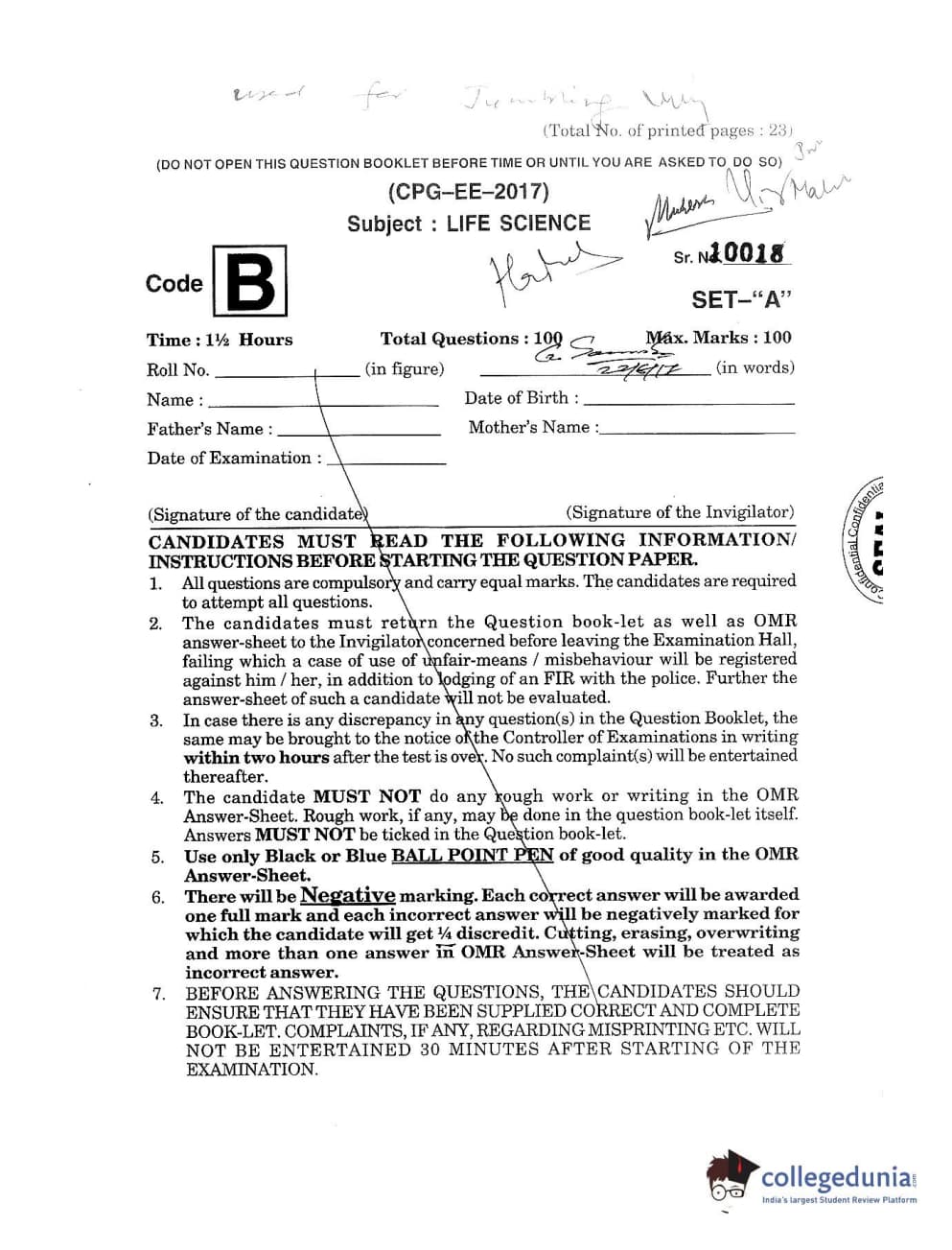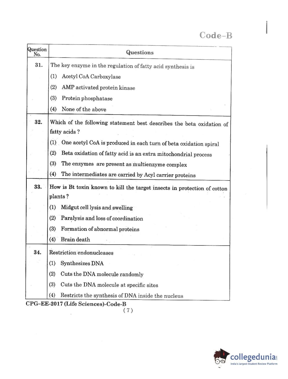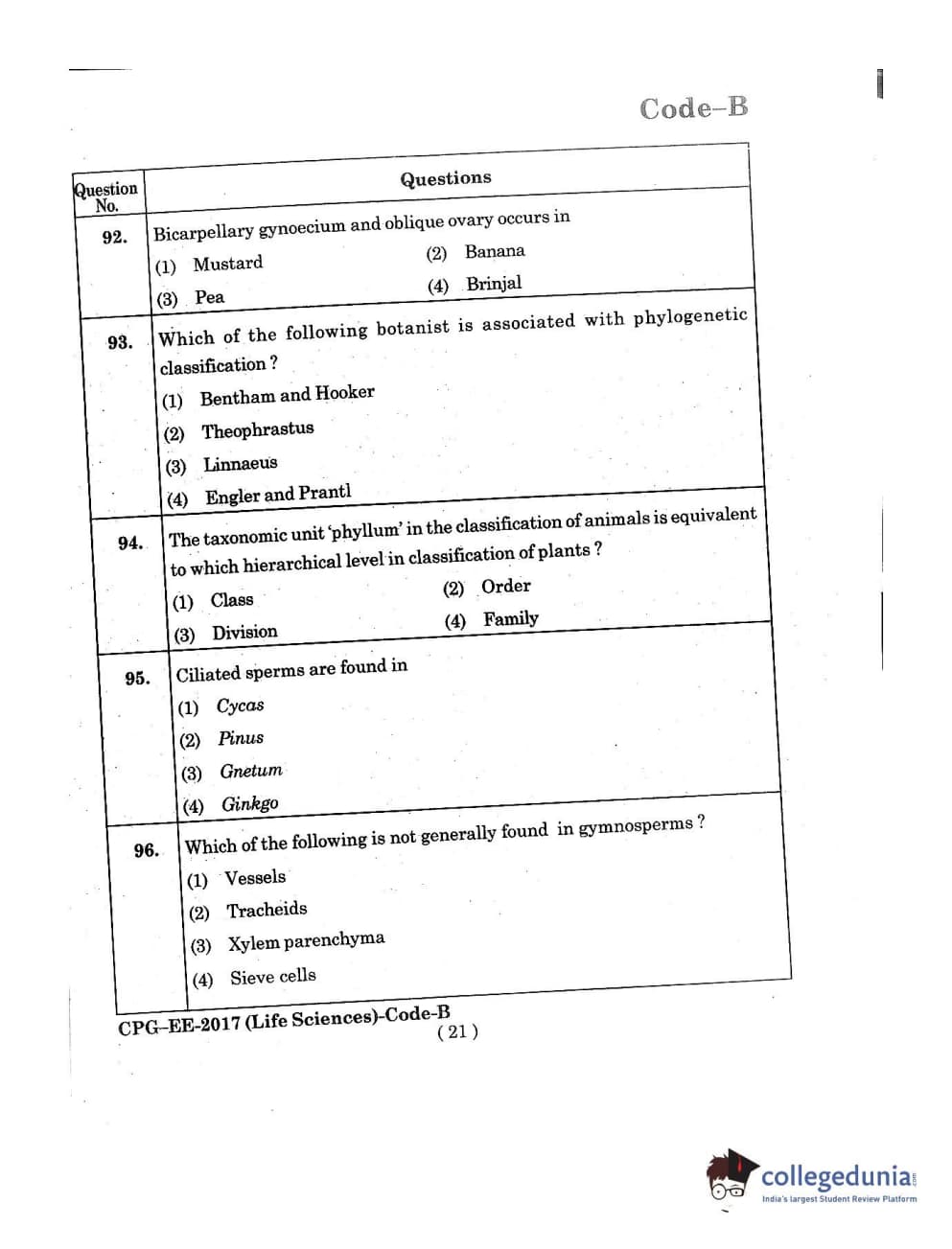 MDUCEE 2017 Life Sciences Set B Question Paper with Answer Key PDFs