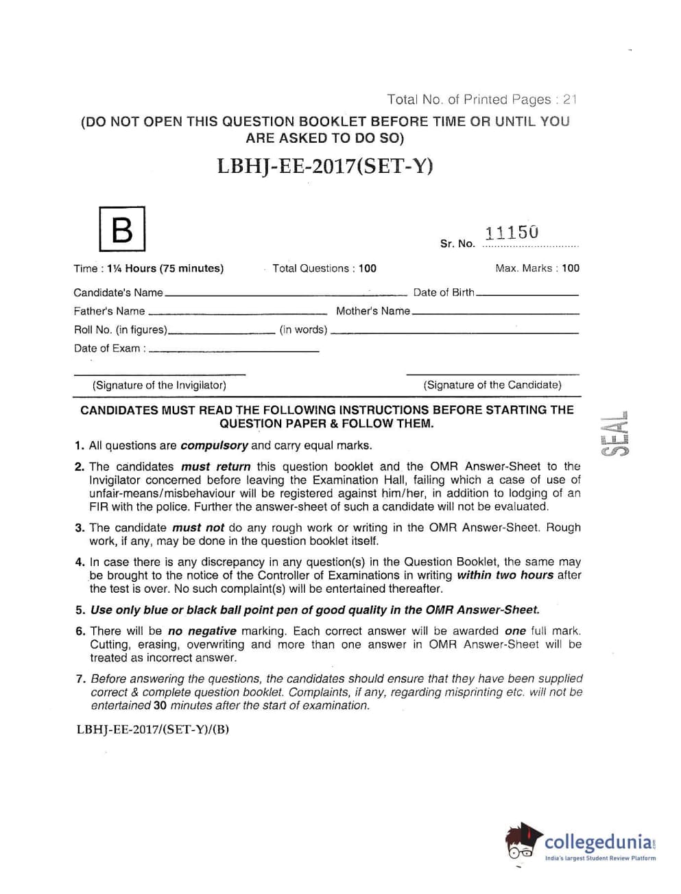 MDUCEE 2017 LL.B-3 Years Set B Question paper with answer key pdf is available for download. The exam was successfully organized by Maharishi Dayanand University. The question paper comprised a total of 100 questions.