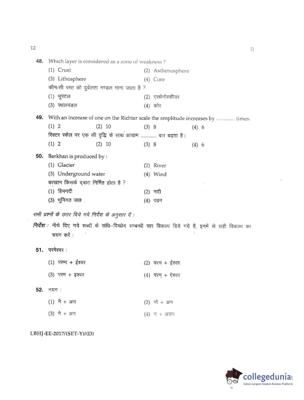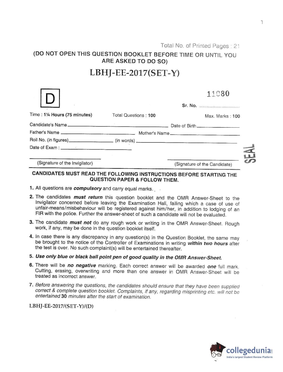 MDUCEE 2017 LL.B-3 Years Set D Question paper with answer key pdf is available for download. The exam was successfully organized by Maharishi Dayanand University. The question paper comprised a total of 100 questions.