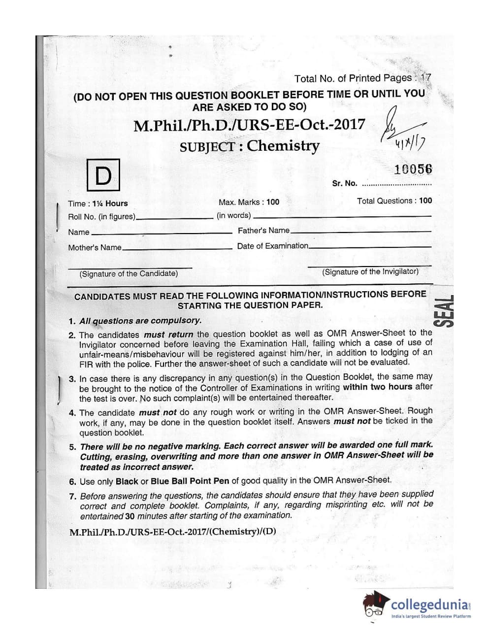 | MDUCEE 2017 M.Phil./Ph.D./URS Chemistry Set D Question Paper PDF | MDUCEE 2017 M.Phil./Ph.D./URS Chemistry Set D Answer Key PDF |