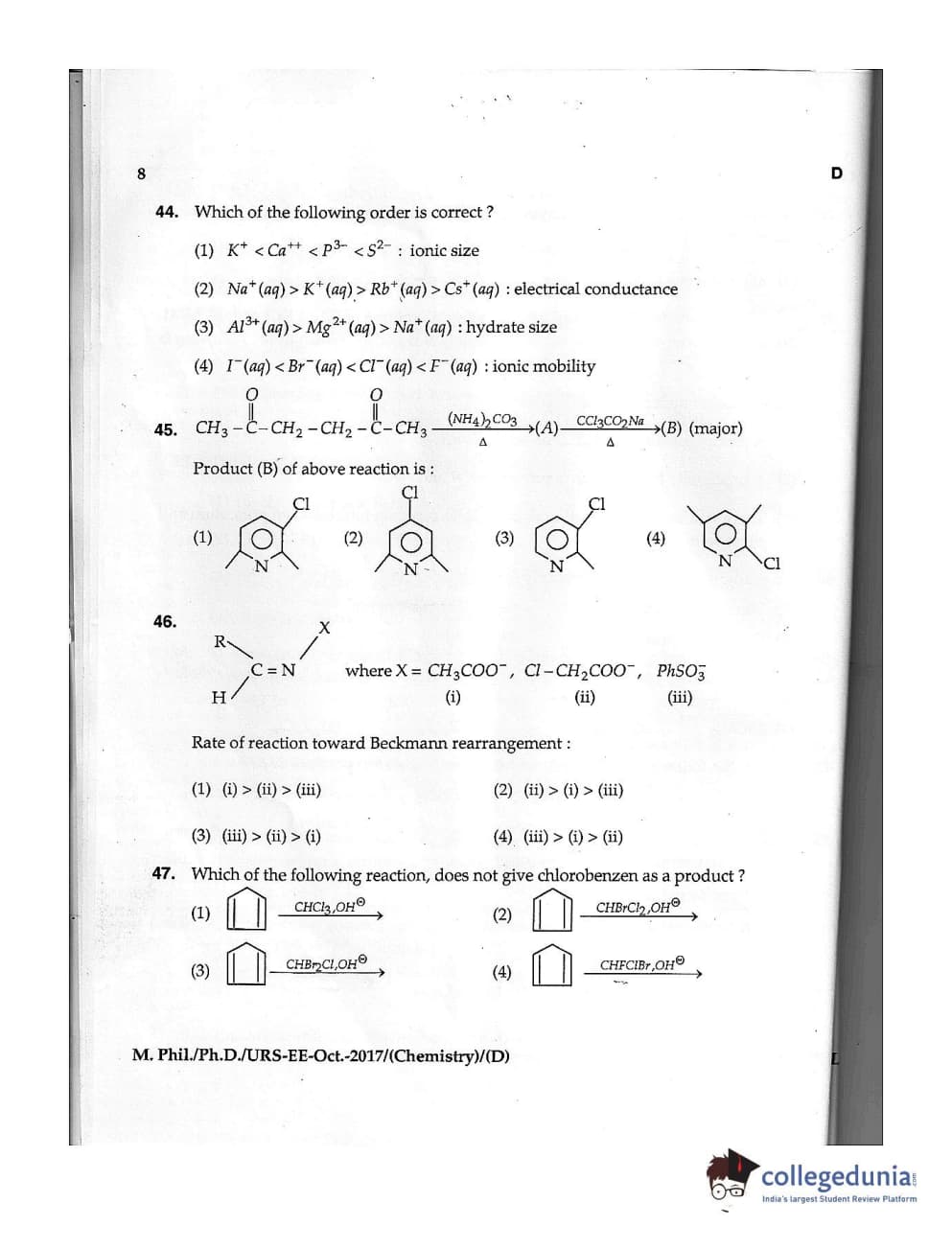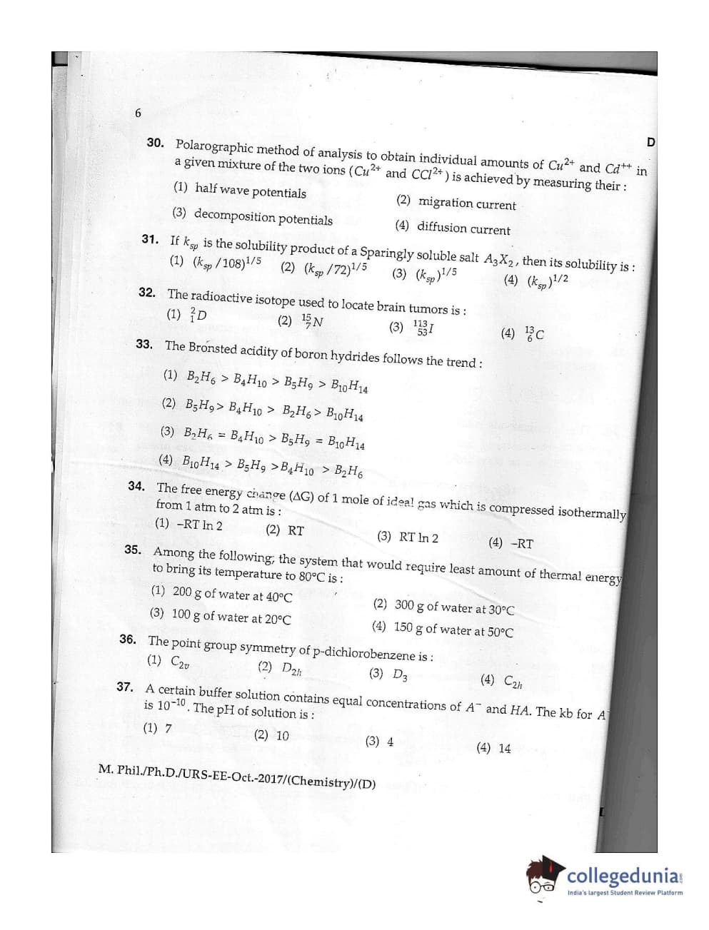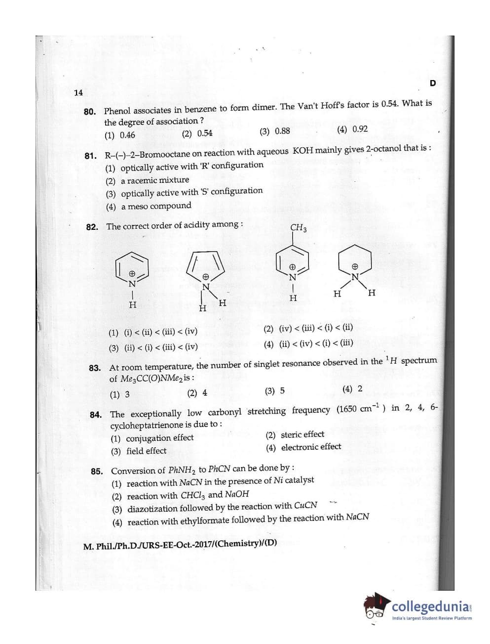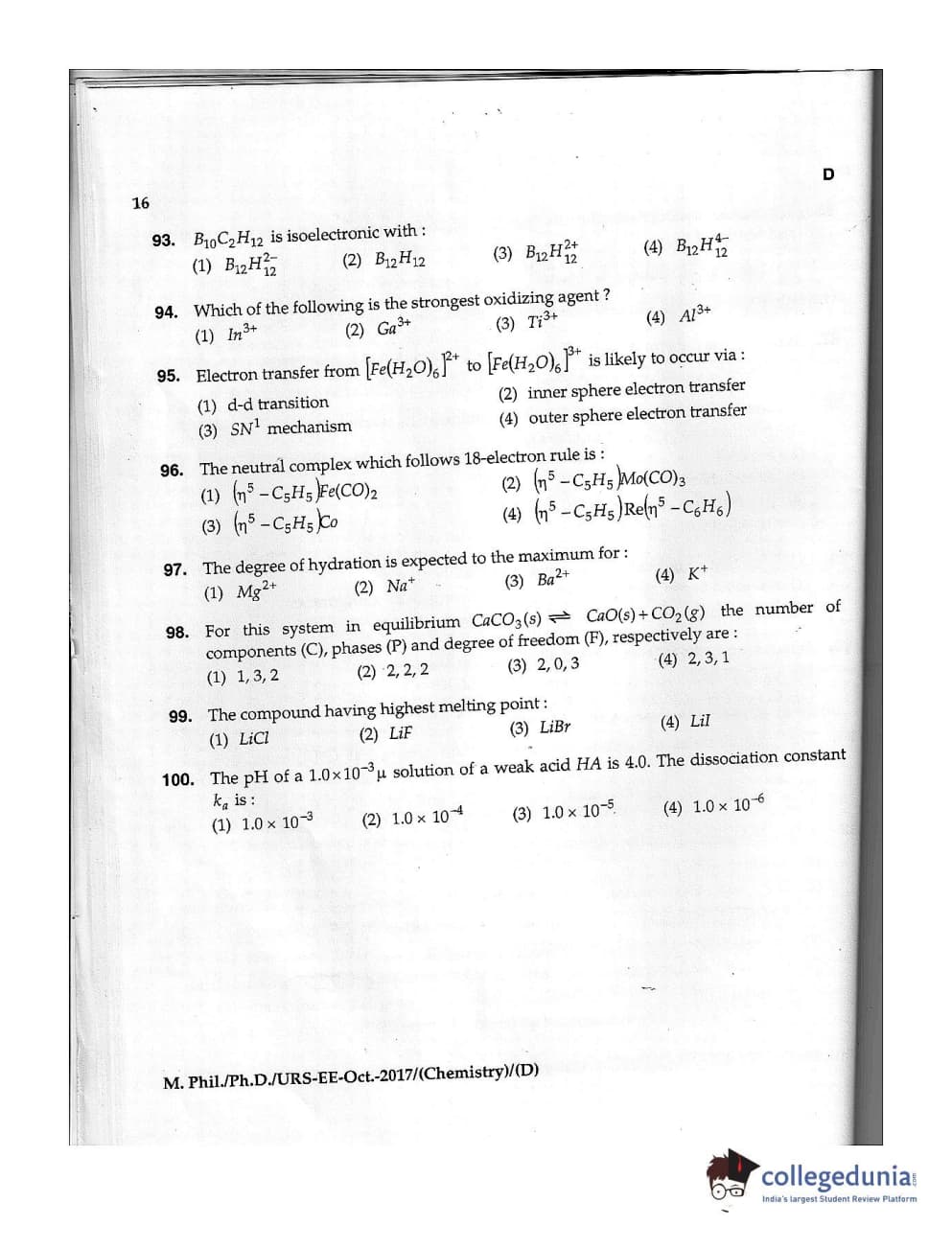 MDUCEE 2017 M.Phil./Ph.D./URS Chemistry Set D Question Paper with Answer Key PDFs