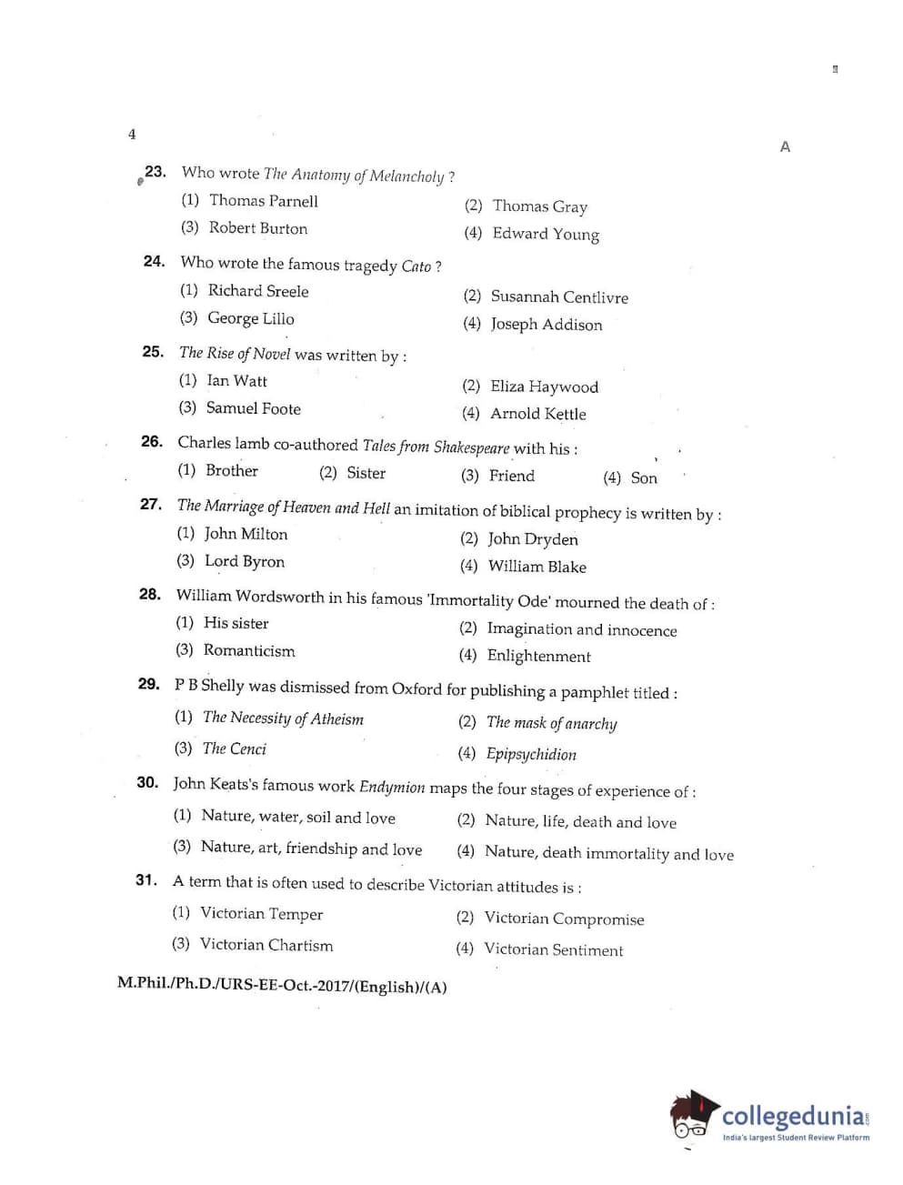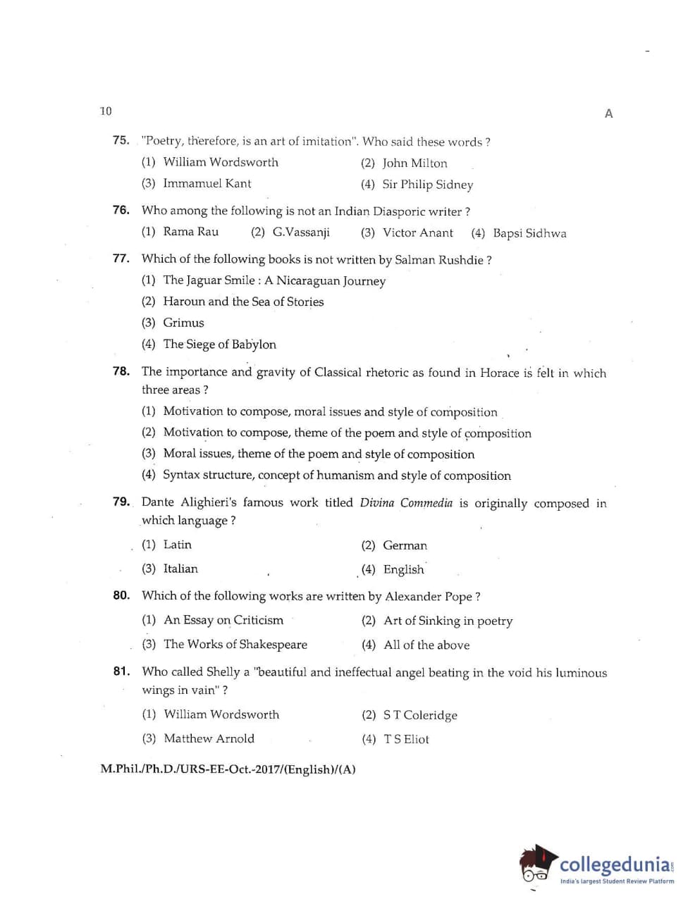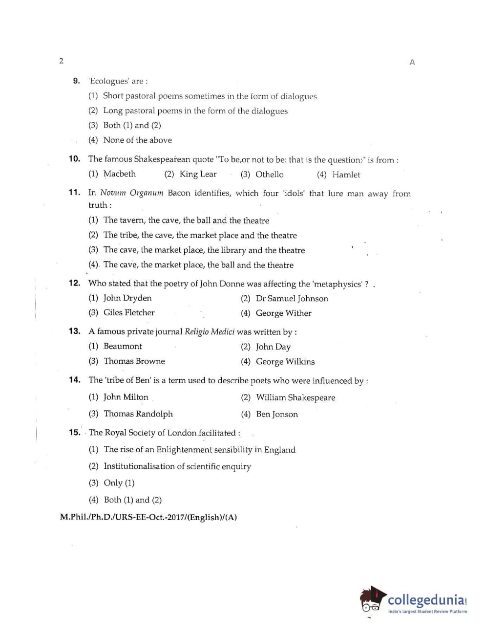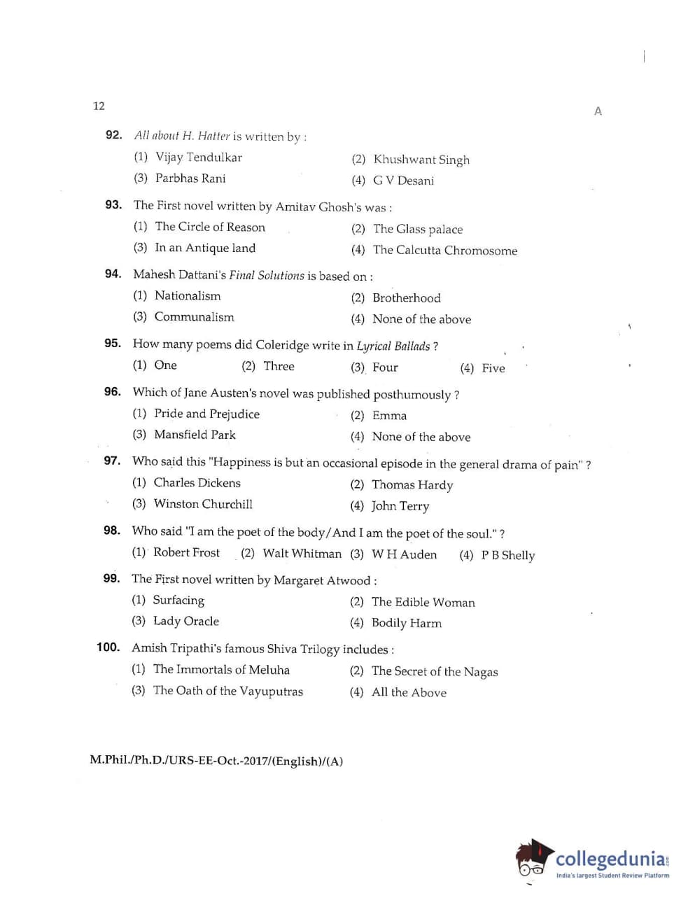 MDUCEE 2017 M.Phil./Ph.D./URS English Set A Question Paper with Answer Key PDFs