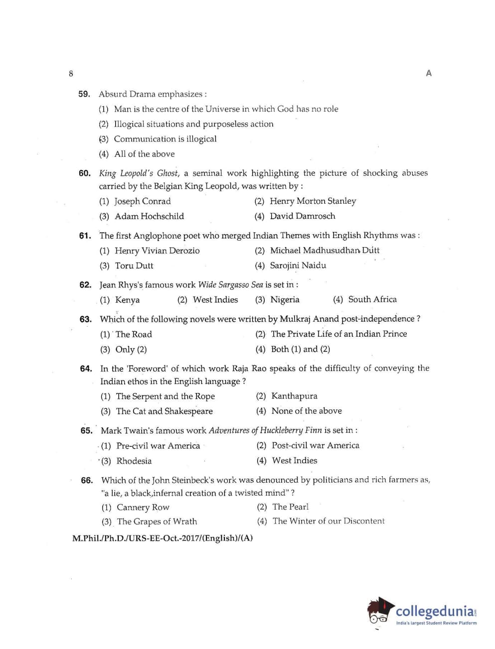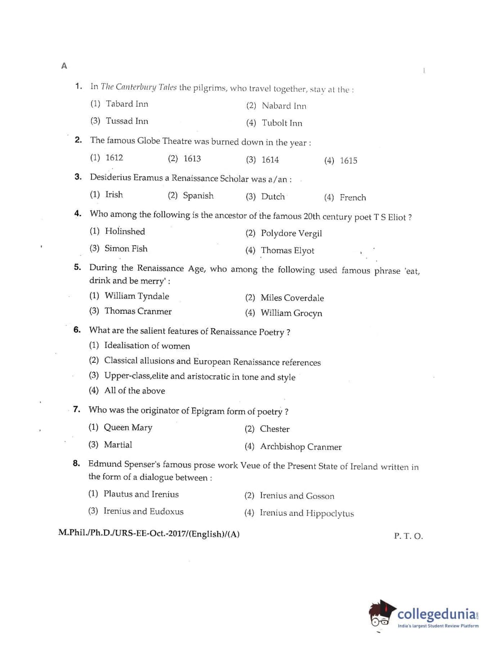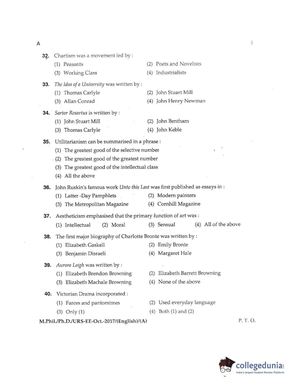 MDUCEE 2017 M.Phil./Ph.D./URS English Set A Question Paper with Answer Key PDFs