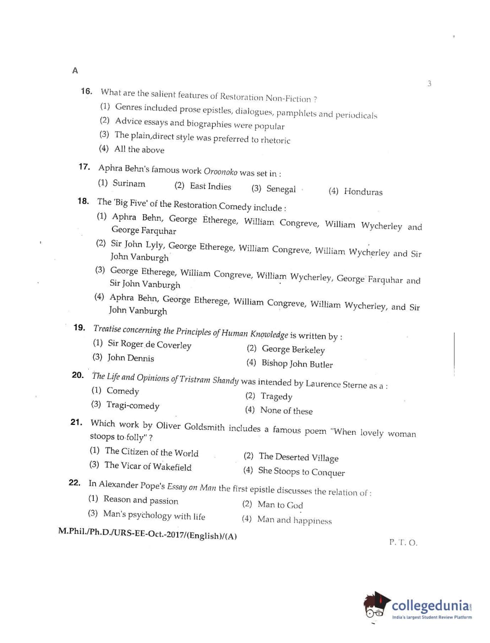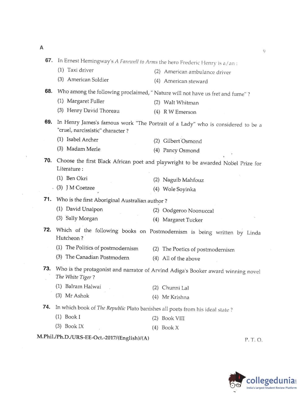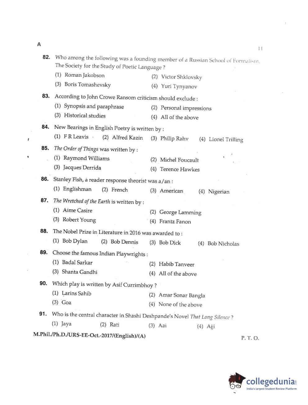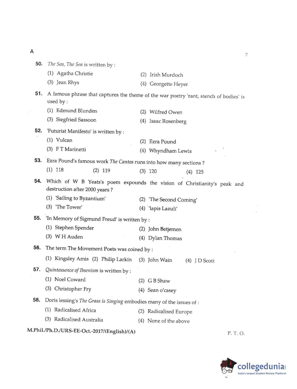 MDUCEE 2017 M.Phil./Ph.D./URS English Set A Question Paper with Answer Key PDFs