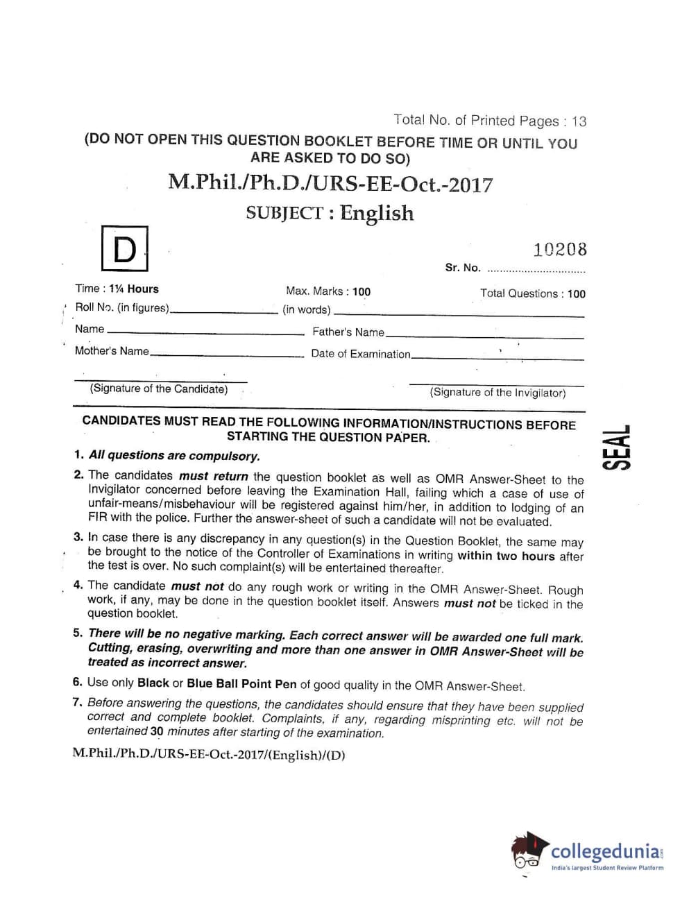 | MDUCEE 2017 M.Phil./Ph.D./URS English Set D Question Paper PDF | MDUCEE 2017 M.Phil./Ph.D./URS English Set D Answer Key PDF |