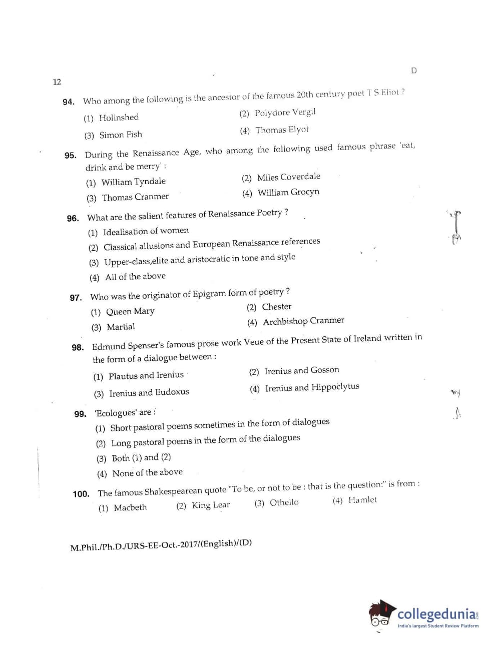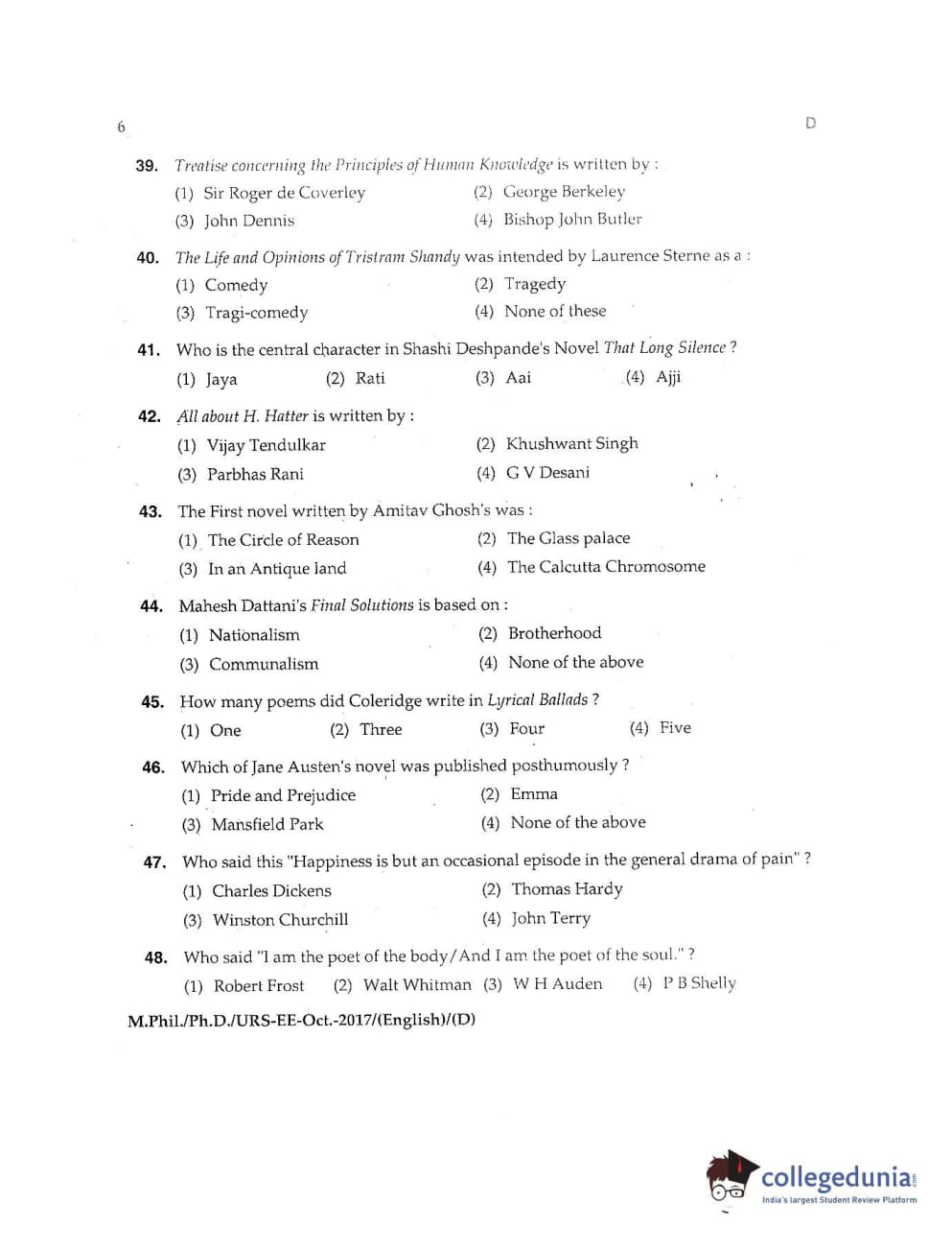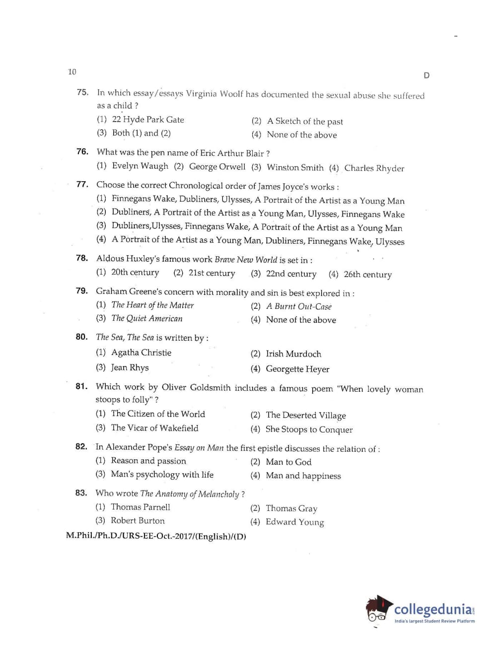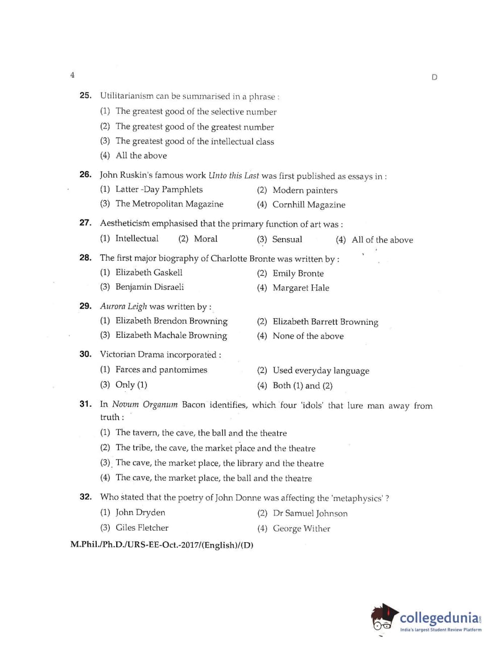 MDUCEE 2017 M.Phil./Ph.D./URS English Set D Question Paper with Answer Key PDFs