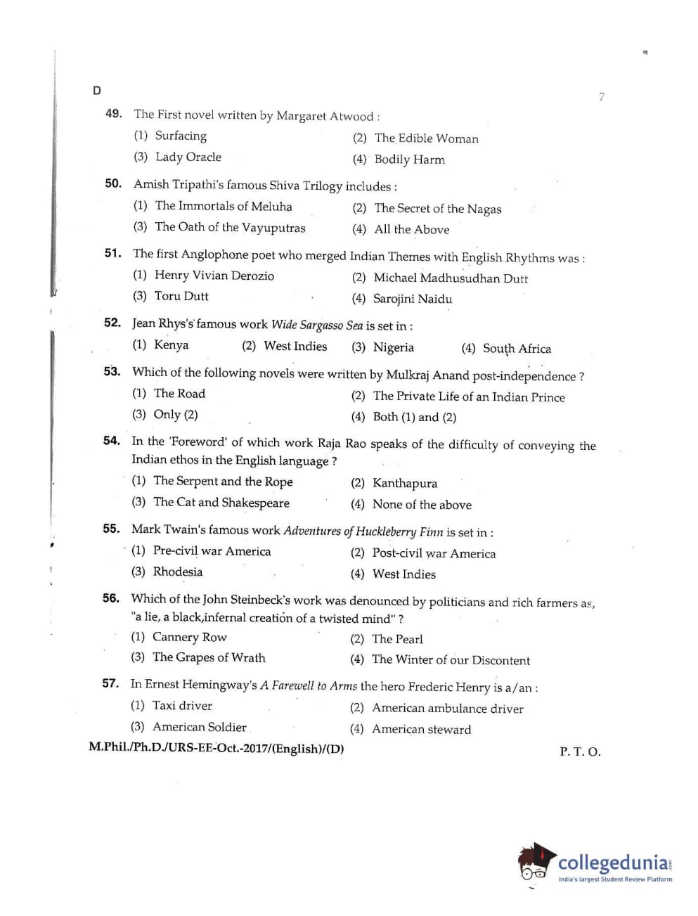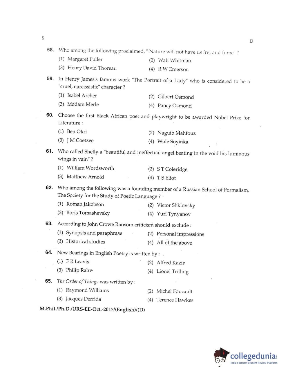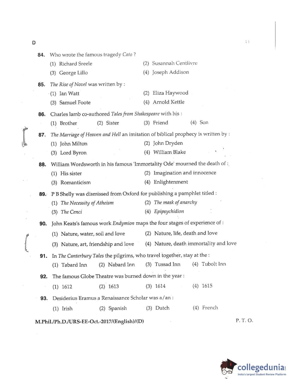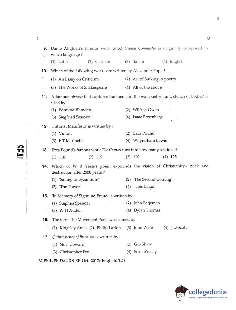 MDUCEE 2017 M.Phil./Ph.D./URS English Set D Question Paper with Answer Key PDFs